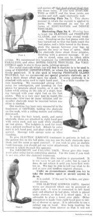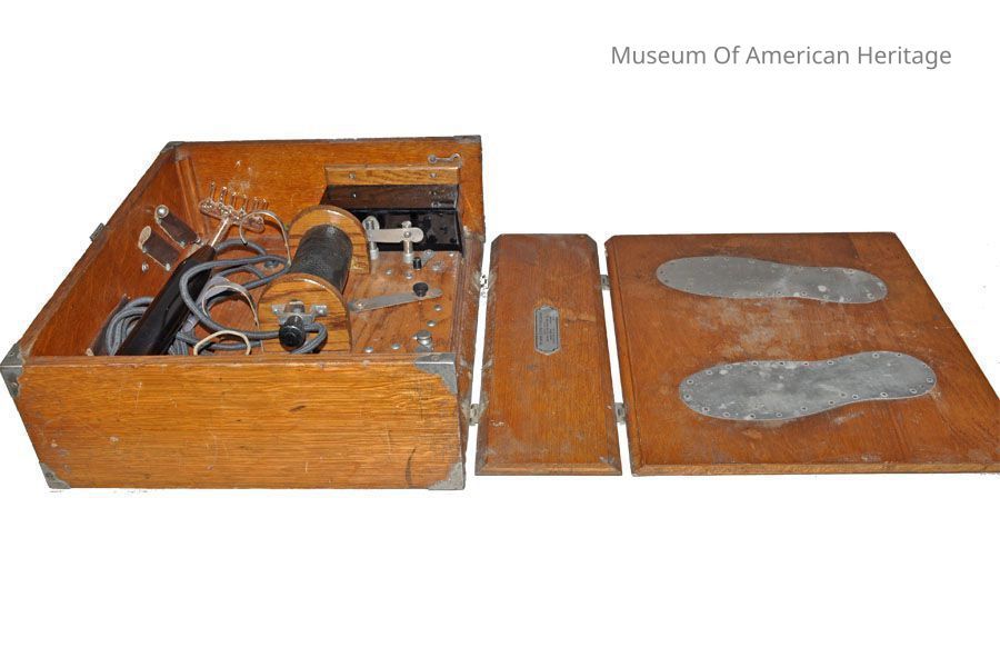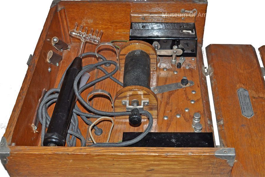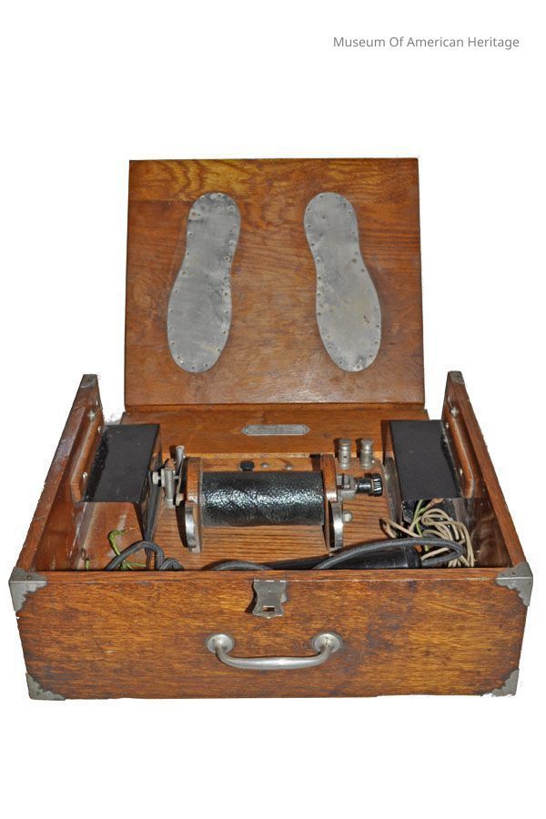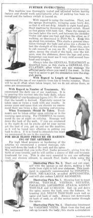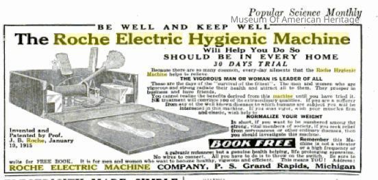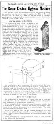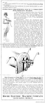 By passing an electrical current through the body, the Roche company claimed to be able to cure disease and resolve pain. Users of this machine attached a damp sponge to the hand-held wand and stood on the metal foot plates, moving the wand around the body to direct the current to the desired areas. Some versions included attachments for violet ray and ozone treatments.