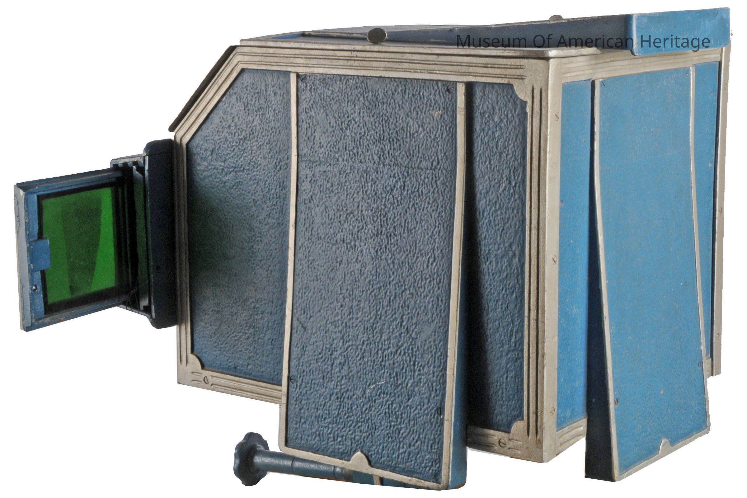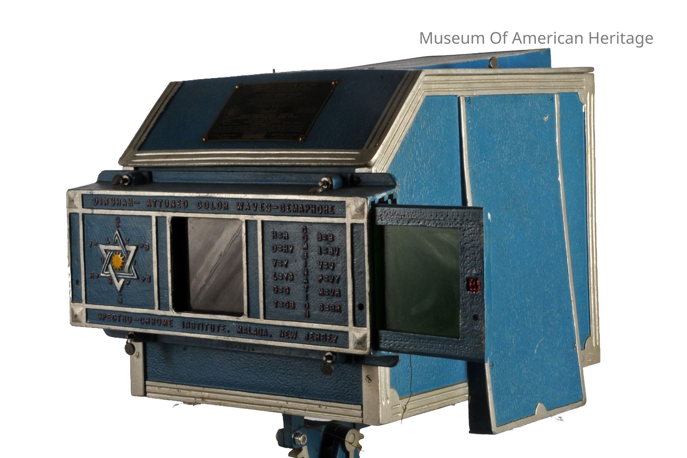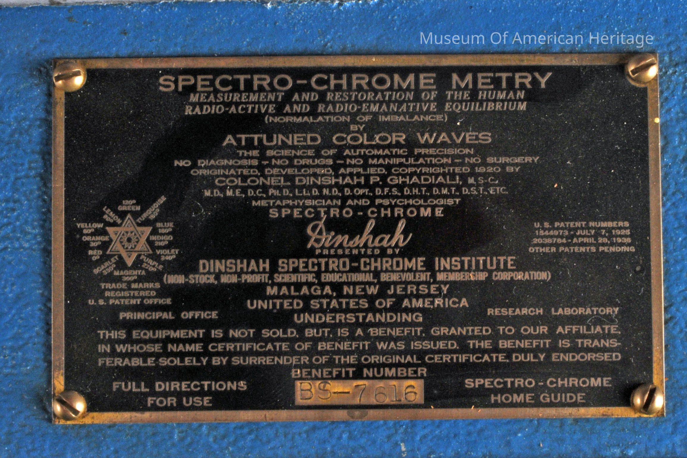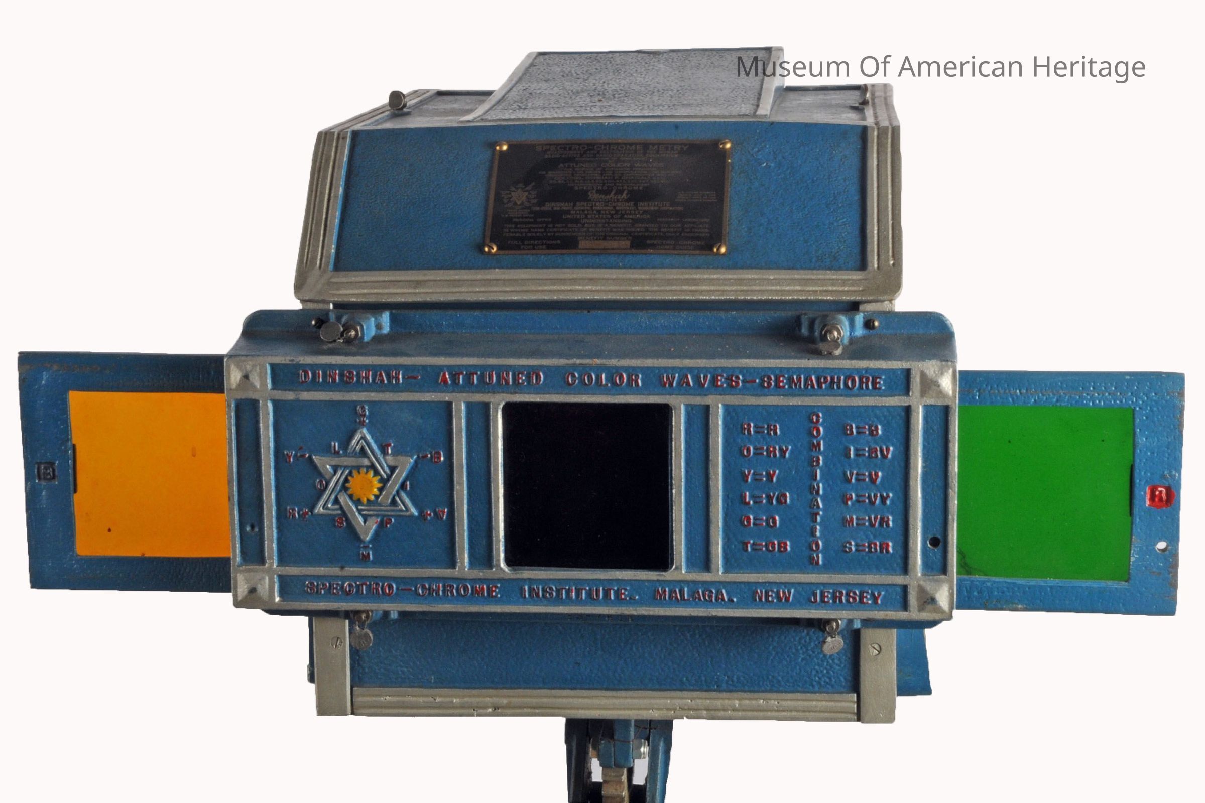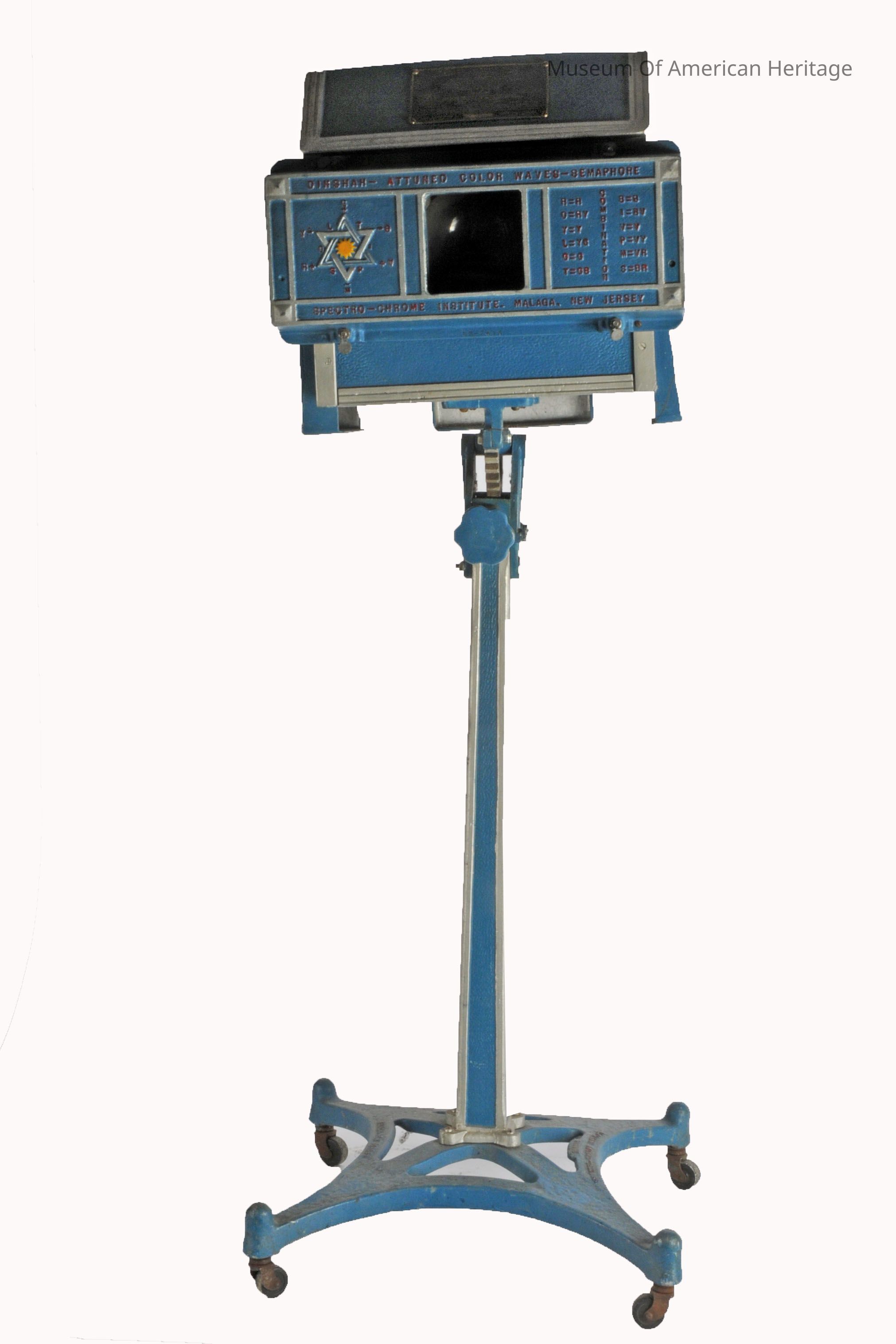 This visible light therapy device was created by Dinshah Pestanji Ghadiali, who claimed it could correct imbalances in the body by manipulating 12 colors of light. The cabinet contains a 1000-watt bulb, colored glass slides, 2 condenser lenses, a fan, and a water container for cooling. Ghadiali asserted that different colors of light could cure a variety of ailments, including severe burns, paralysis, blindness, and deafness.