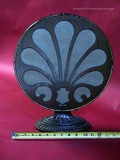 Metal and wood, textile front, wire mesh back (brass color), round.