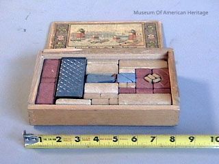 Stone, in wood box, sliding top, metal constructions (Bridge), American House, NY , Picture on inside box top. Made from 1880s to 1963. Albert Einstein played with Anchor Blocks as a child.
