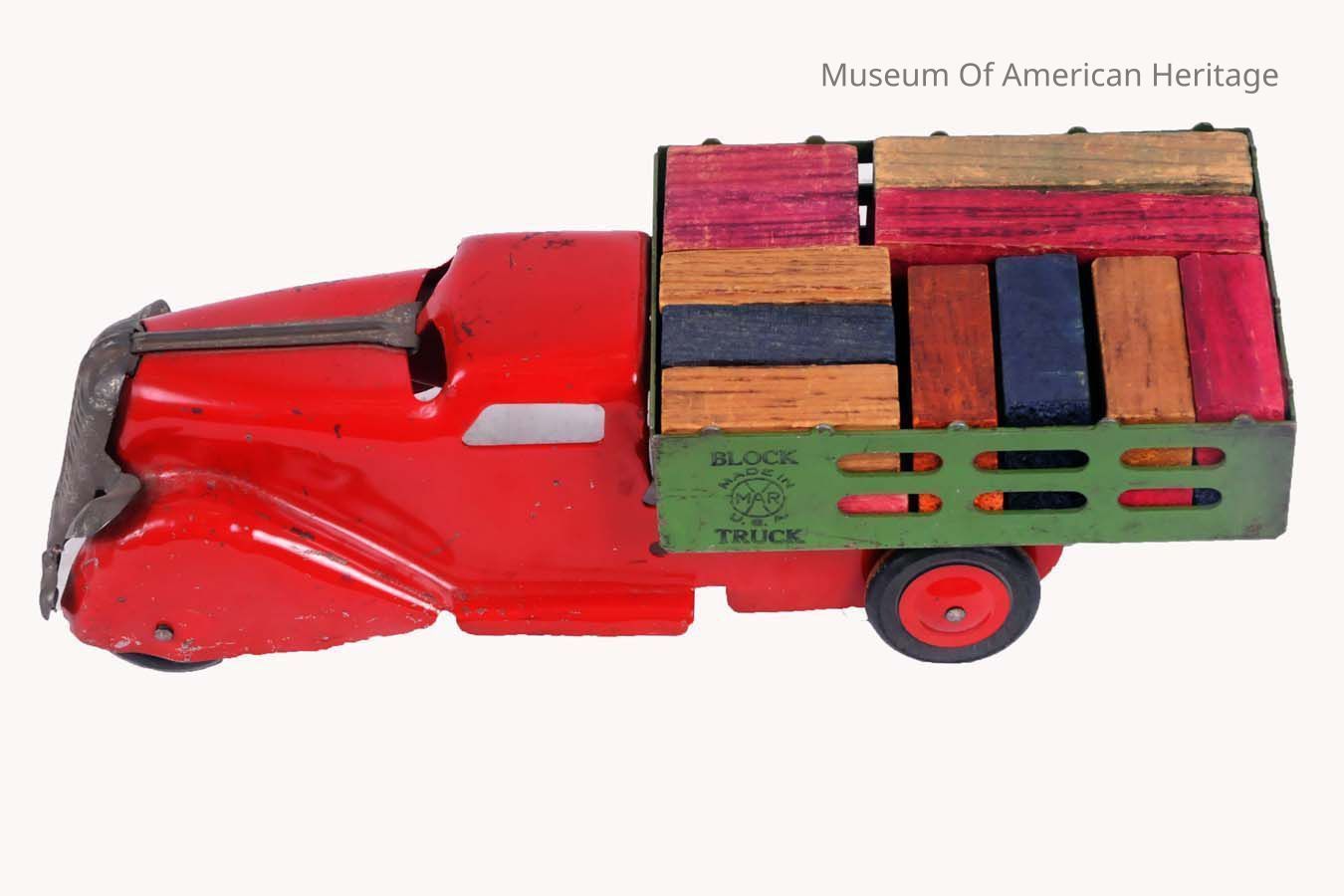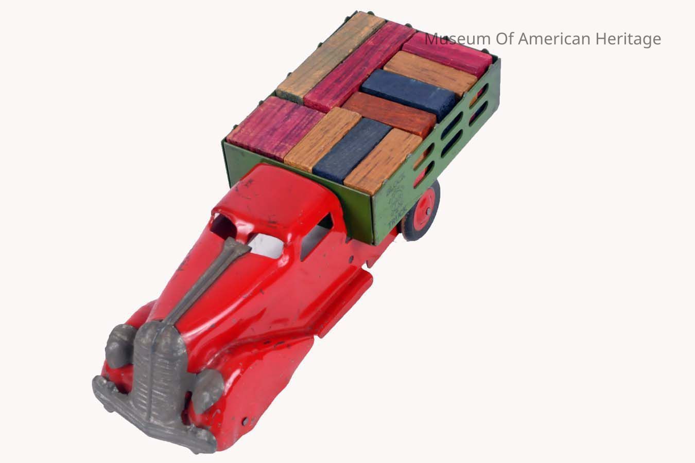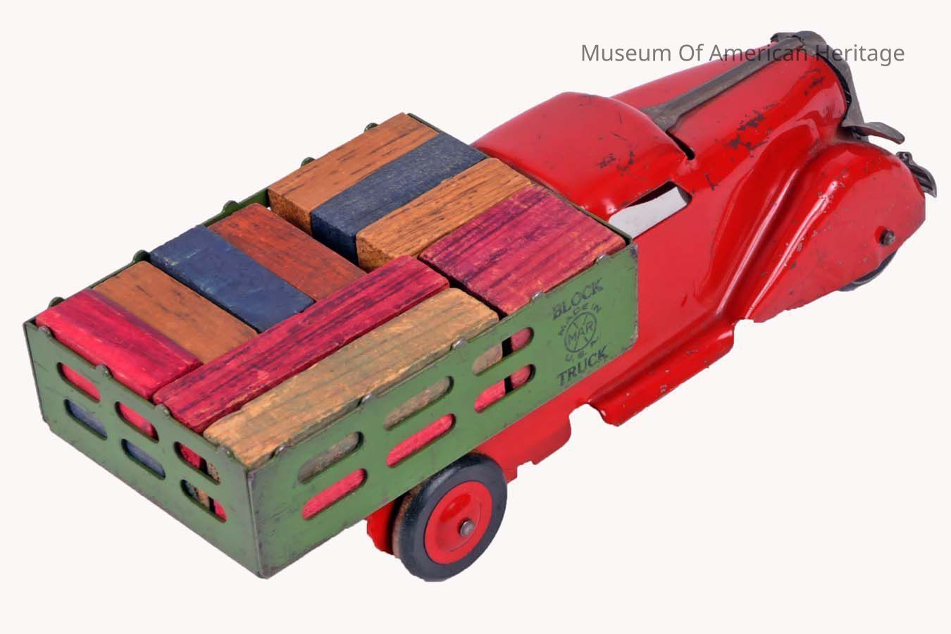 Pressed steel stake bed “Block Truck” made by Louis Marx & Company. Louis Marx and his brother David created Louis Marx & Company in 1919. The Marx brothers believed there were six qualities “needed for a successful toy: familiarity, surprise, skill, play value, comprehensibility and sturdiness.”