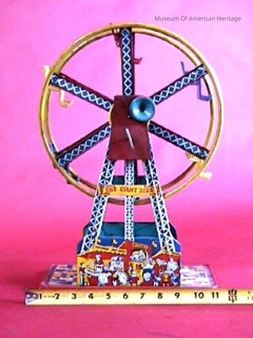 This red, yellow, and blue colored Ferris wheel is entitled “The Great Ride.” Made in 1950, the tin Ferris wheel stands at approximately 16 inches tall, 11 inches wide, and 5 inches deep. The toy depicts vibrant illustrations of a ticket seller, carnival goers, and hot-dog, popcorn, and soft drink stands. The Ferris wheel has a wind-up motor that spins it around.