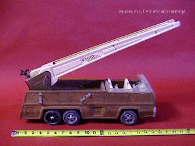 Tonka Toys built a variety of fire trucks starting in 1954. Early fire trucks were labeled MFD for Mound Fire Department. This fire engine is made from metal and has plastic wheels.