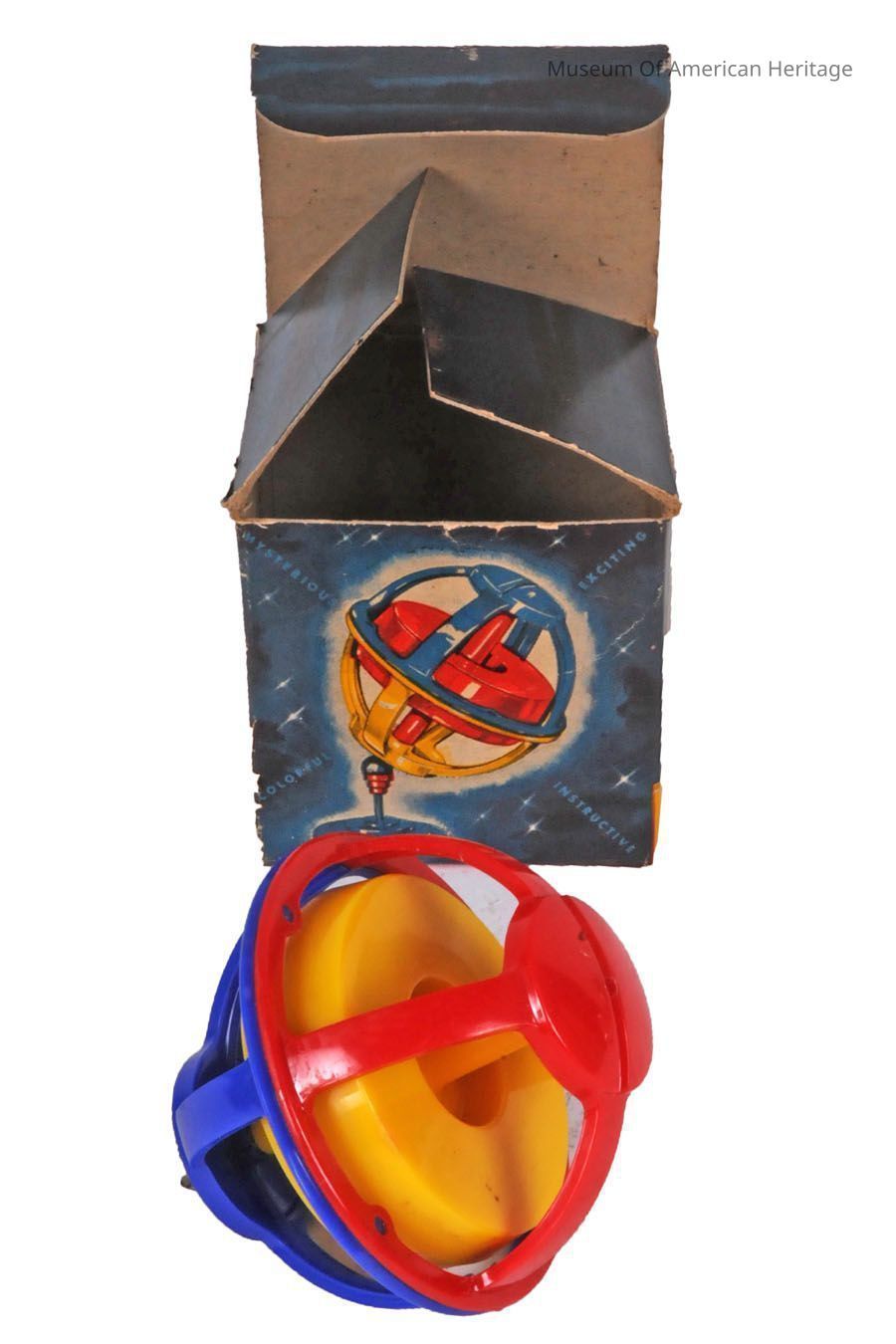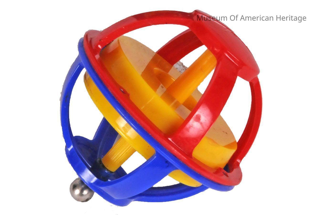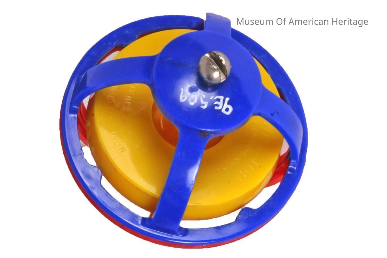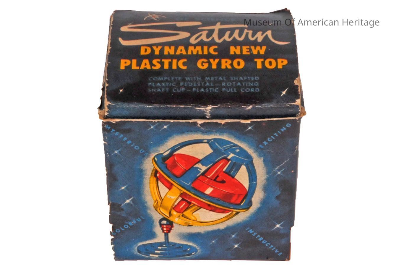 While plastic is common-place in toys today, it didn’t start being used to make toys until after World War II. This Gyro Top Toy would have been one of the first models to use plastic rather than being constructed entirely of metal. Gyro Tops include a stand and cup that hold the top and a pull cord to start the top spinning. Gyro Tops spin at any angle once started by using the included cord to generate rotational force. Both plastic and metal Gyro Tops can still be bought today and continue to be popular toys.