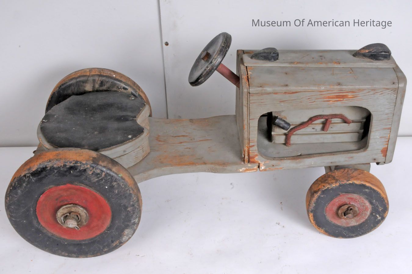 Non-operational steering wheel, place to sit. A: tractor B: cart Made by Jim Adams at 13 years old.