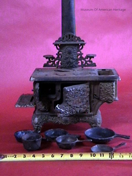 Cast metal, chimney, side extension, 6 lids, hinged doors, 6 utensils. possibly based on US patent 38,811 for toy stoves