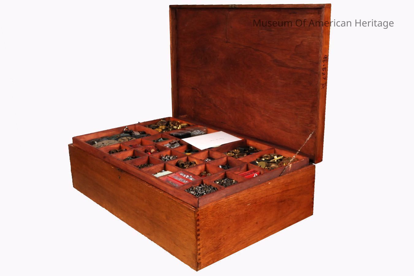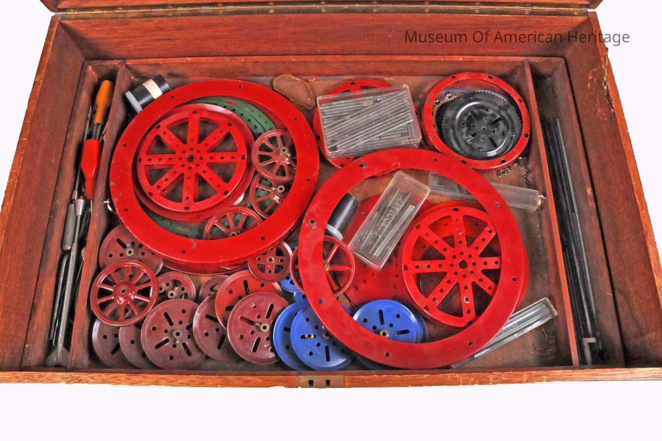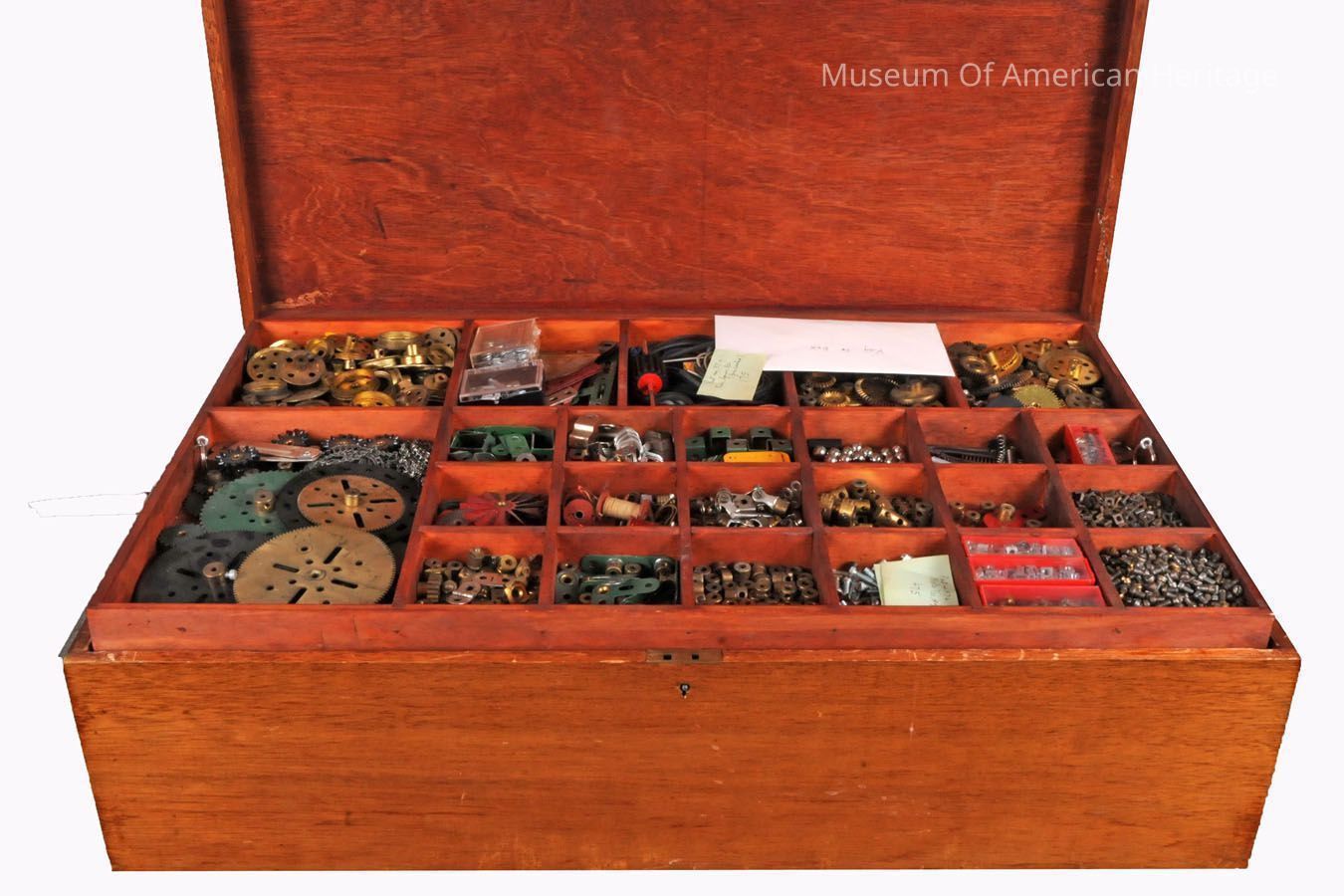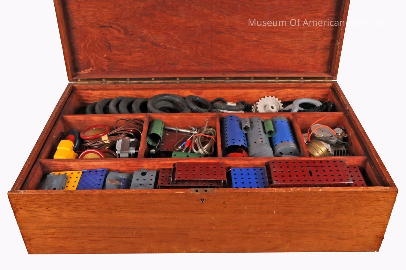 Custom made wooden box with wide variety of Meccano parts.