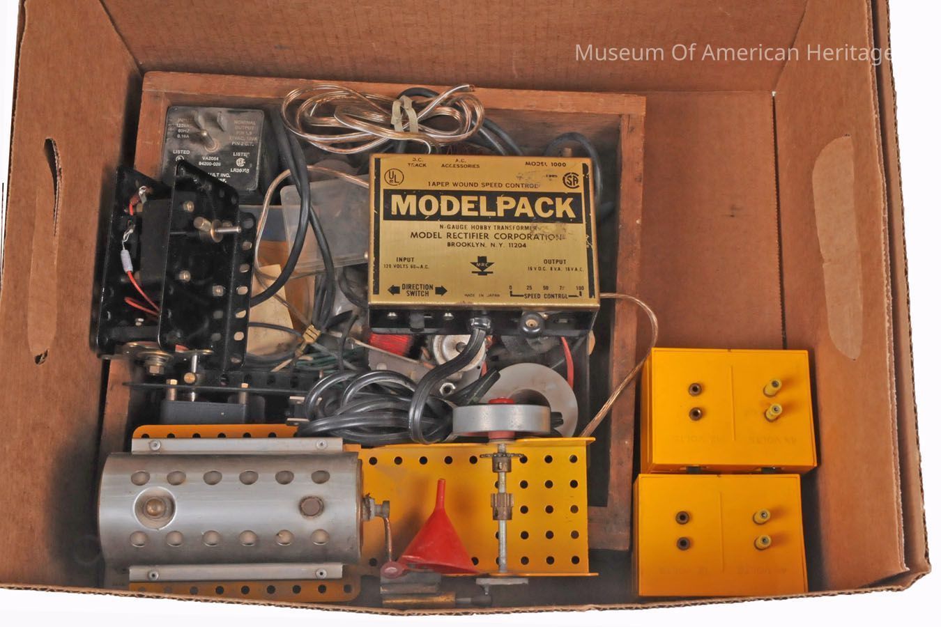 Separate box with Meccano motors, transformer and steam engine.