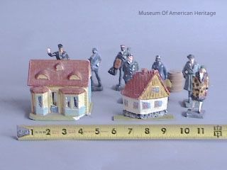 Houses, figures, etc., man, woman, policeman, redcap, stationmaster, porter, oiler, suitcase, barrel, made of clay like material.