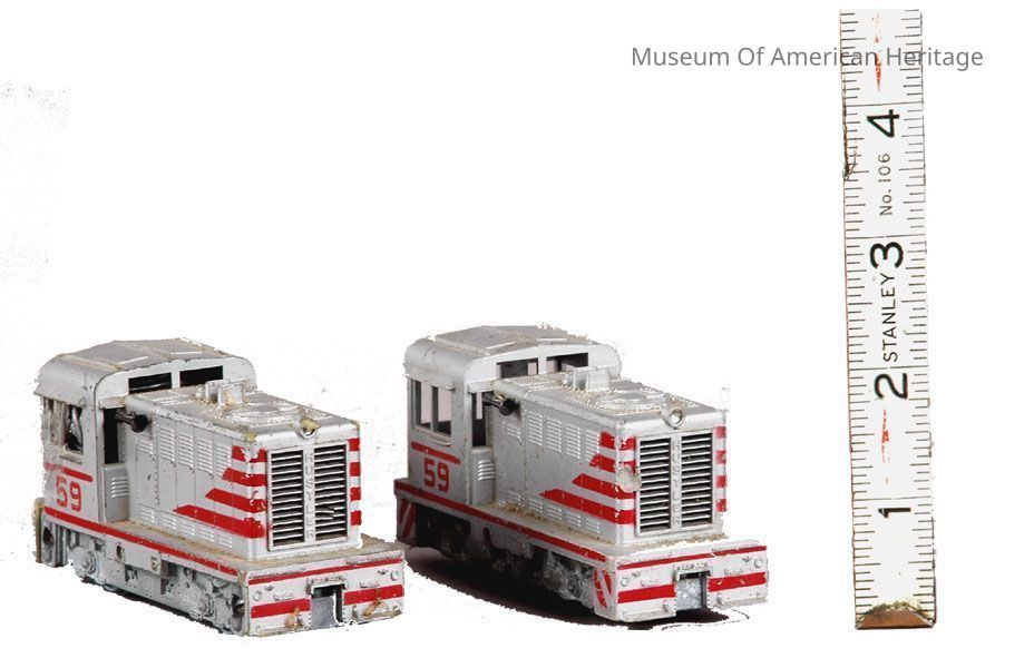 Electric, rubber band drive, HO gauge, #59, two locomotives. Similar models were made in other colors and railroad names with model numbers 2991 to 2997.