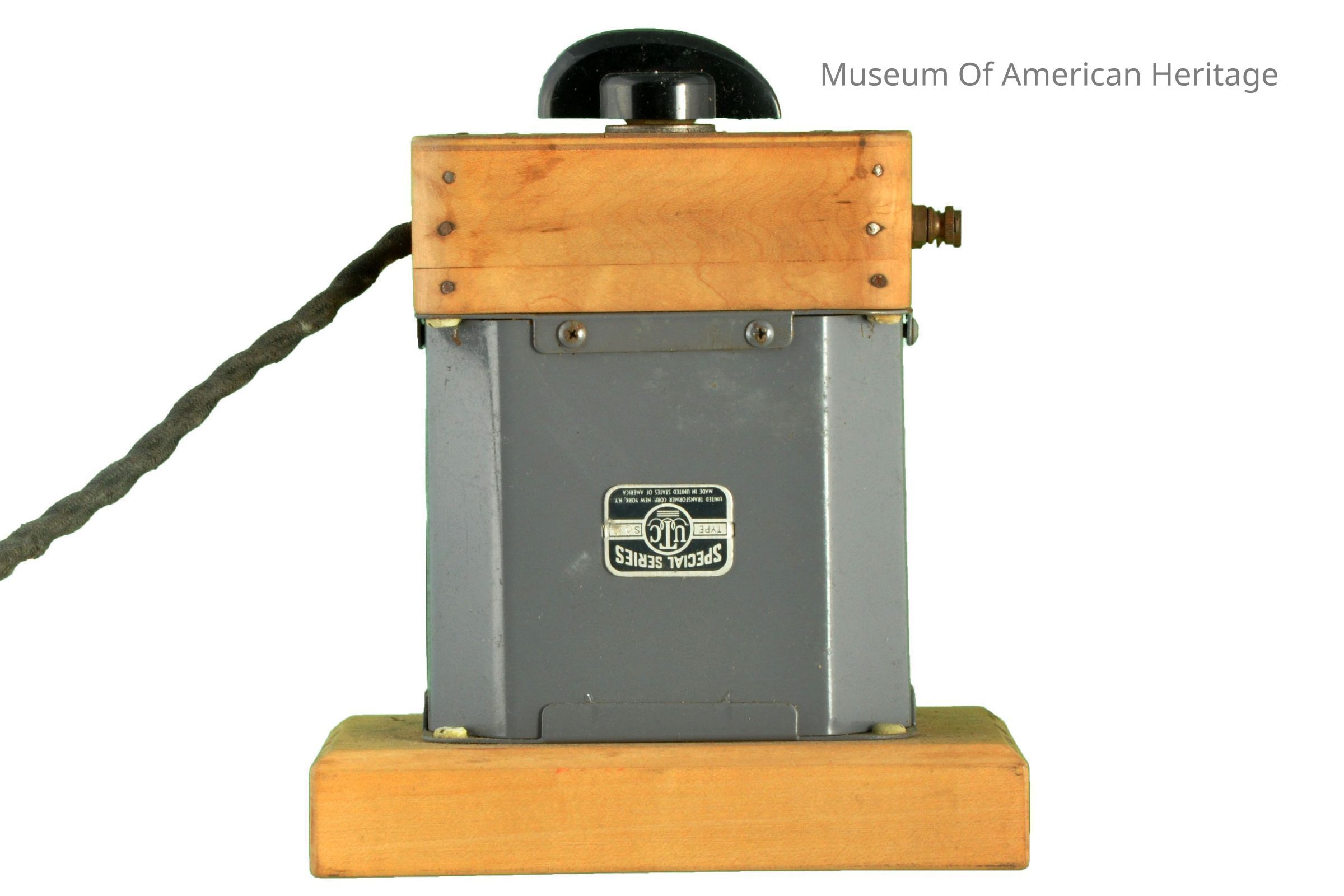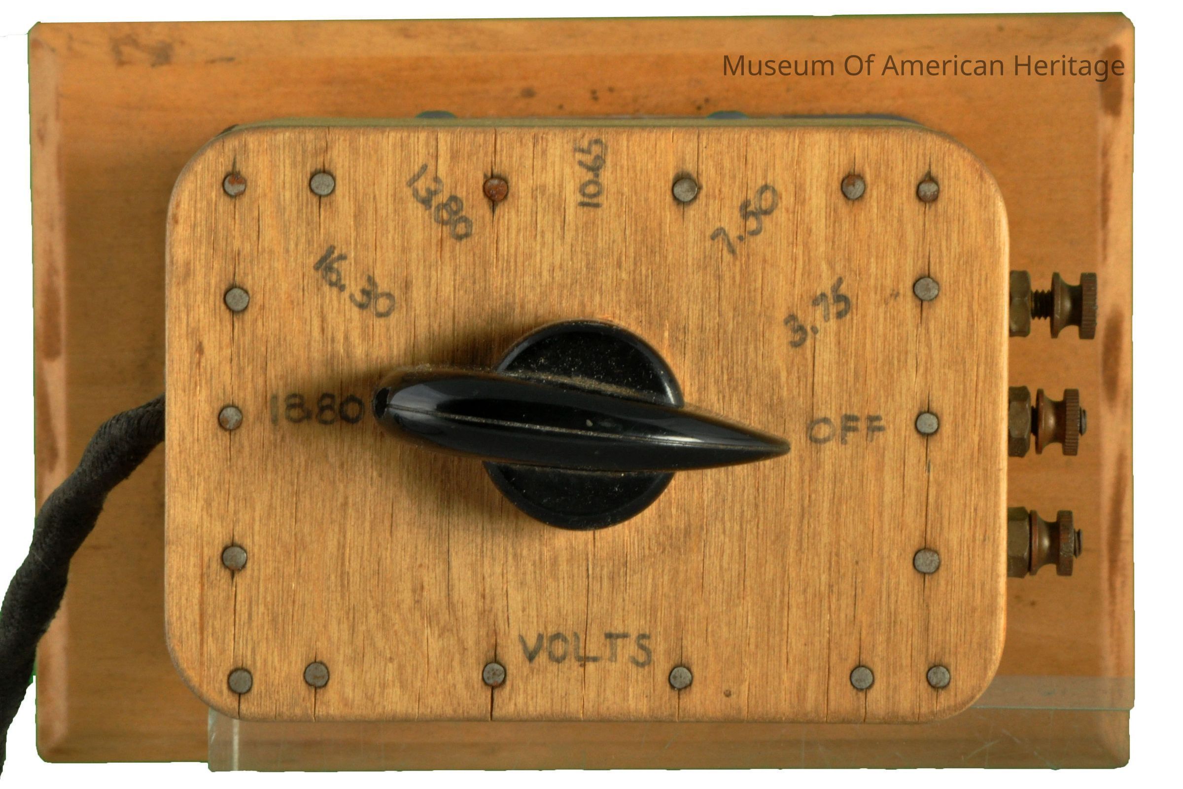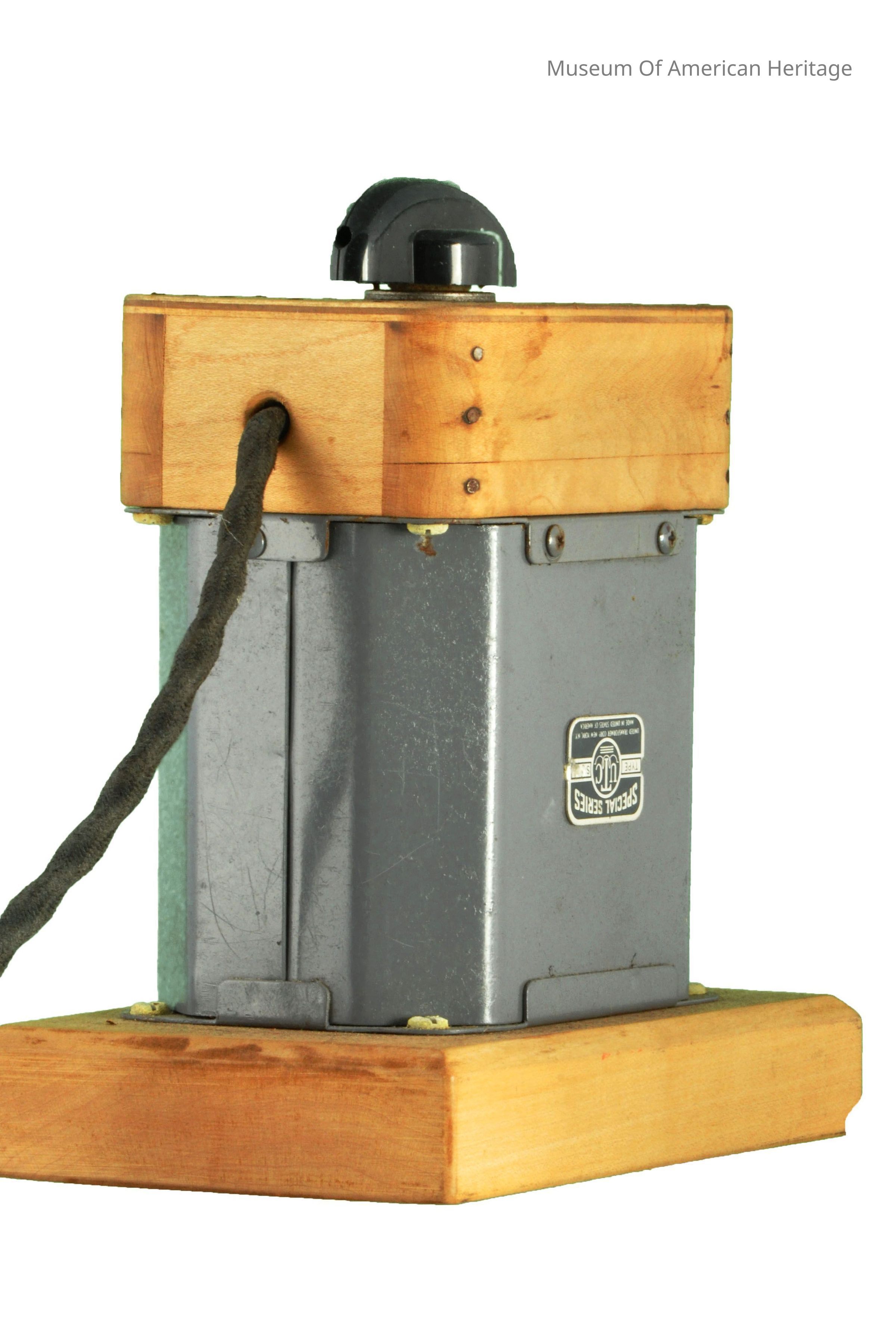 UTC logo, wood base & top, on/off/voltage variable dial on top, cloth electrical cord, three electrical connections on side.