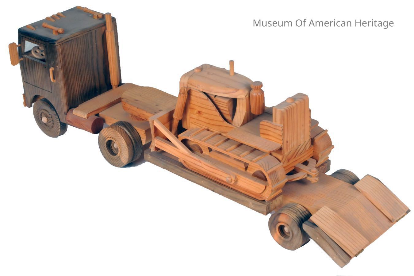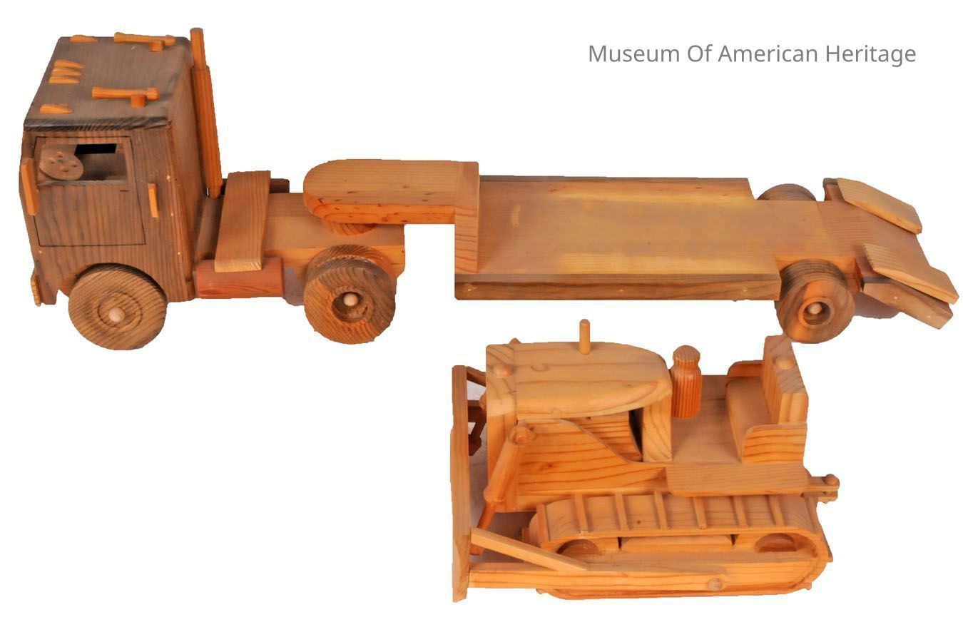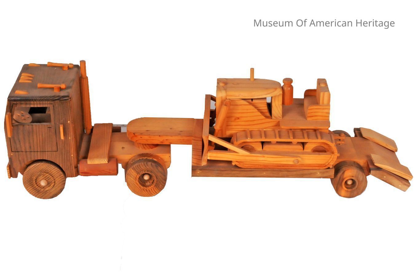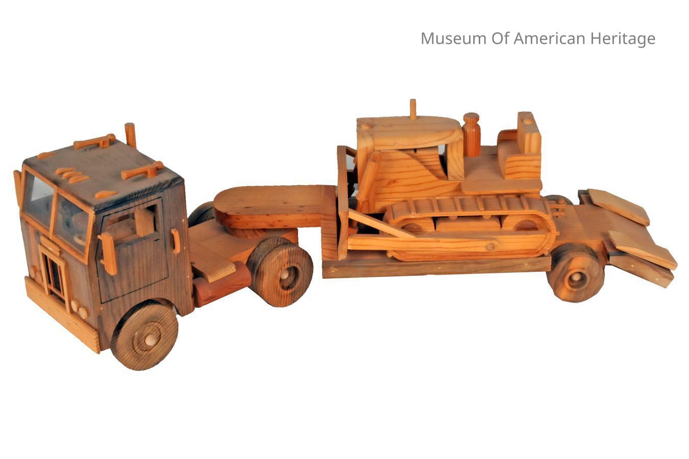 Hand made toy flatbed truck with bulldozer on bed.