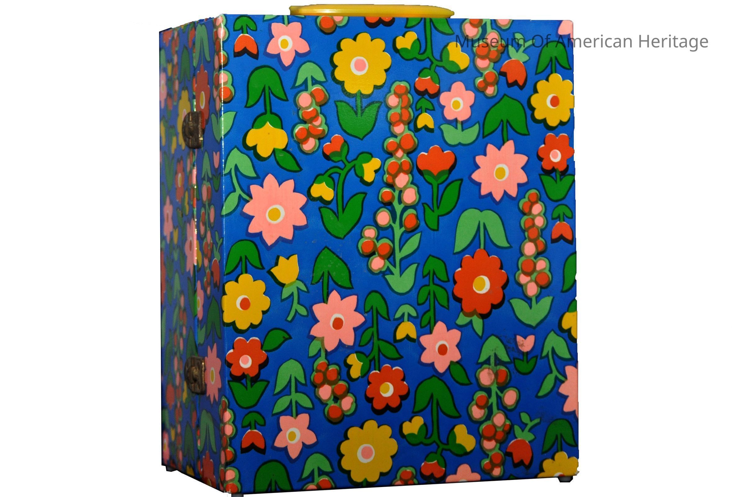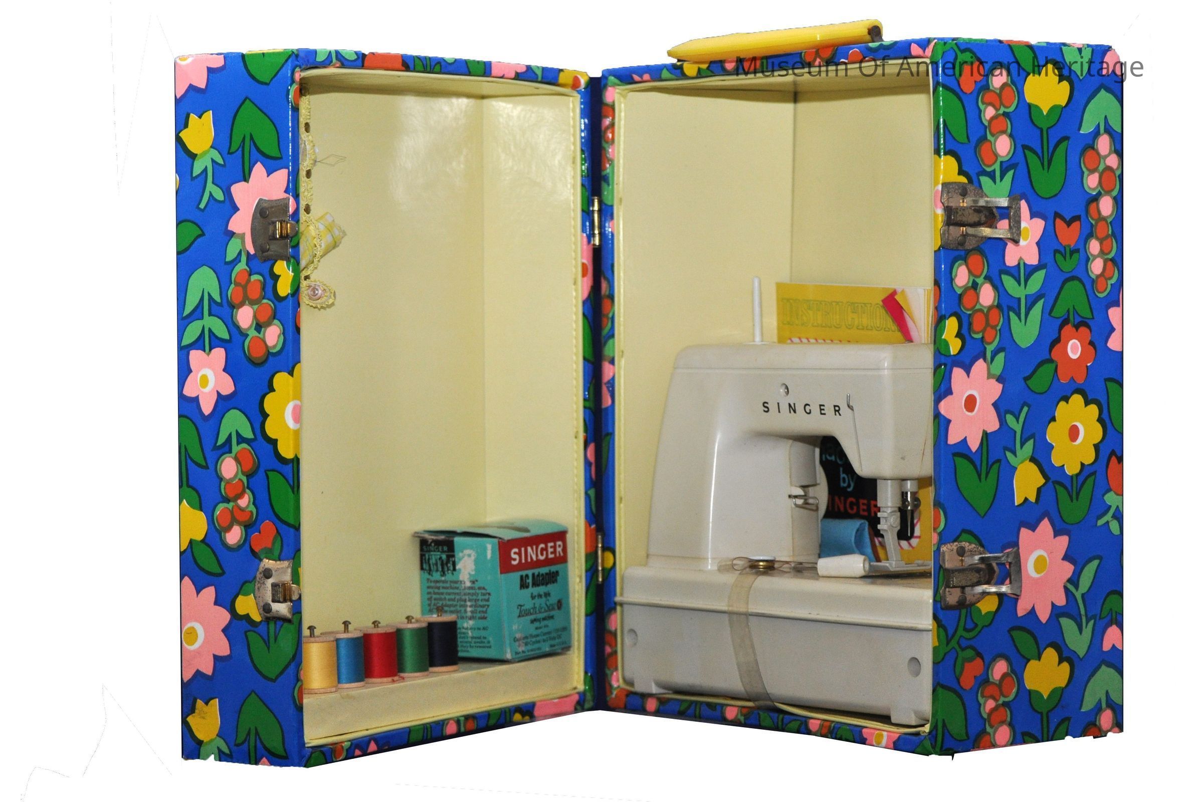 Uses 4 D cell batteries, AC adaptor, in floral design suitcase w/ yellow handle, 5 spools of thread.