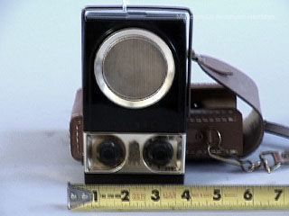 In leather carrying case, small, portable, operating guide, transistor, battery operated.
