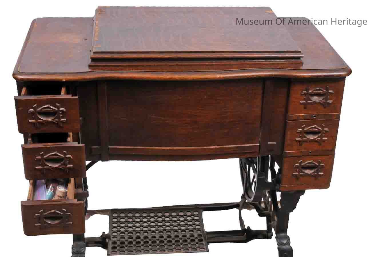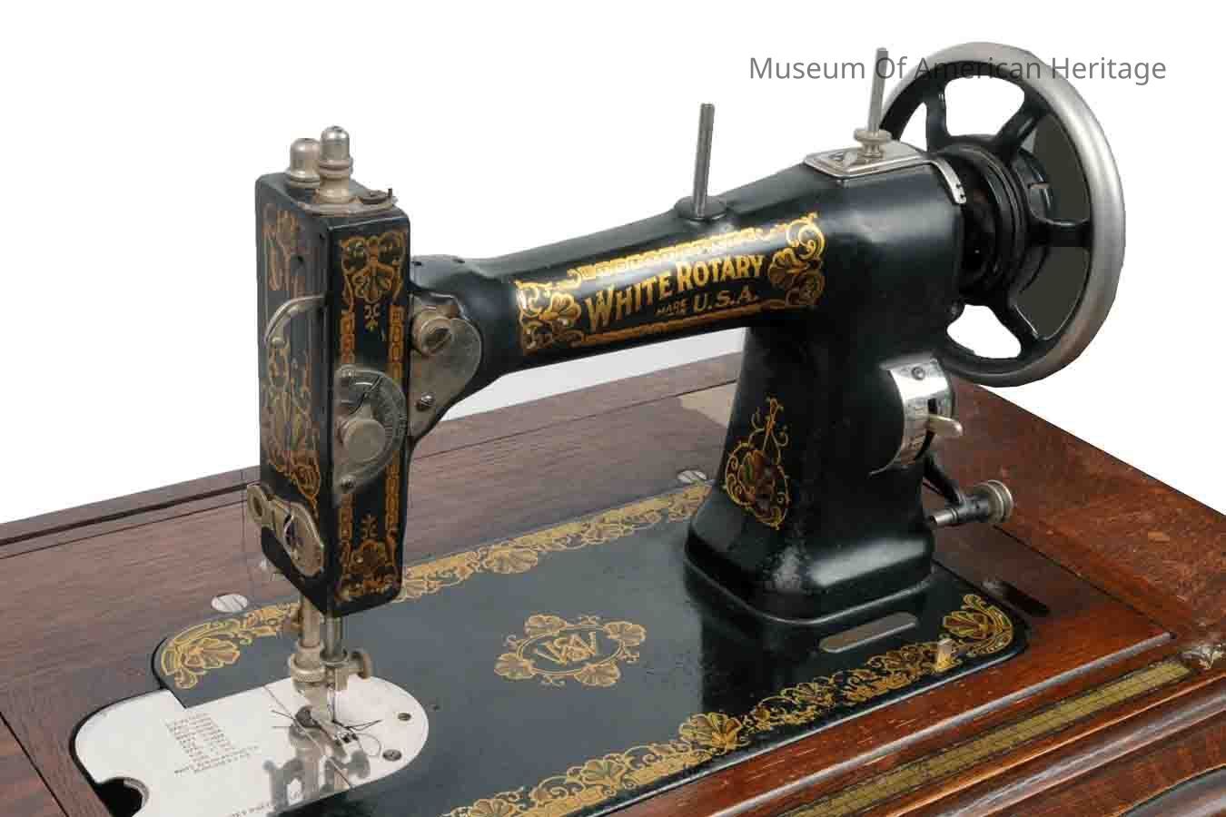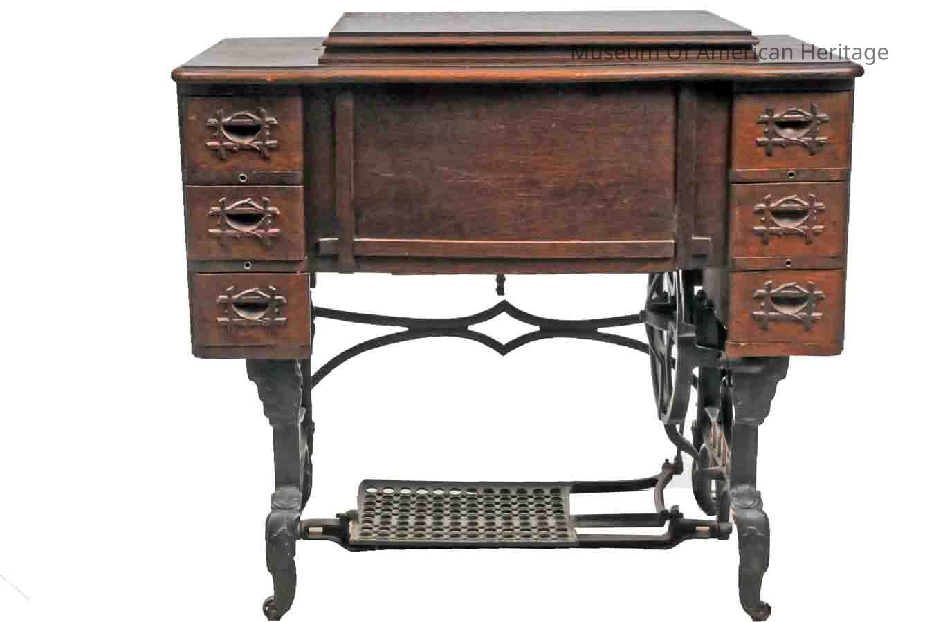 First Pat d 4/10/1900, use white F.R. needles only, comes w/instructions, original check, warranty, 8 pieces of paper (in artifact manual drawer), treadle, needs to be kept well oiled, fitted w/ball bearings to reduce friction.