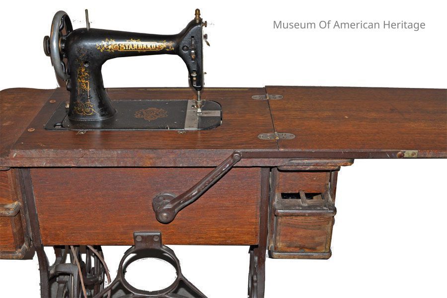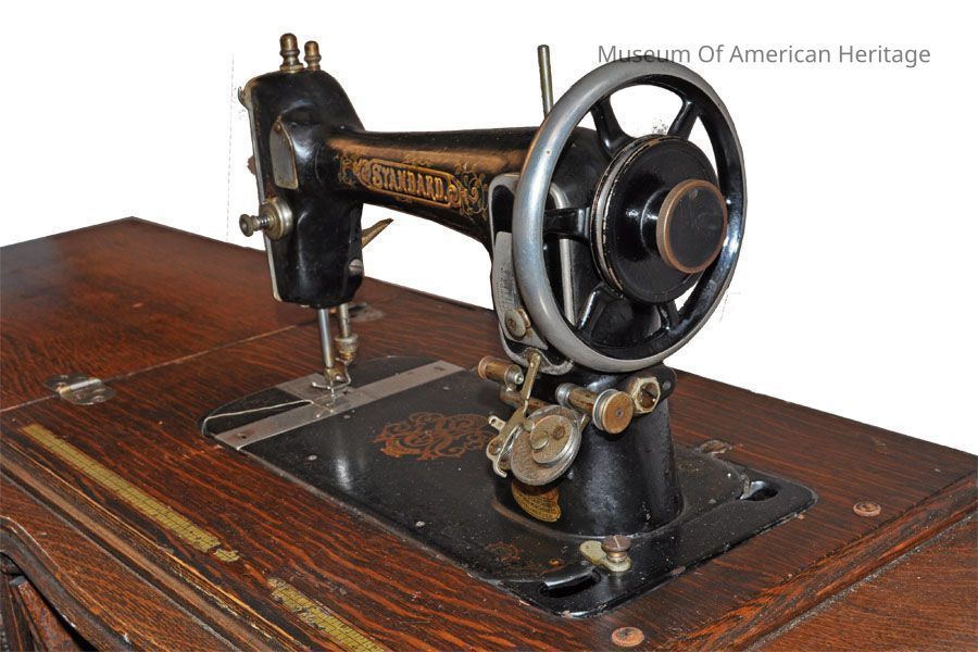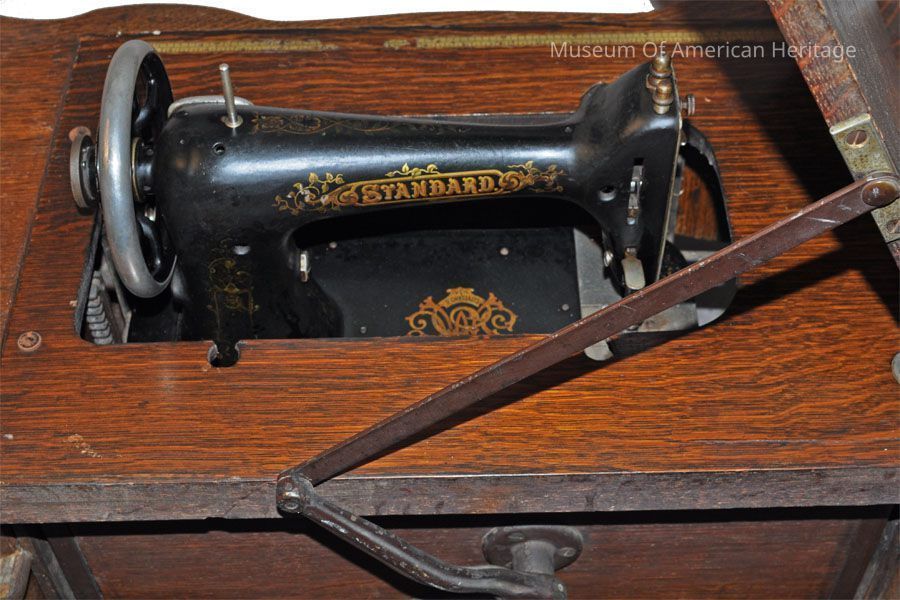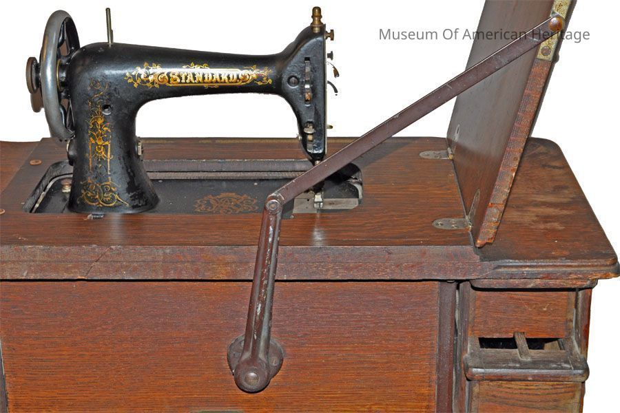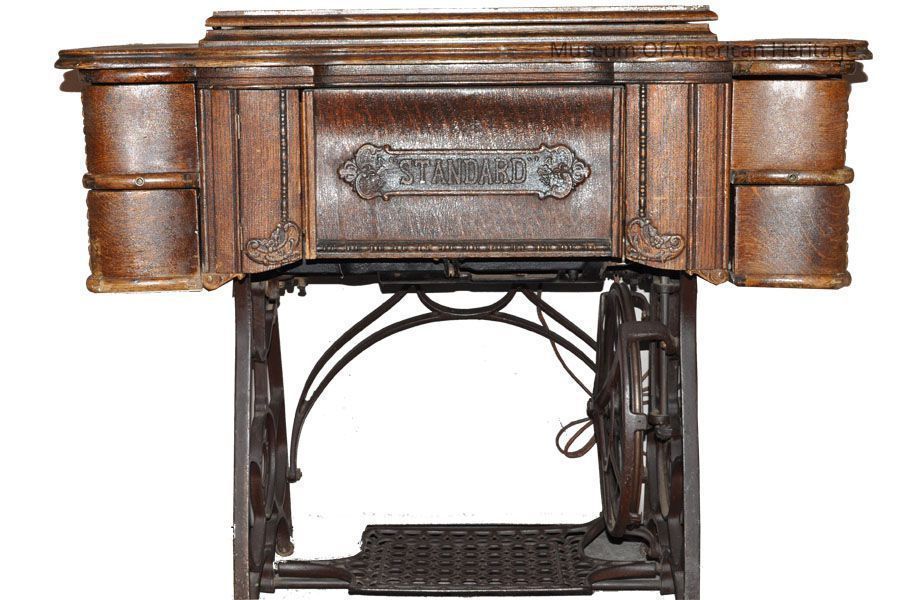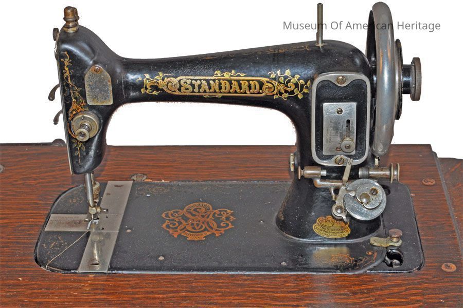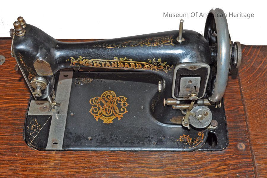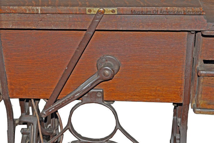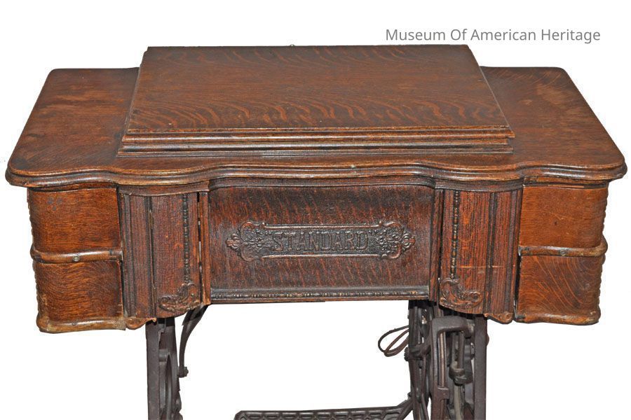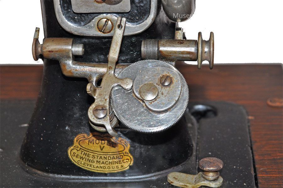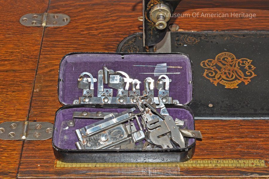 Unique scissors mechanism for lifting machine straight up/down rather than typical tilt, raised name on front of cabinet, tin case containing numerous attachments.