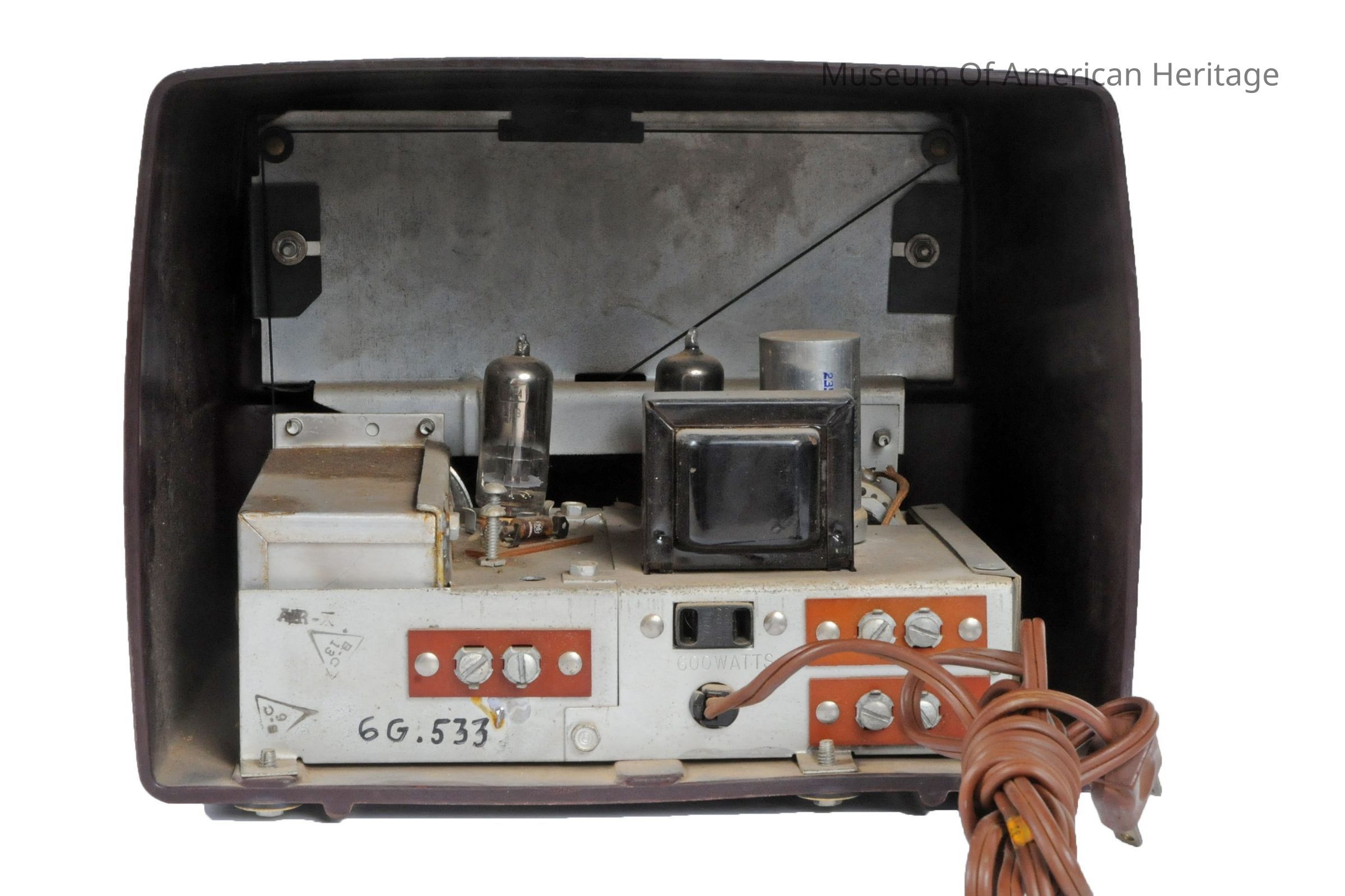 2 vacuum tubes. Superheterodyne, 117v ac, converts US UHF channels to VHF channels 5 or 6. Available under other brand names.