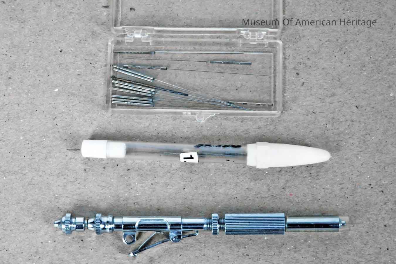 This device is a spring-loaded needle probe. It features adjustable penetration depth and an assortment of needles. It may have been used for biopsies.General Notes