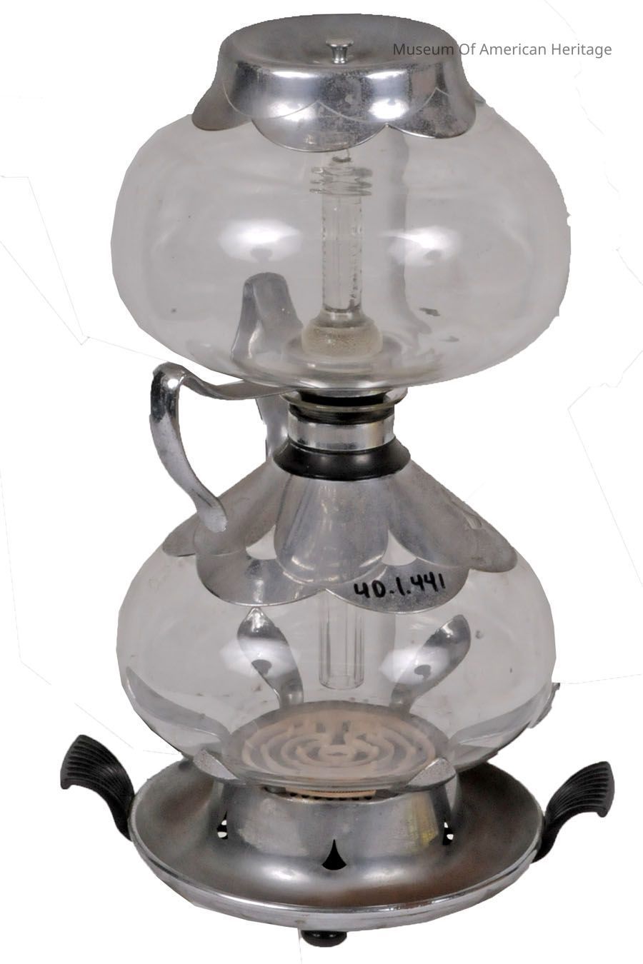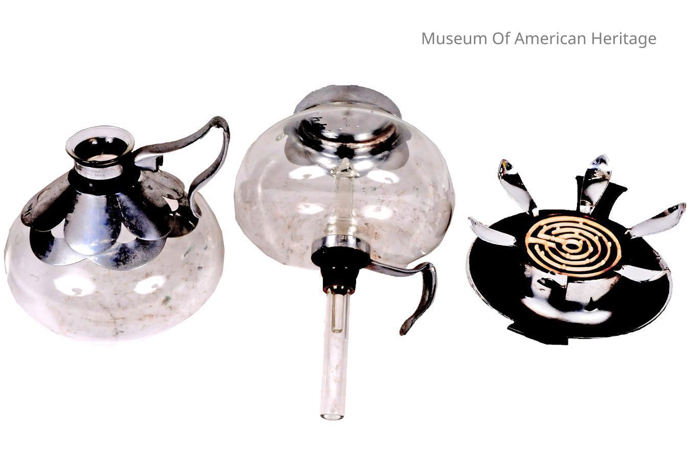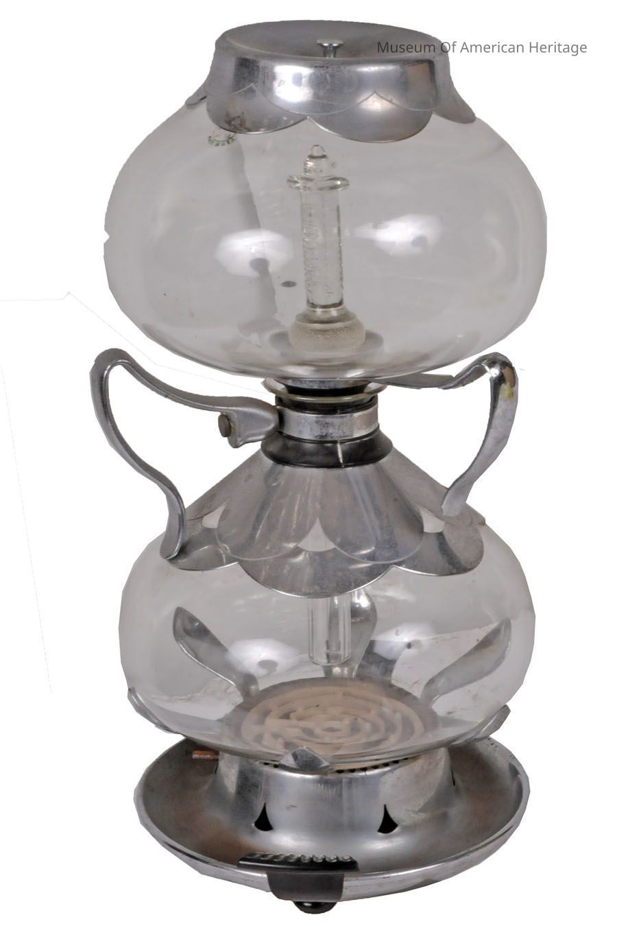 Also known as a siphon coffee maker, this brews coffee by having the heated water vapor from the lower chamber pushing up into the upper chamber. The hot water vapor mixes with the coffee grounds and then as it cools slightly, the hot coffee liquid drips back down into the lower serving pot. This process was invented (using flame) 100 years before this electrically heated one was manufactured.