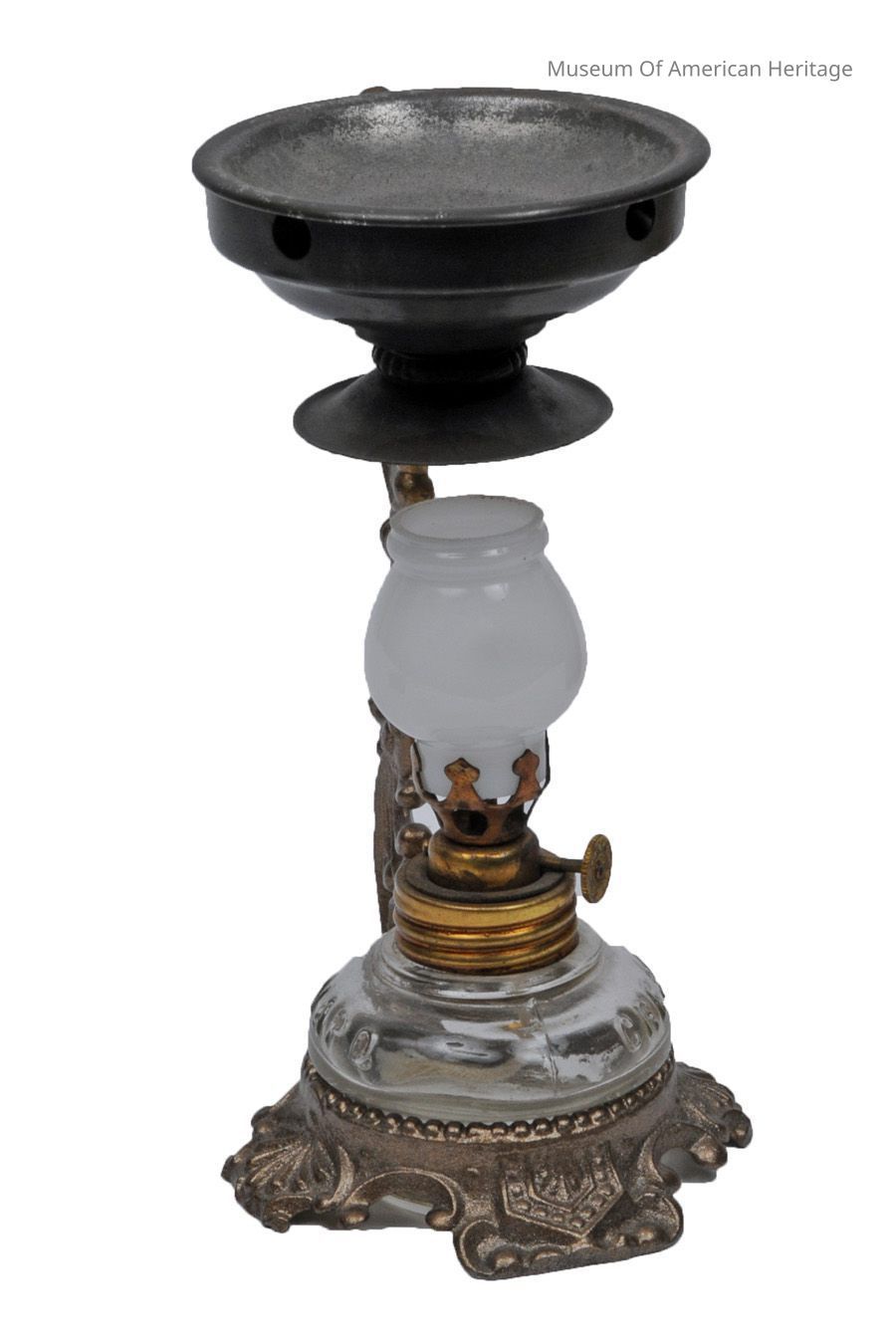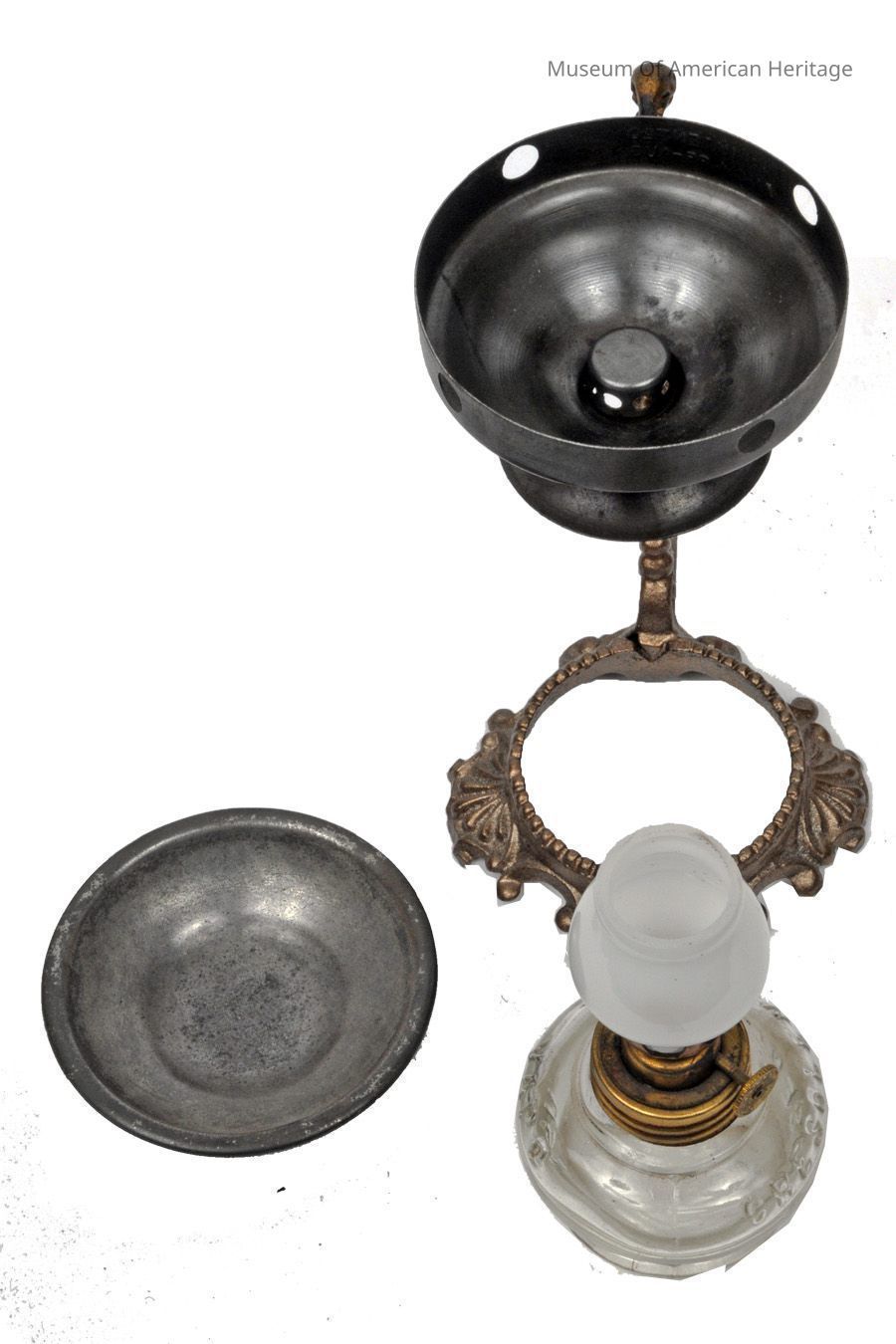In original box(wear & tear), Distributed by Lemming Miles Co., Montreal, Allen & Hambury s, London, gilt metal, glass warmers, takes kerosene.
