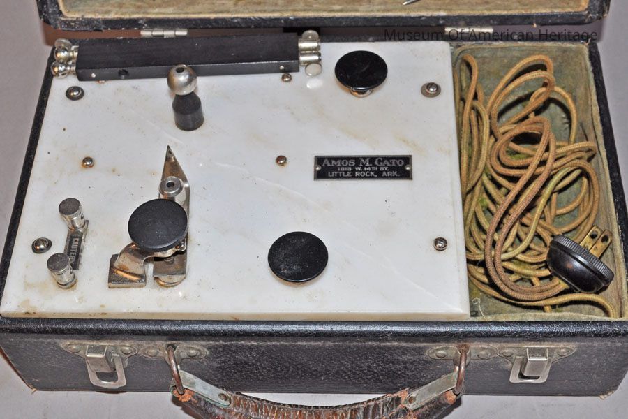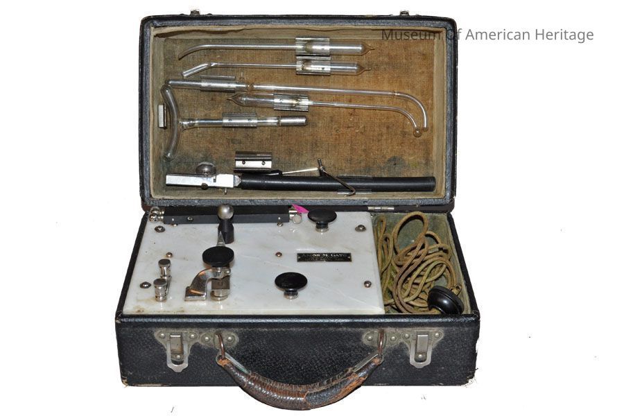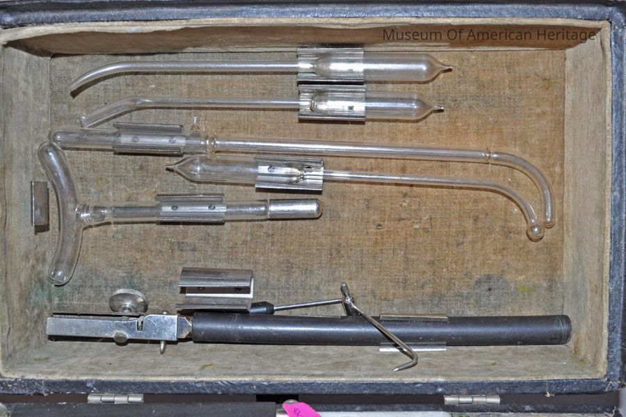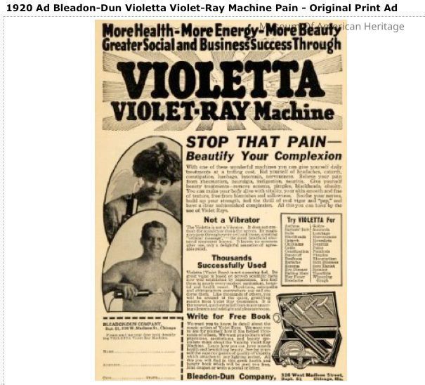 Popular in the first half of the 20th century, violet ray machines used high-voltage, high-frequency, low-current electricity for supposed electrotherapy. The machines generated a violet glow from a gas-filled glass electrode and a small amount of ozone. Manufacturers claimed that these machines could cure all manner of human ailments, including hysteria, arthritis, gout, hemorrhoids, brain fog, gray hair, and wrinkles.