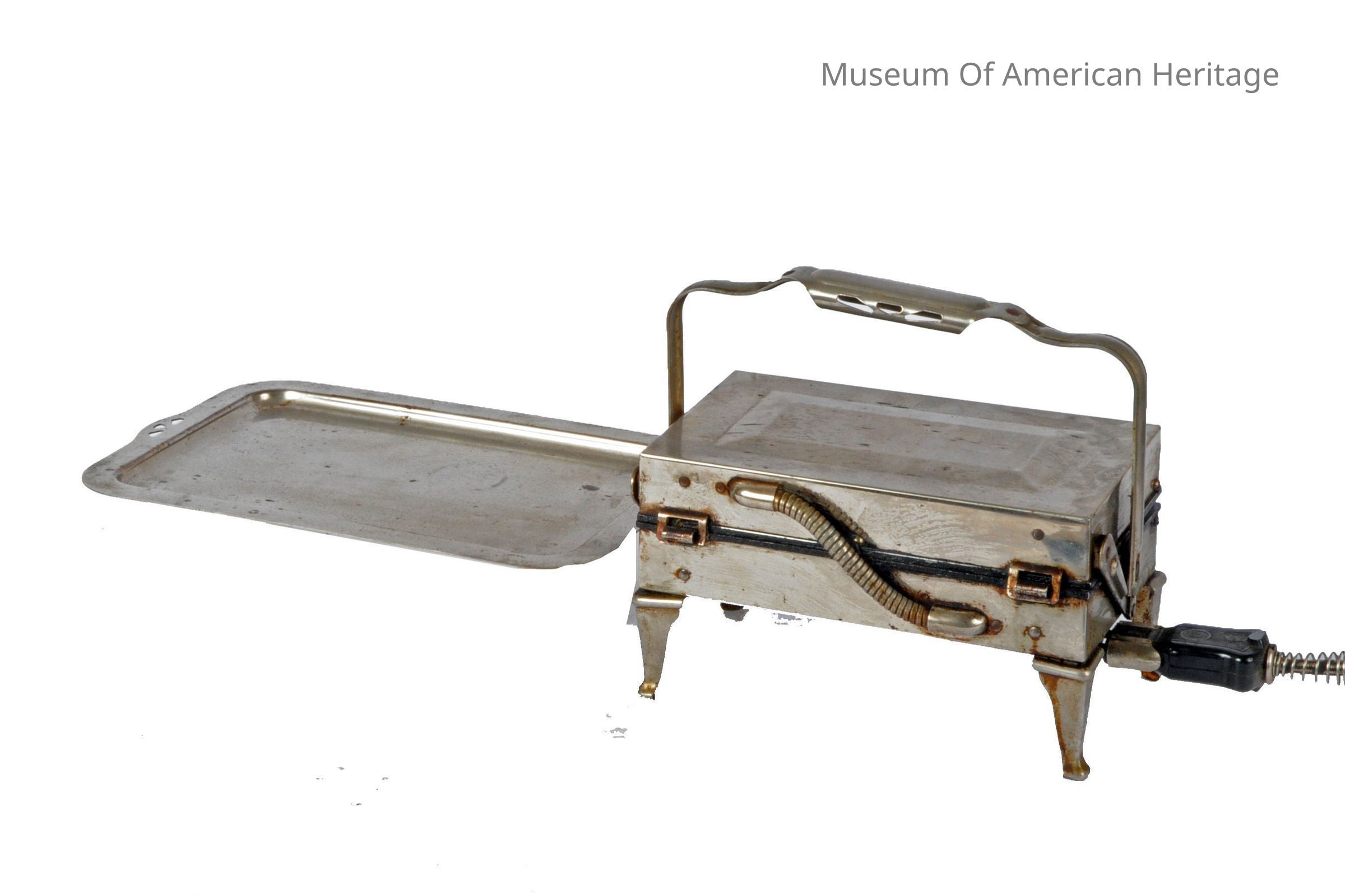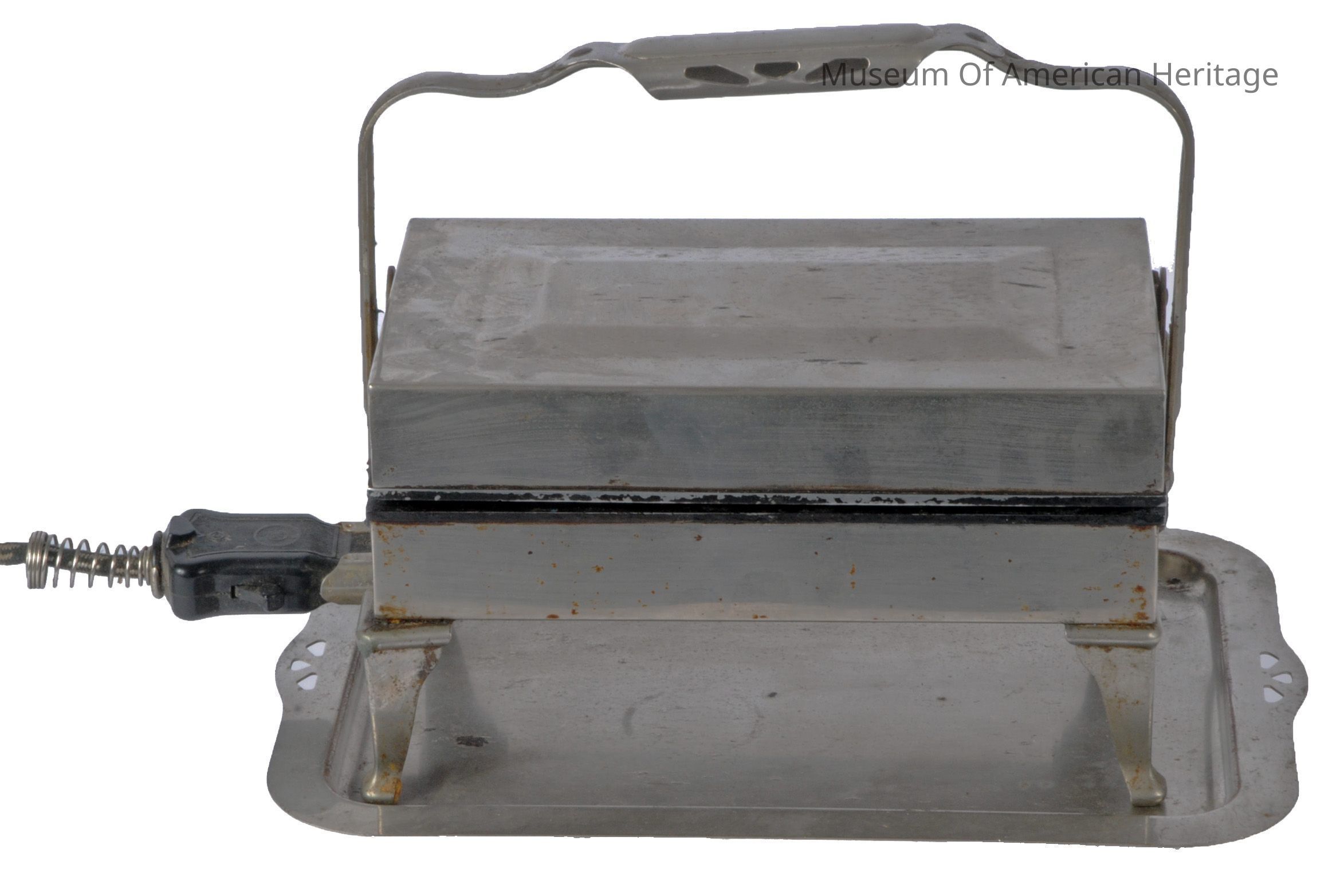 105V 660W, patent dates 4/20/1909 and 12/27/1921, has original serving tray, handle pivots over waffle iron to open/close.