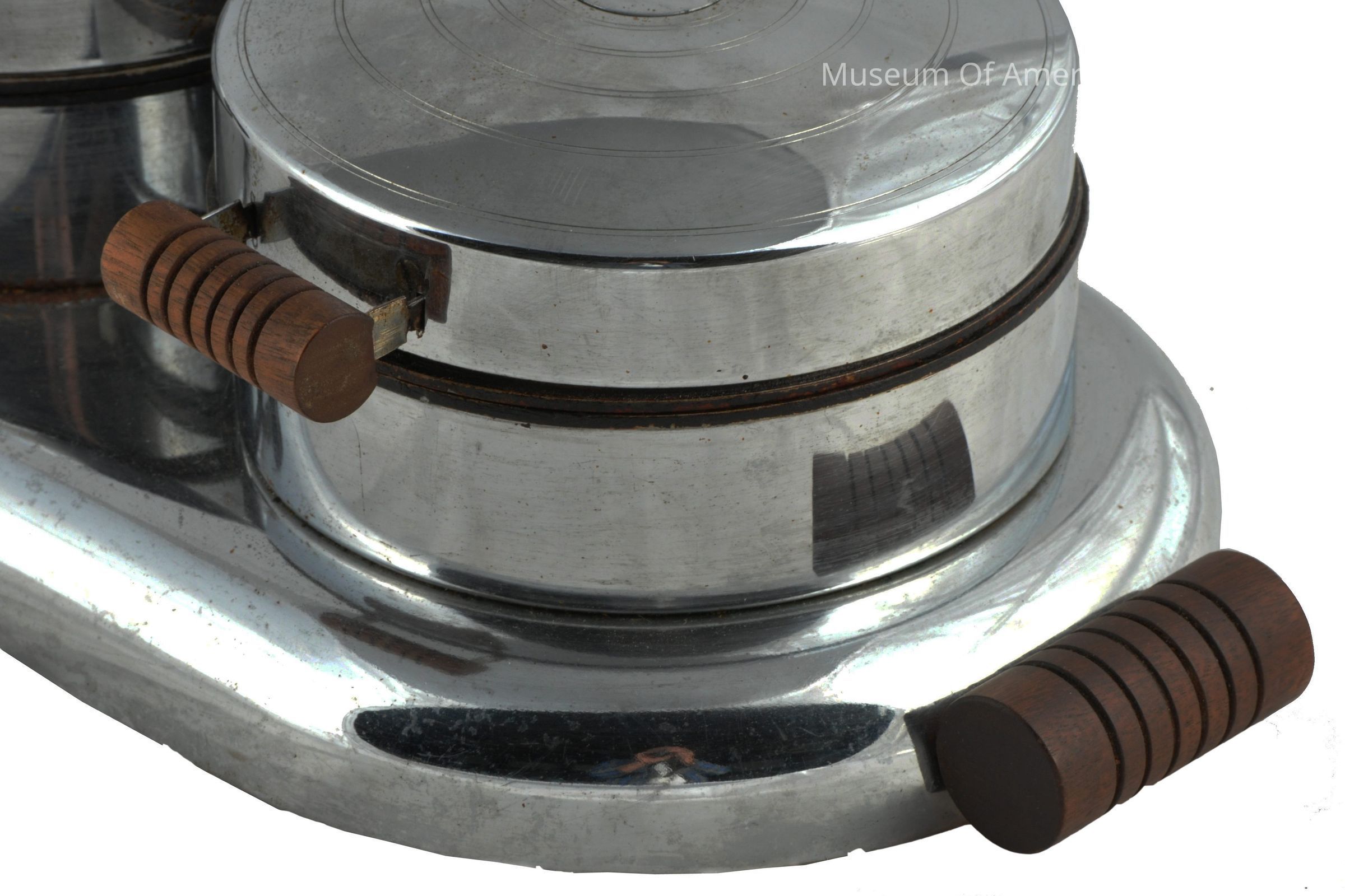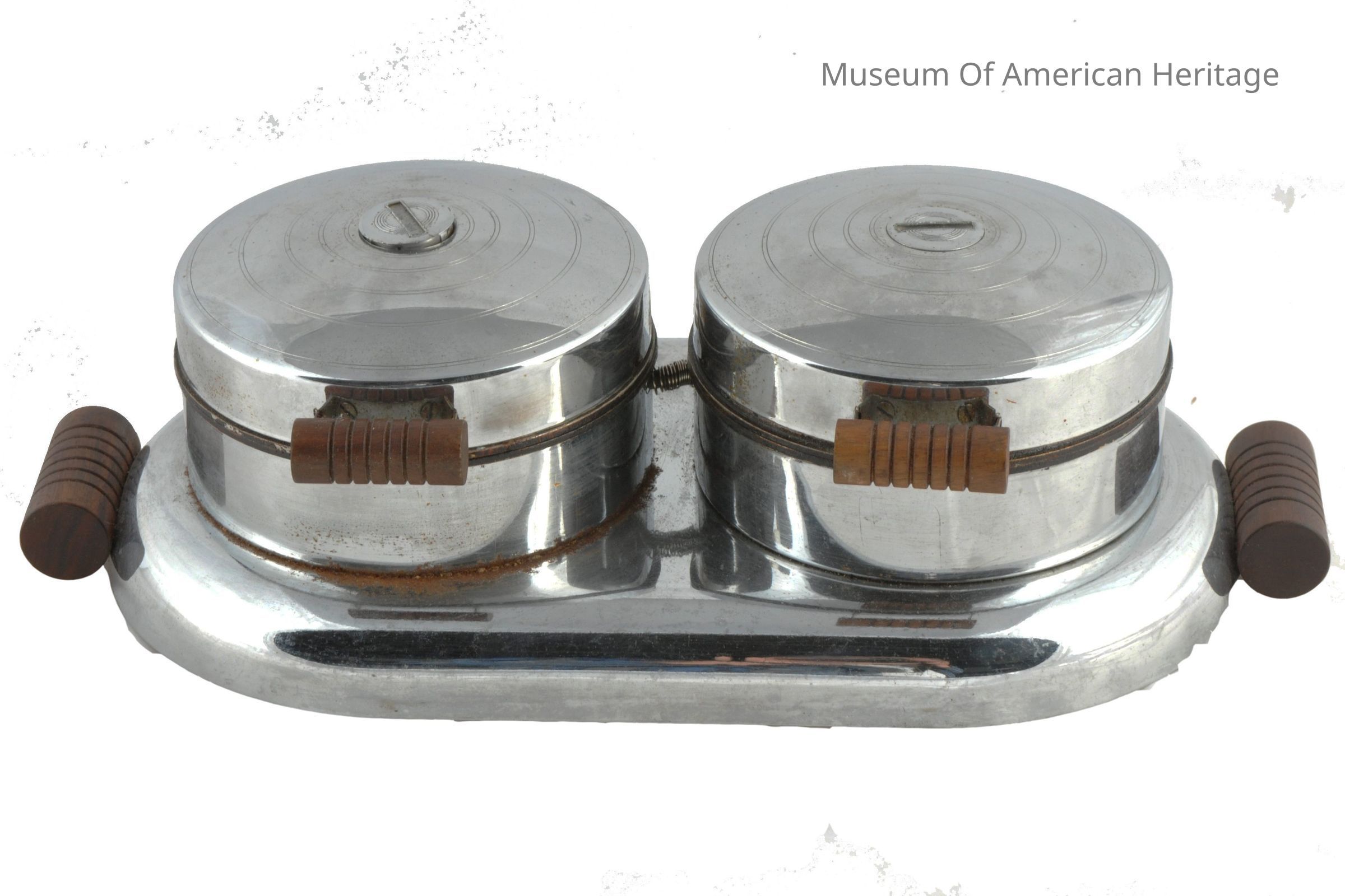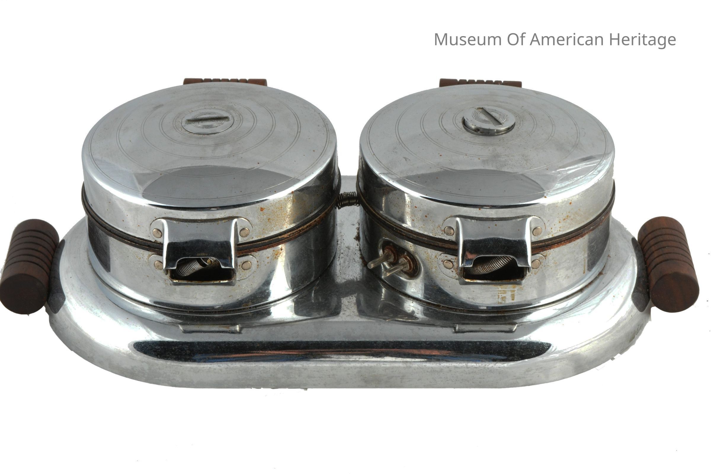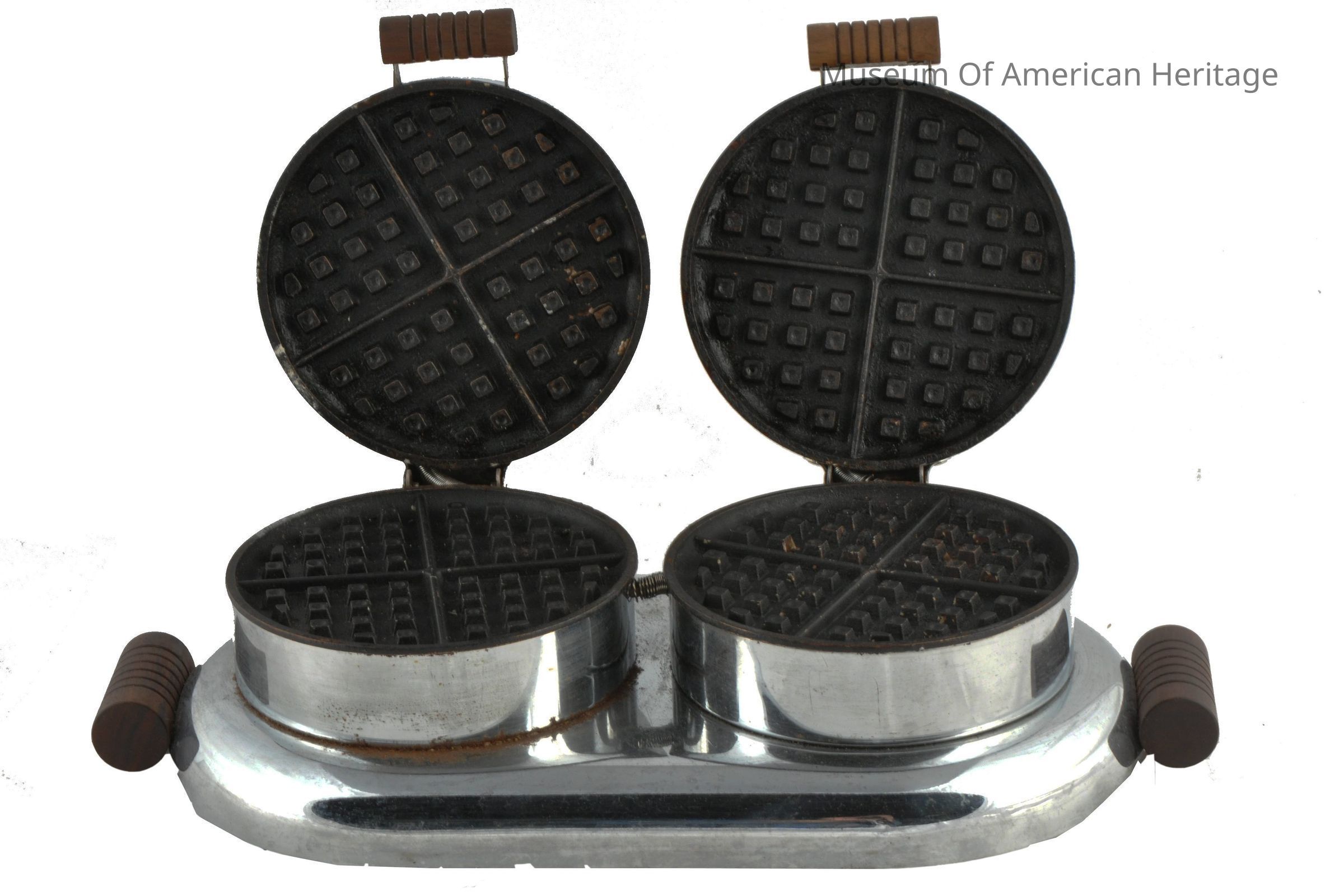 Makes two round waffles, wood handles, electric with cord, one connection to both.