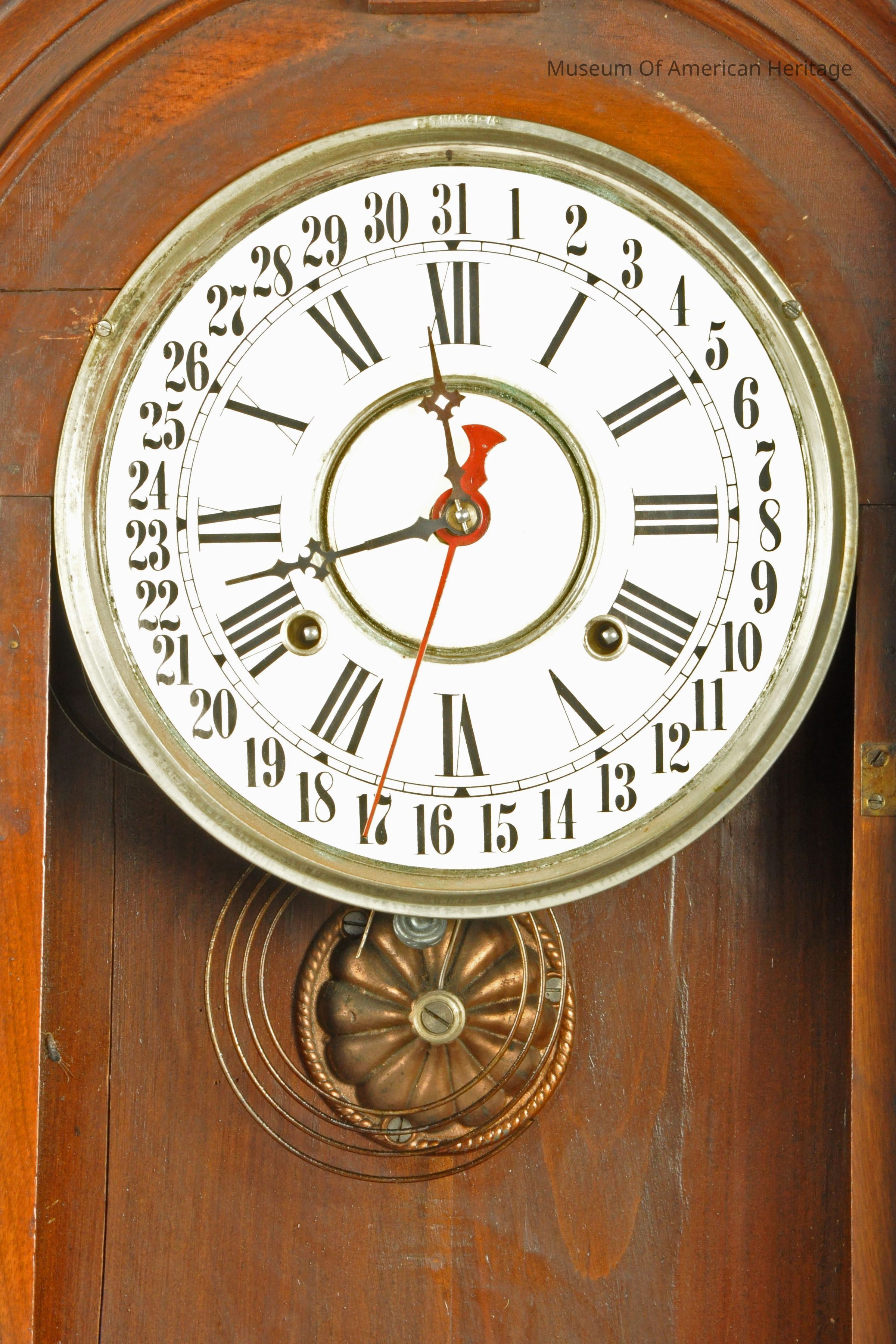 12 hour face, adjustable pendulum, key wound, face numbered 1-31, glass front door.