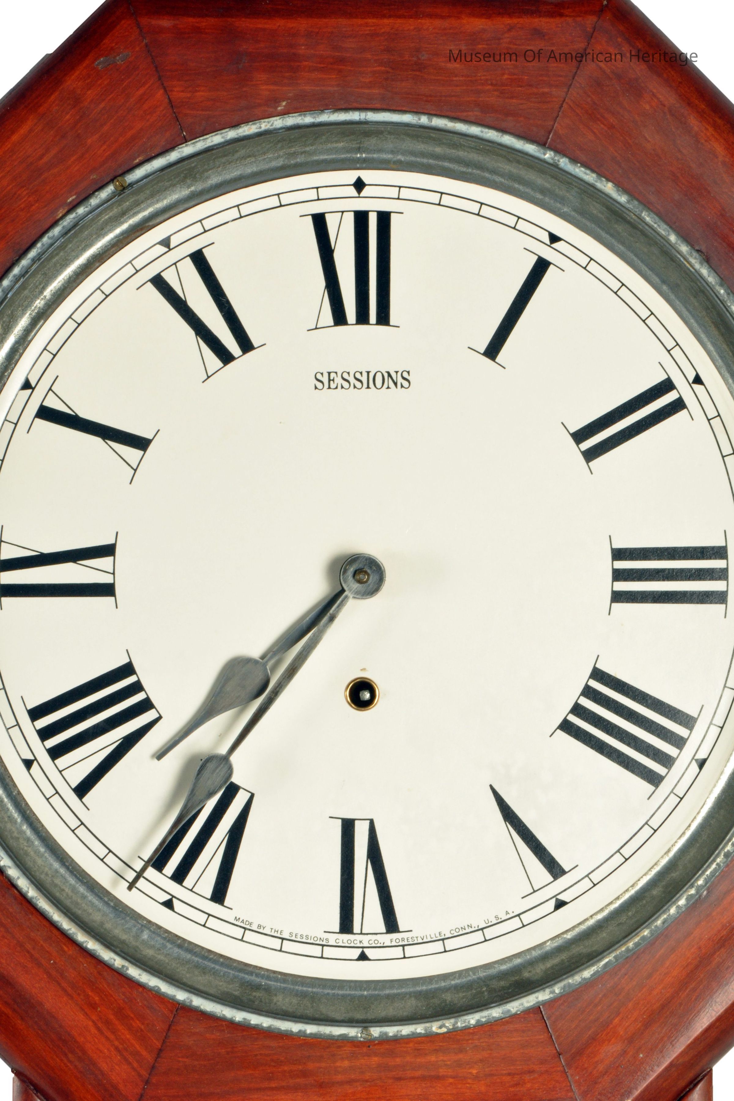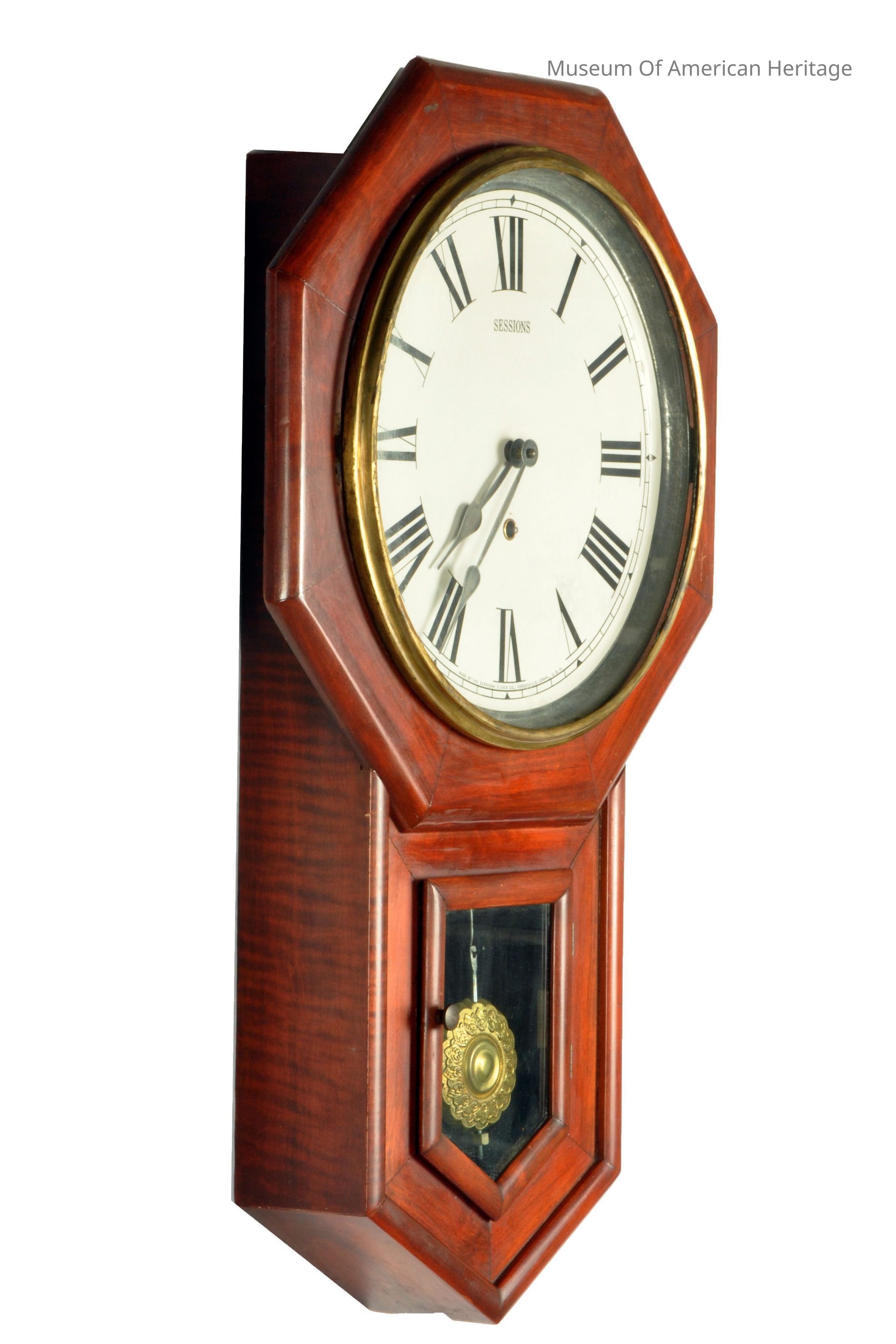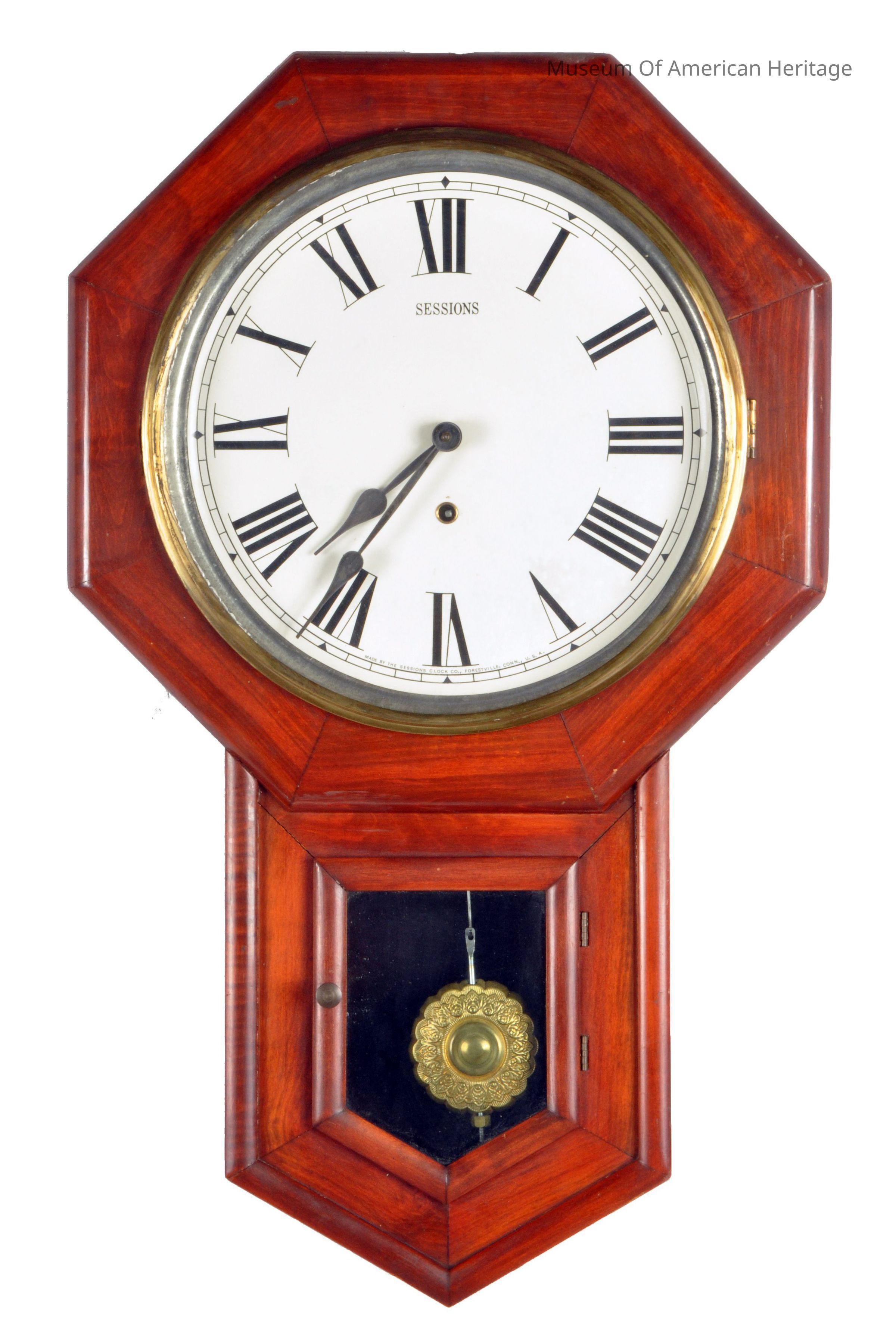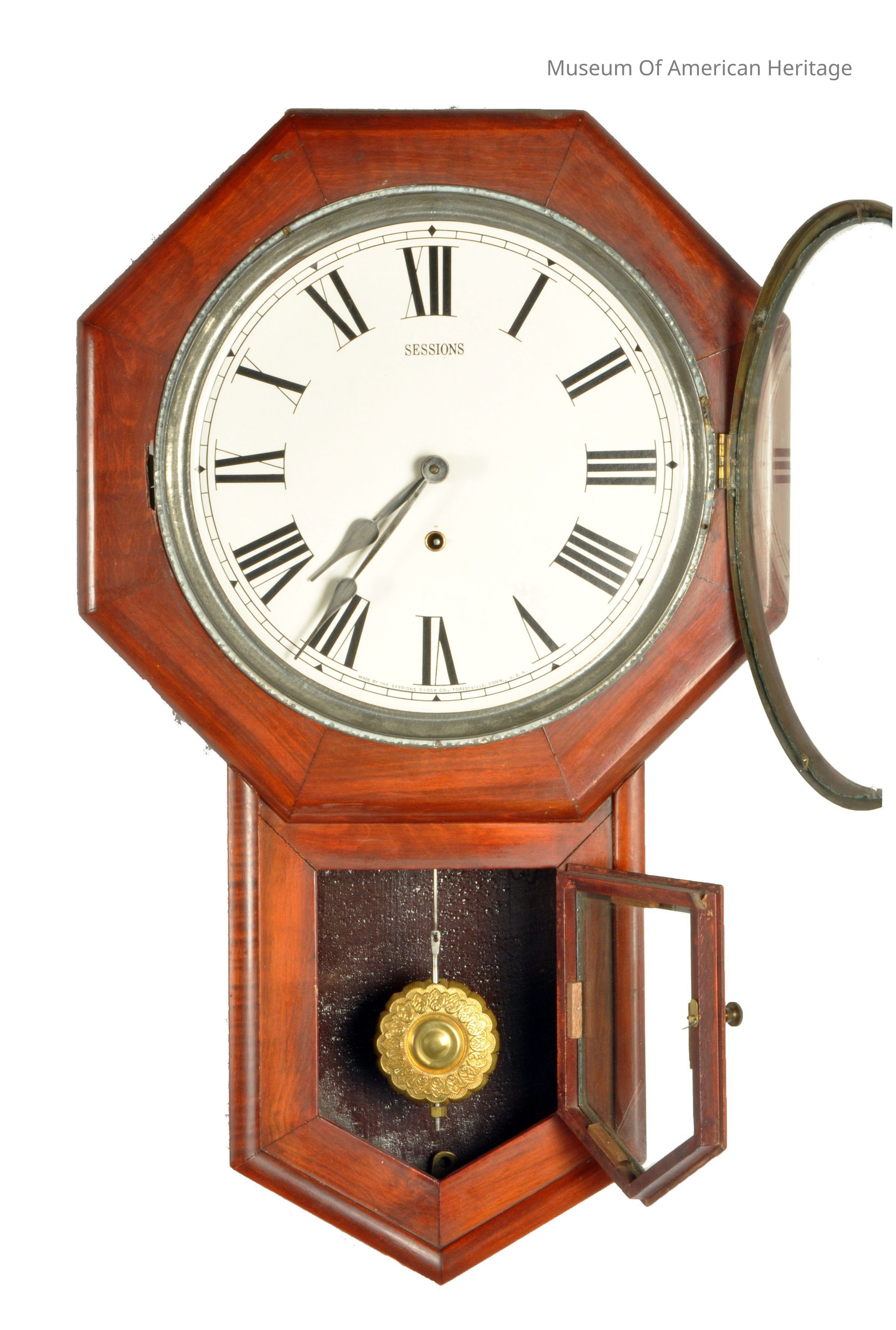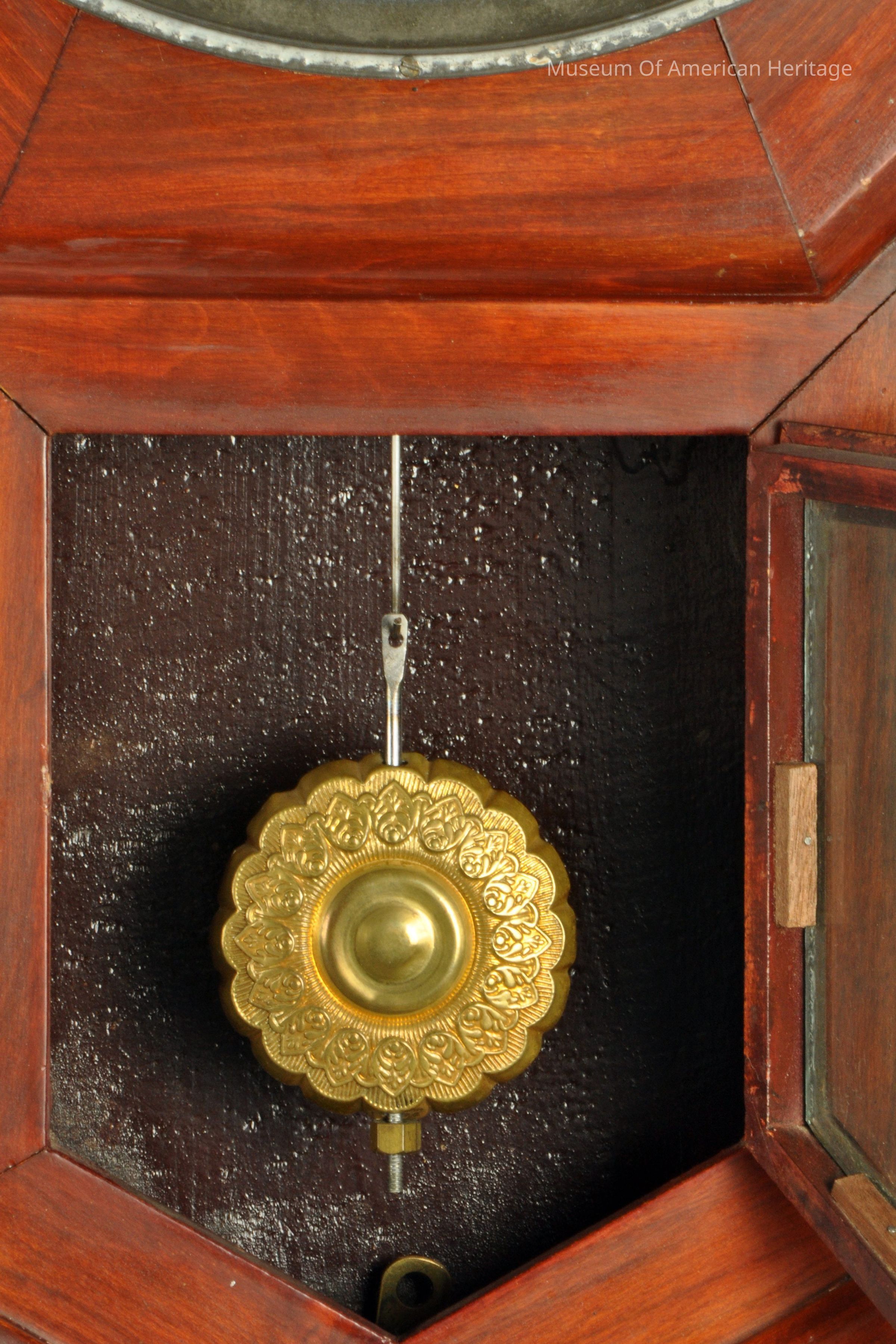 3 dia brass pendulum, black Roman numerals on white face, glass door over face with brass ring, glass front door for pendulum, octagon shape top at face.