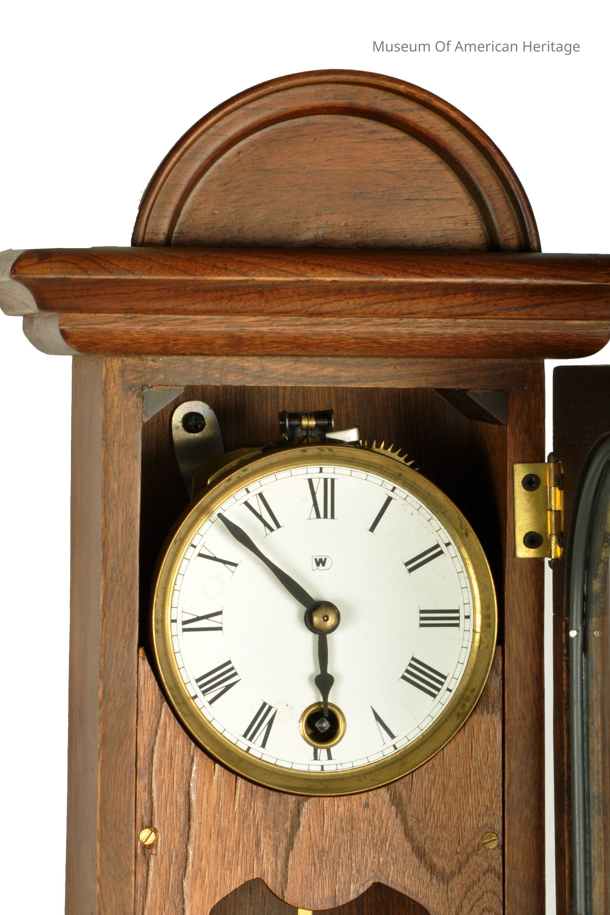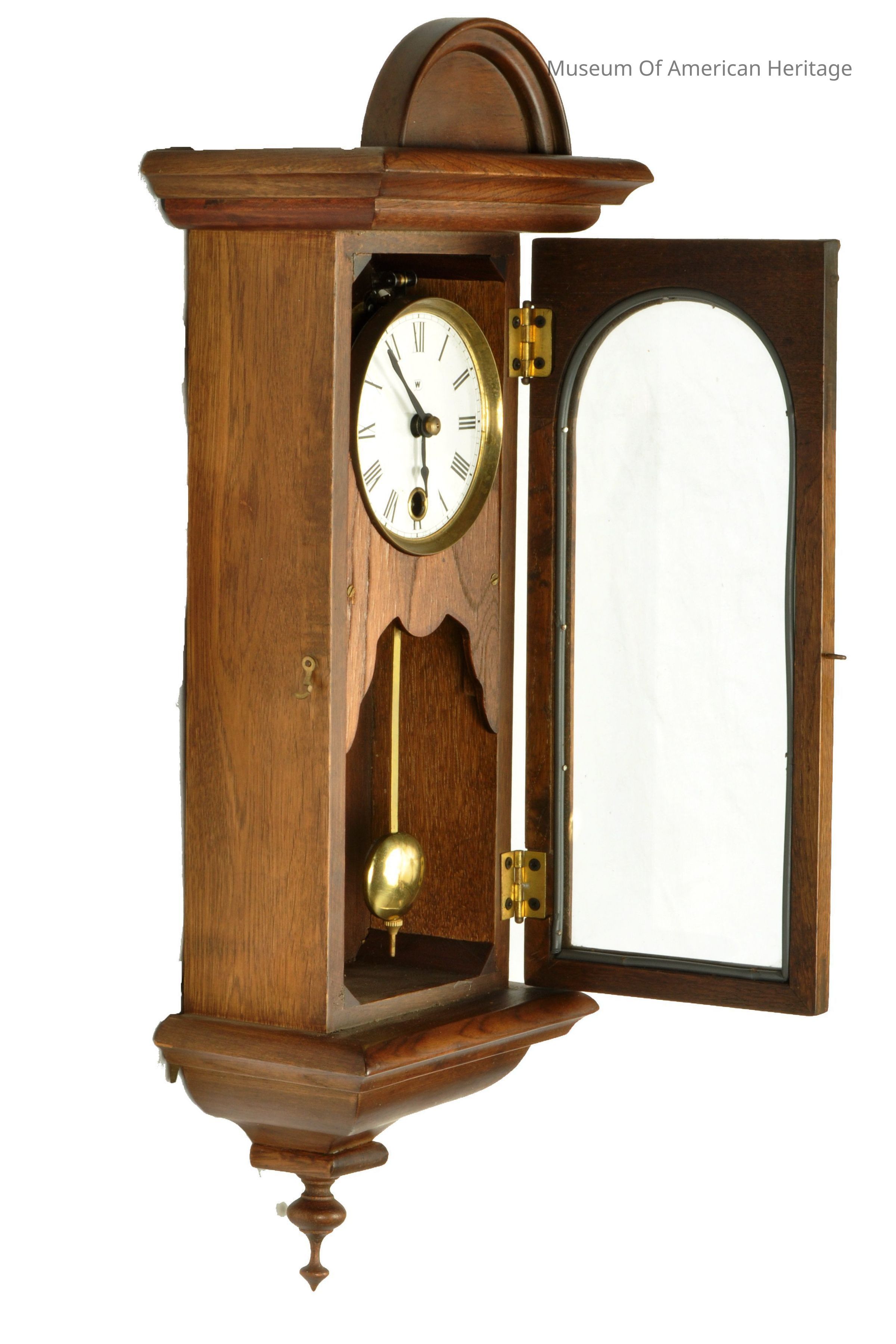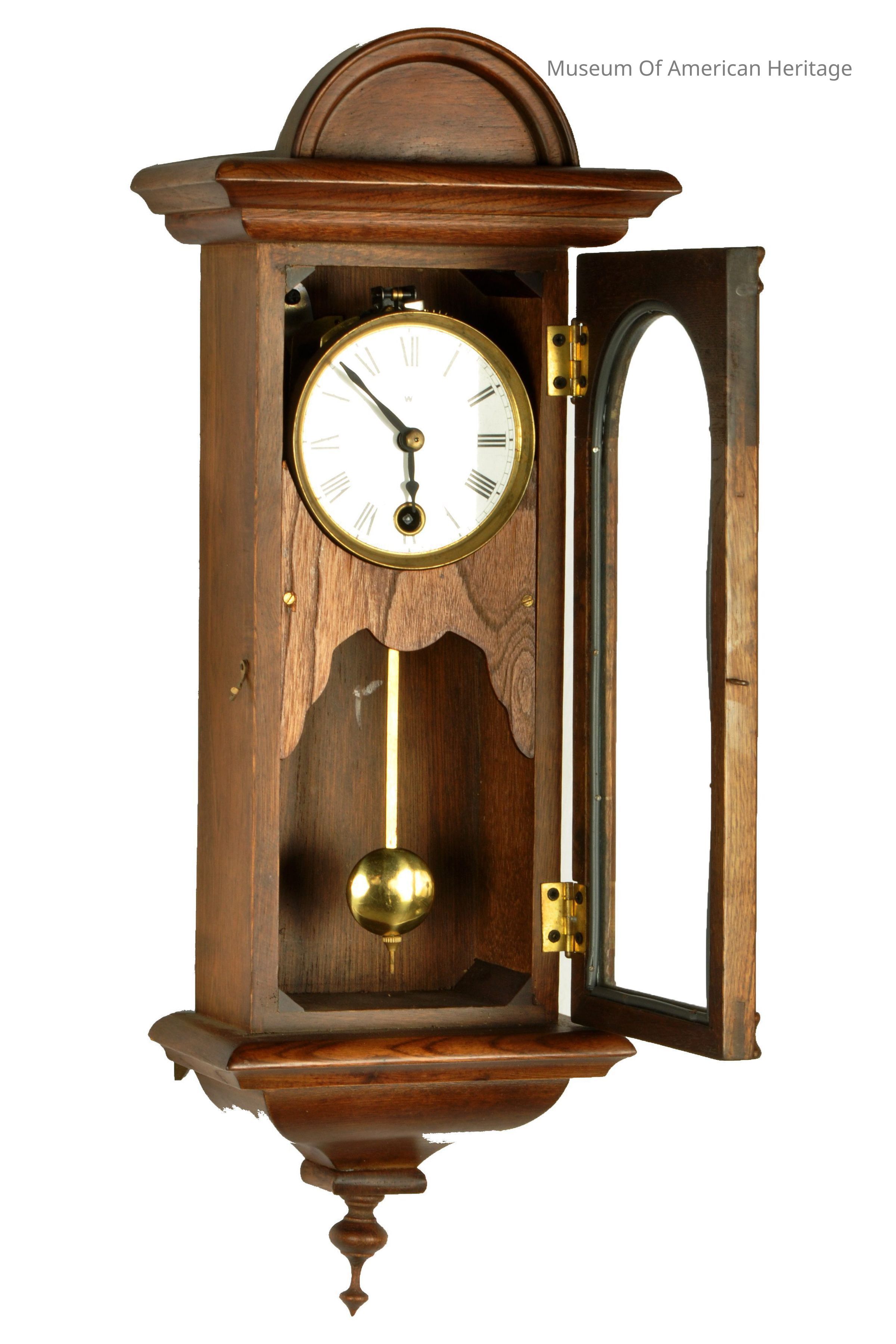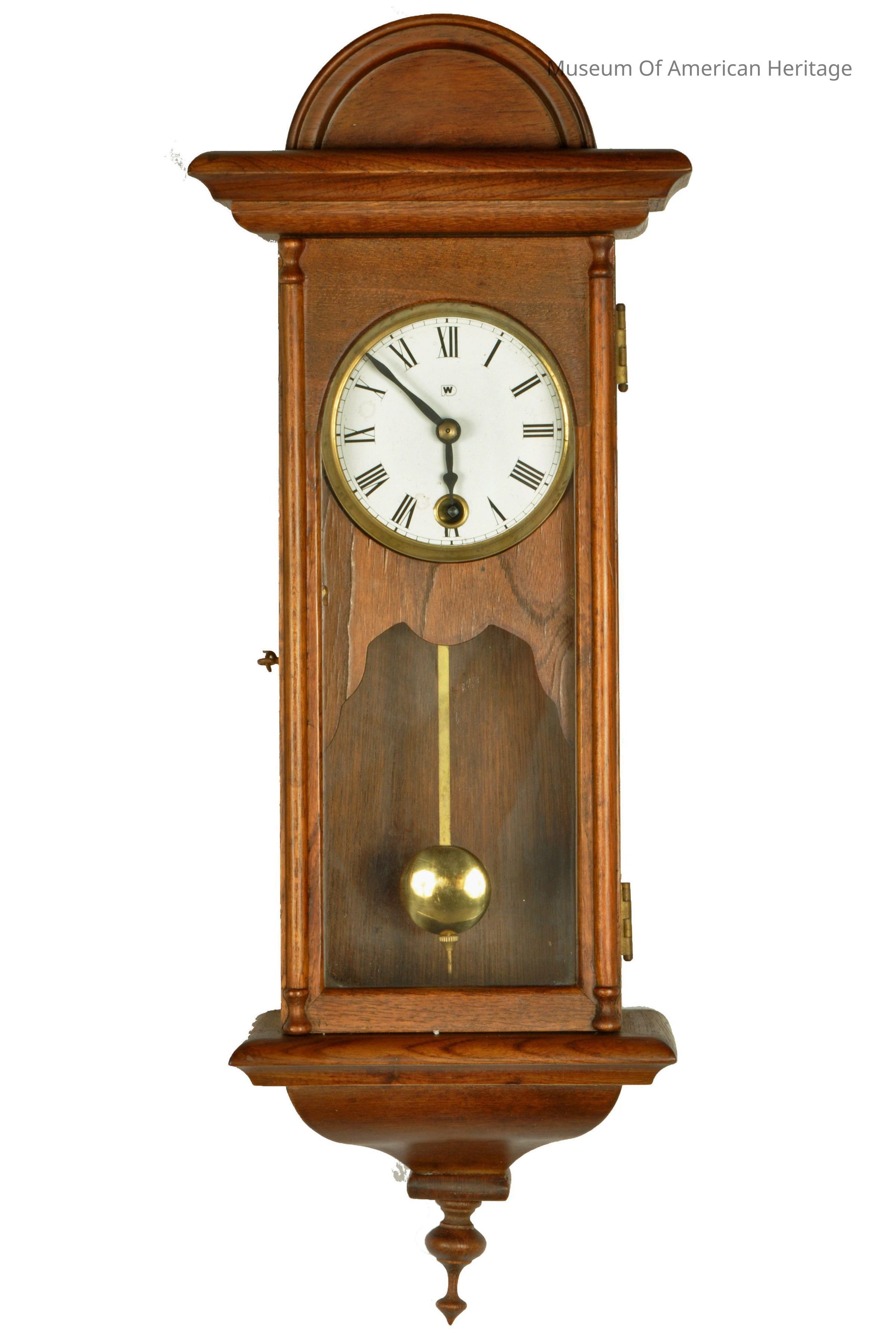 W on face, wood framed hinged glass door, brass pendulum.