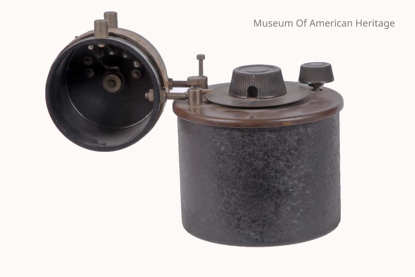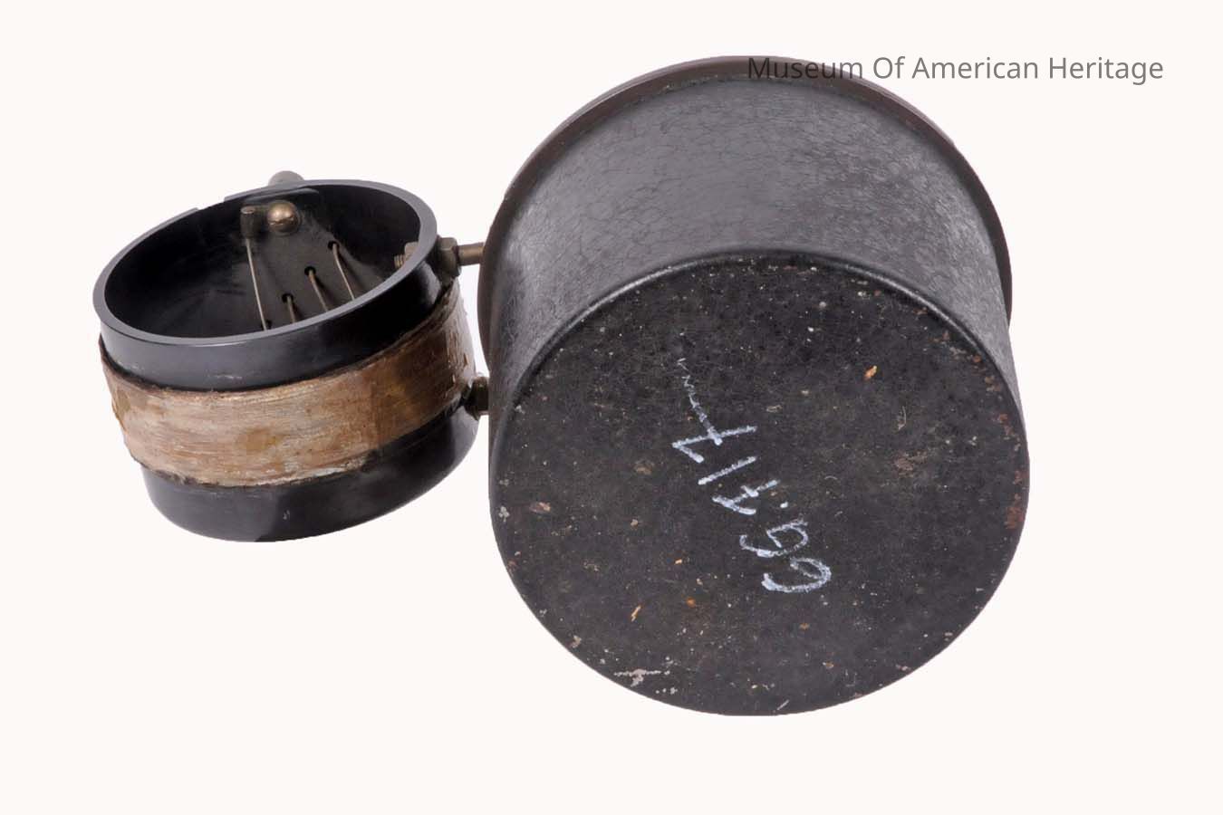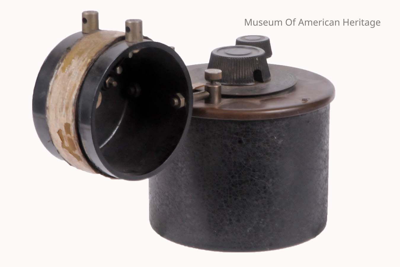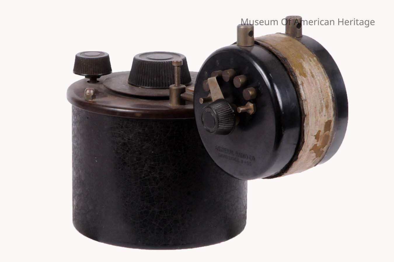 Condenser in metal can, coil body made of Bakelite. The Variable Condenser is marked "Wavemeter", its max. capacity 456 uuF. The wavelength is given as 200 to 600 meters.