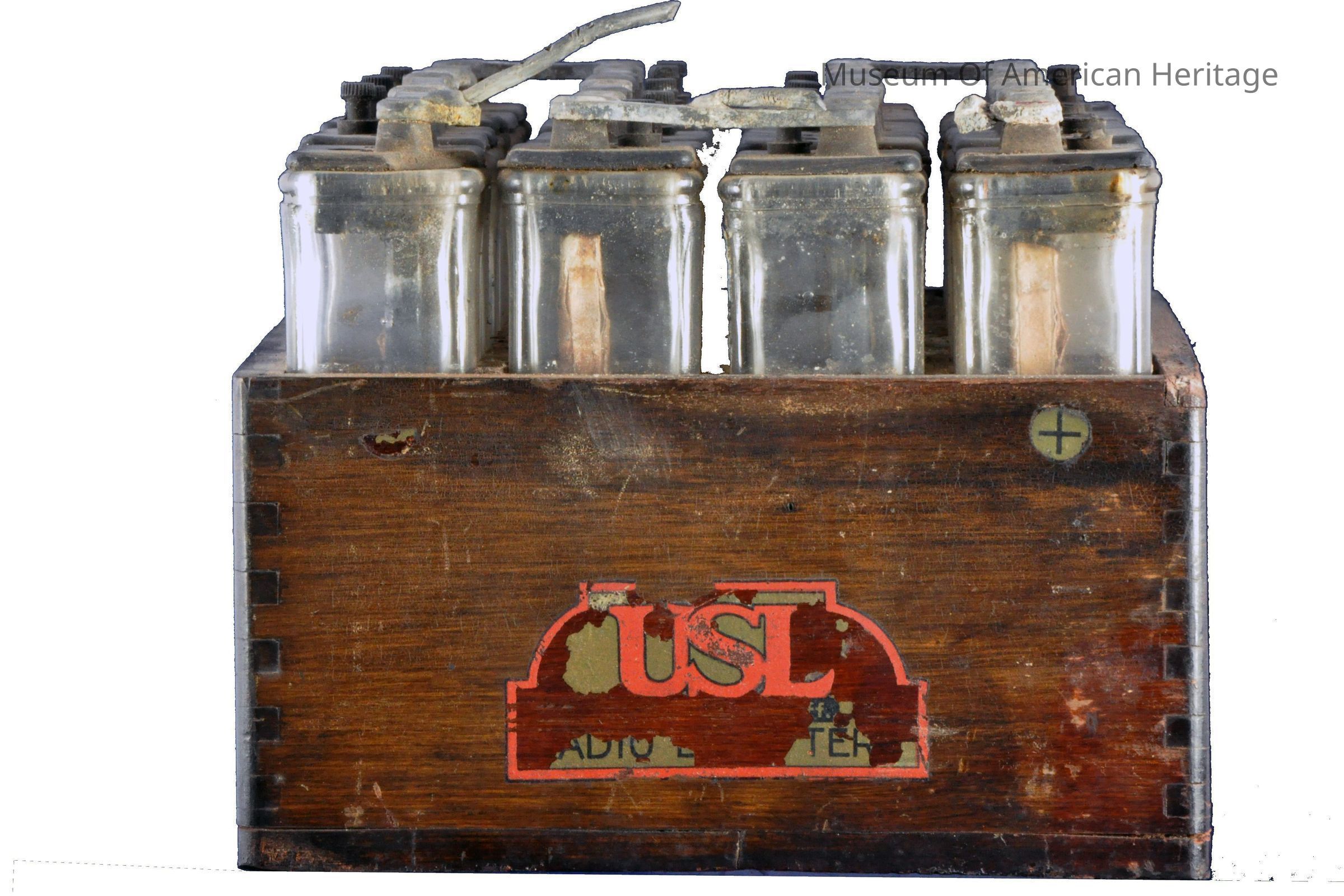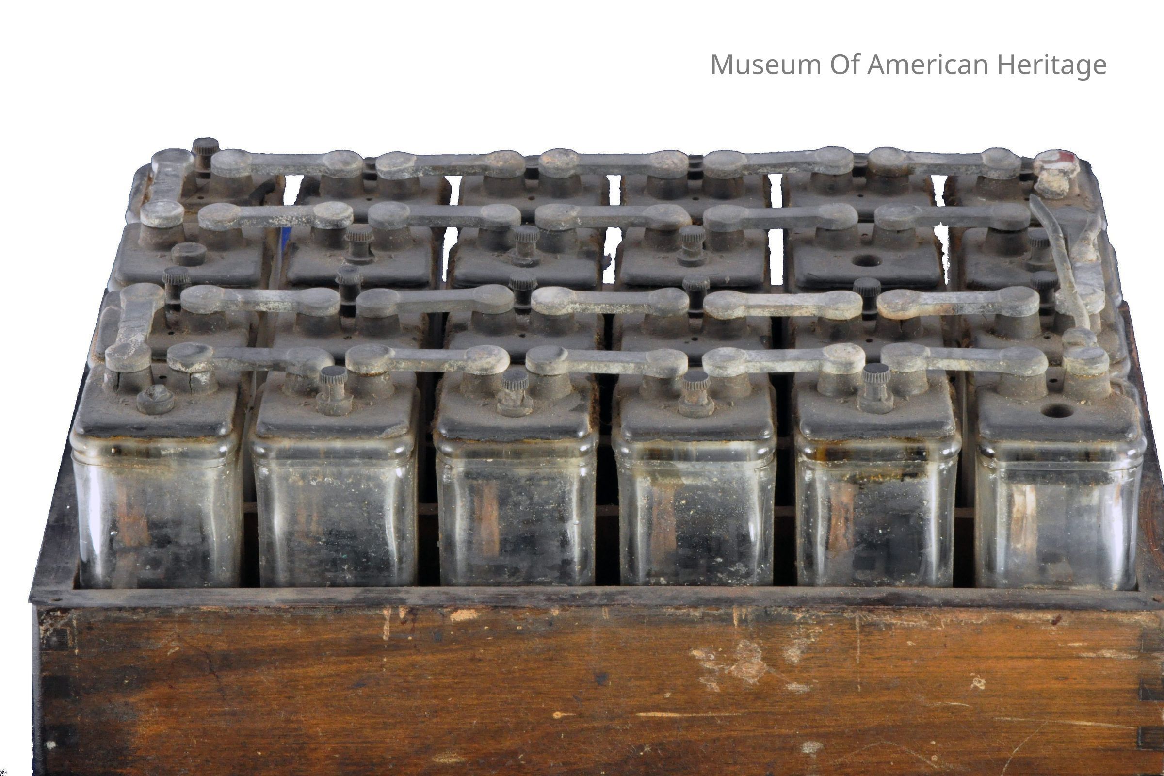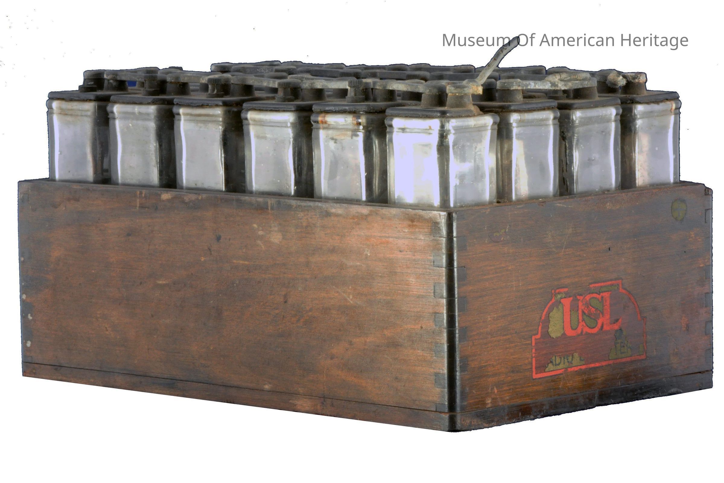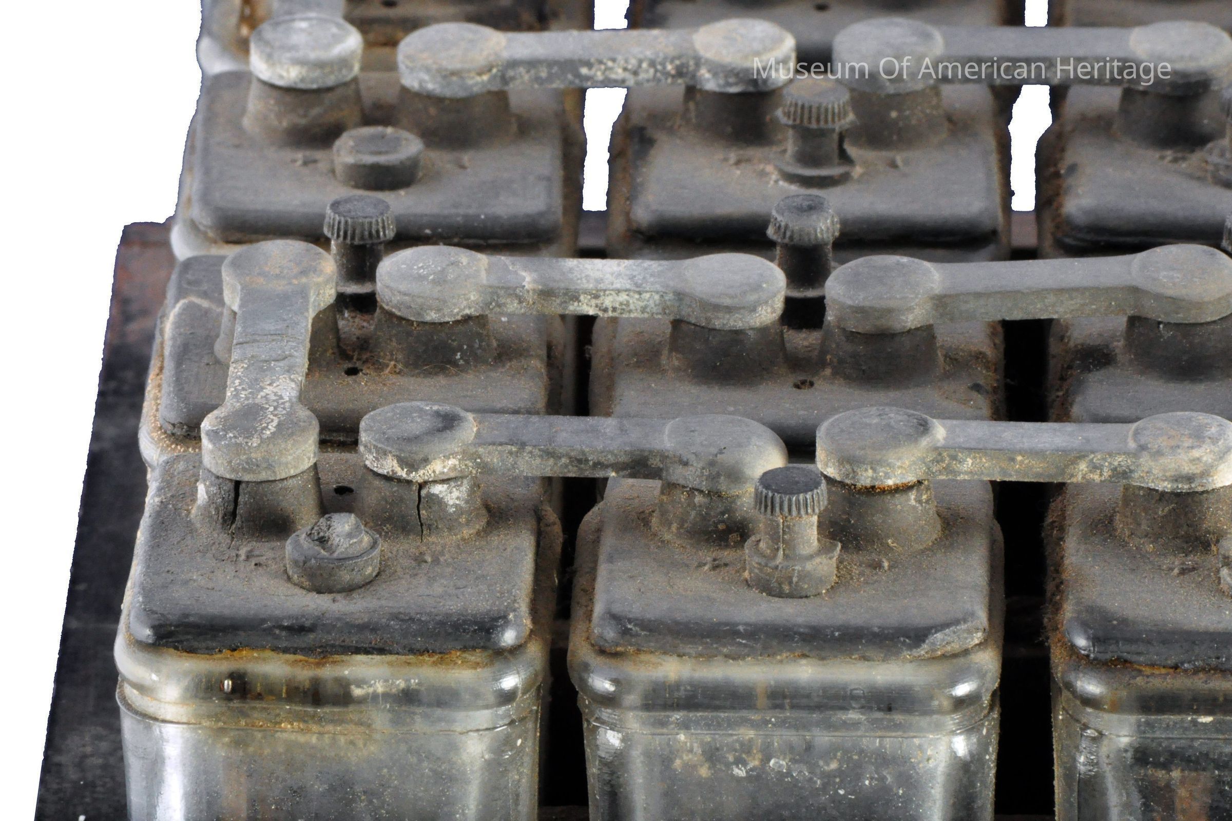24- 1 1/2 volt wet cells interconnected, glass with lead links, used in early radios.