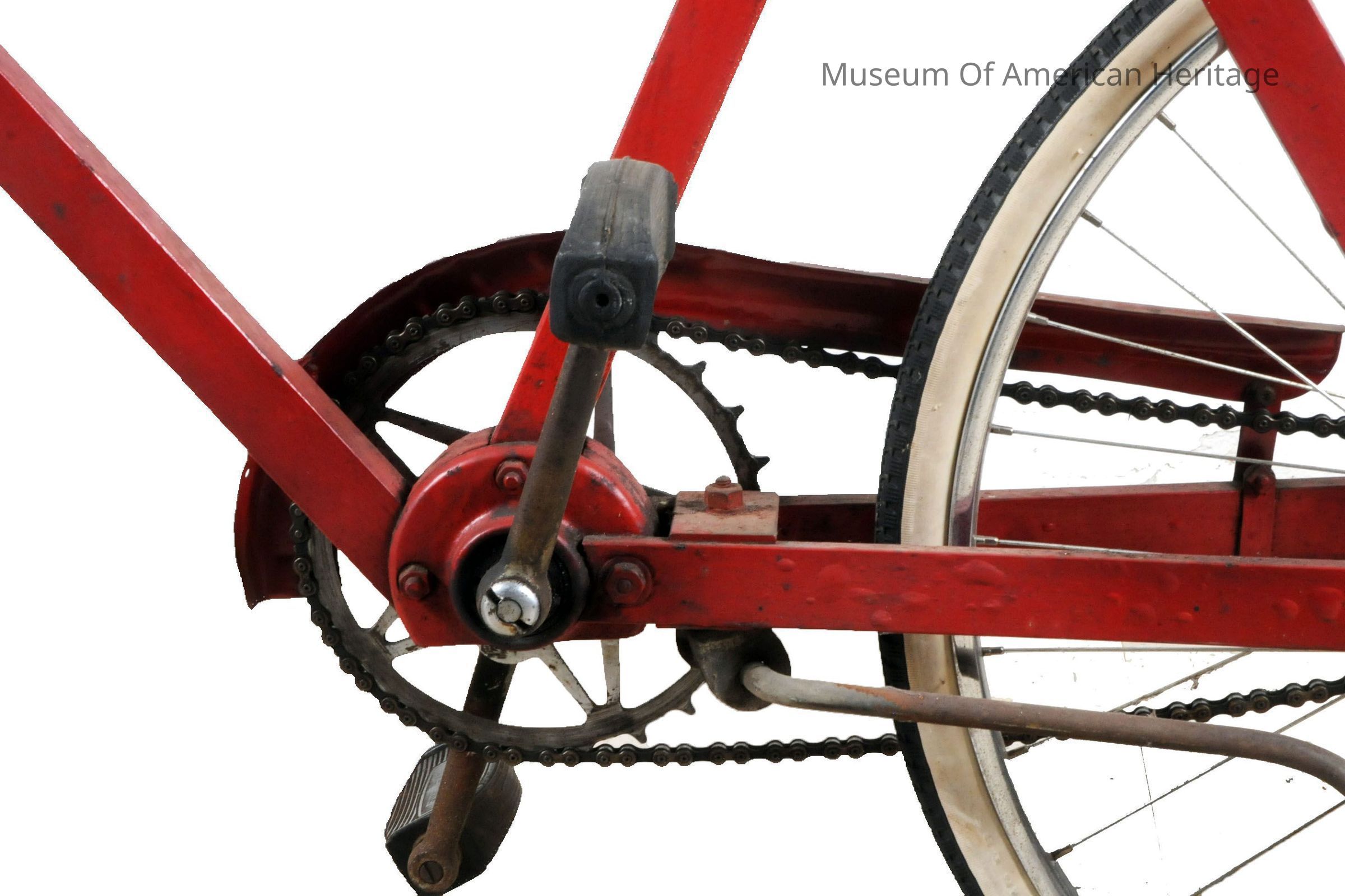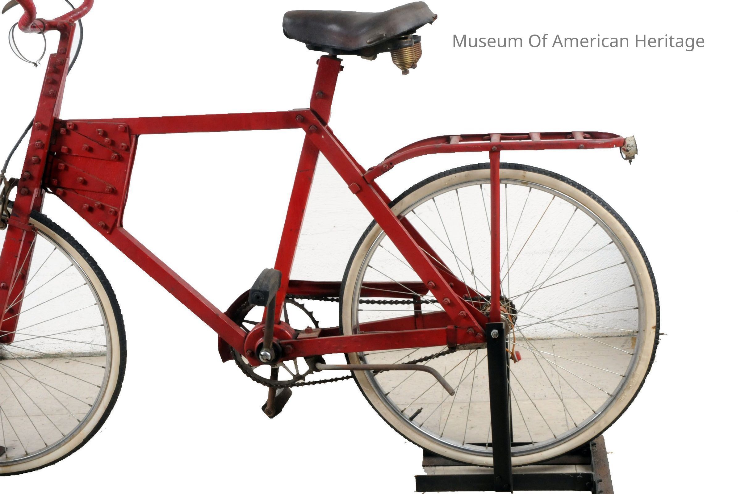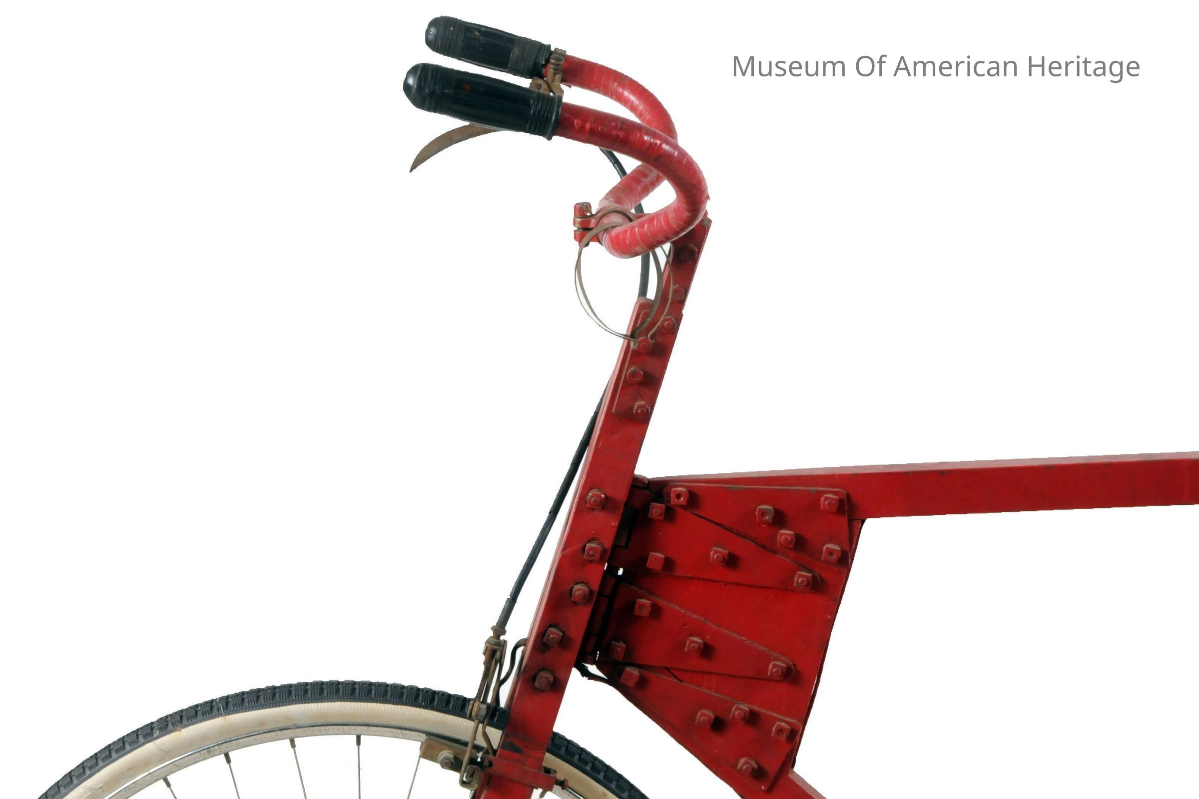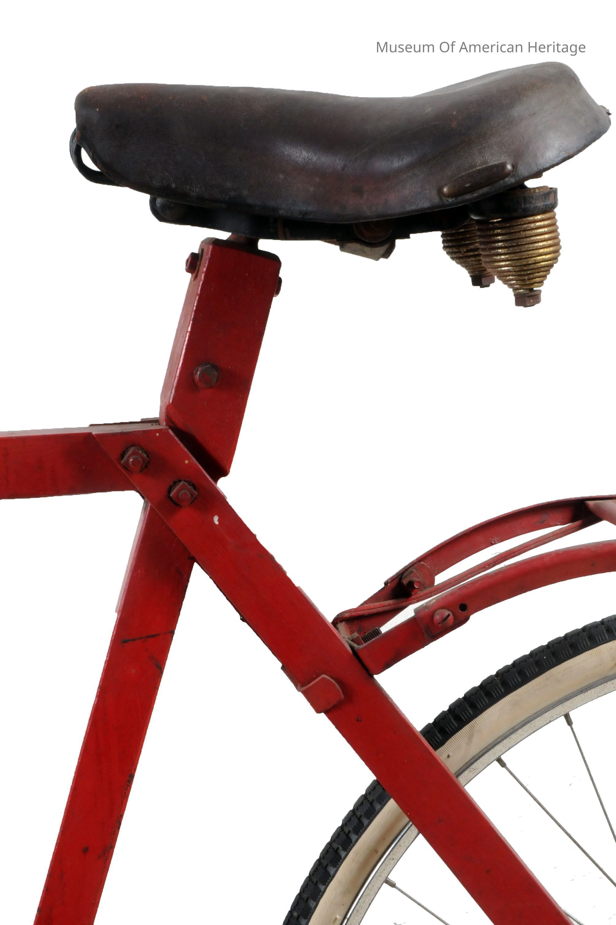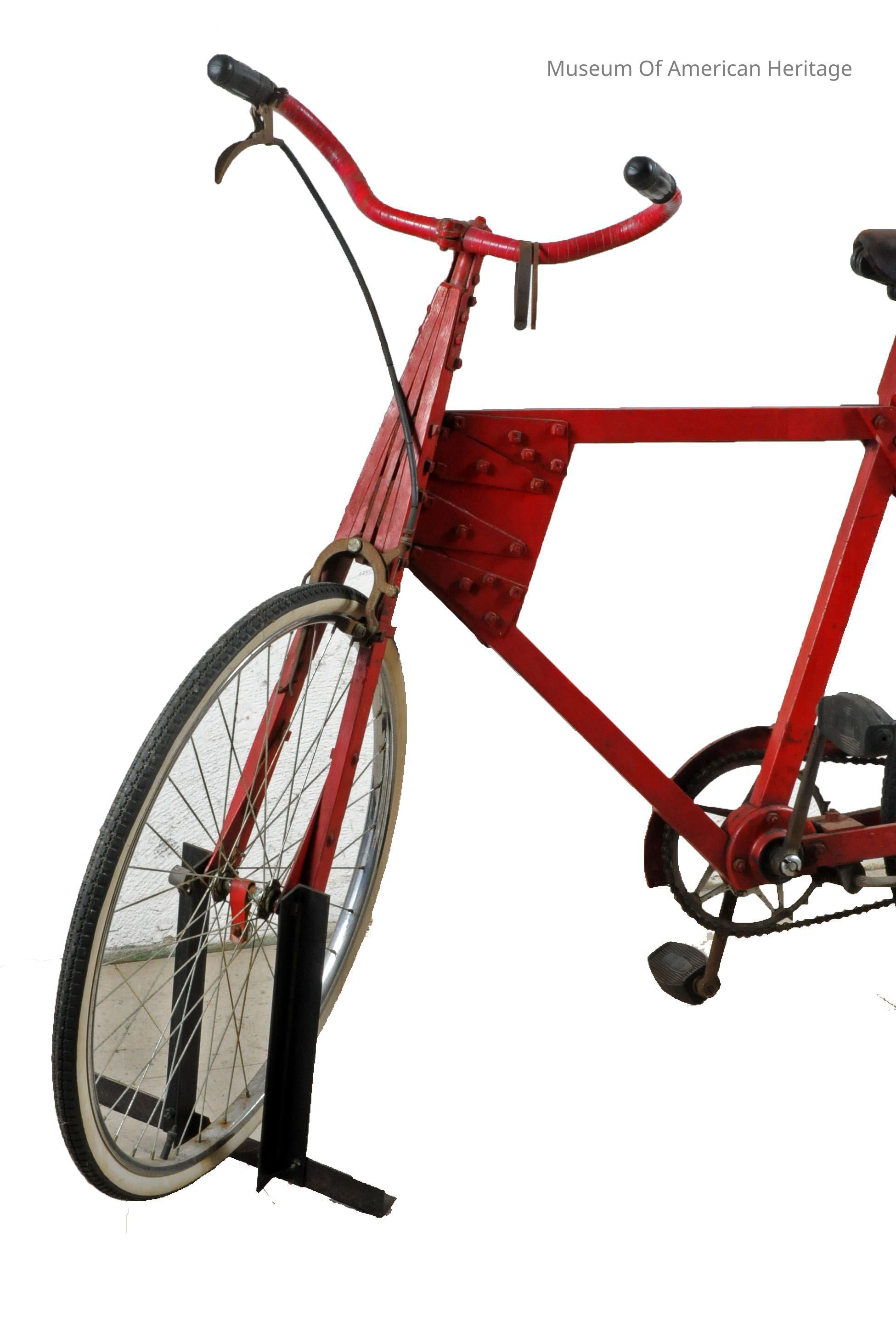 Made entirely from non-priority materials during World War II, front wheel fork pivots using large gate hinges, recycled seat, handle bars, sprockets & petals. Featured in March 1943 Mechanix Illustrated.