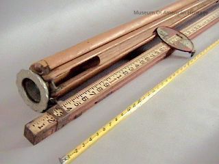 In wood case, red plumb bob, screwdriver, with 60 non-telescoping tripod, 87 1/2 sight stick (tripod & sight stick stored above office).