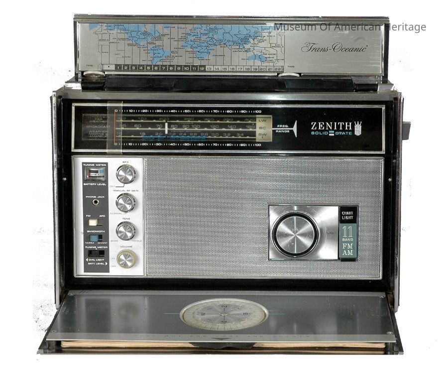 Carrying handle, solid state, hinged front, space for station log, compass, world map, 11 bands (FM, standard broadcast, marine, aviation and weather).