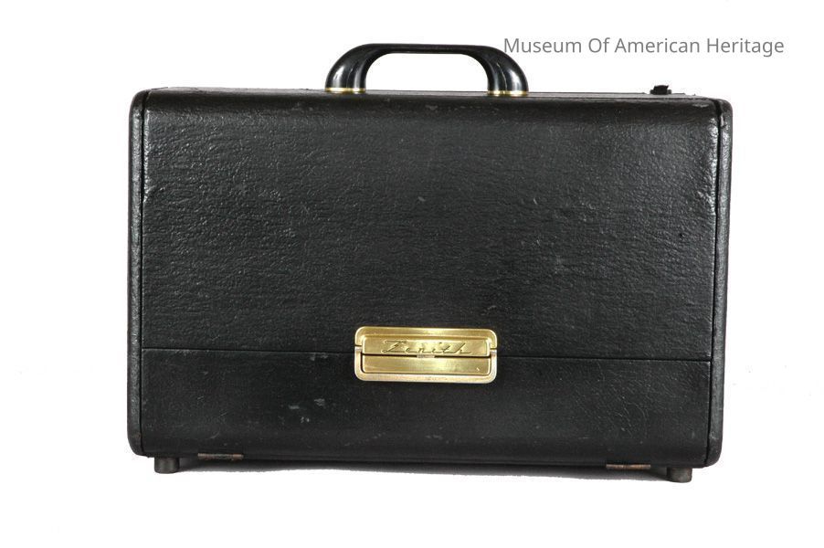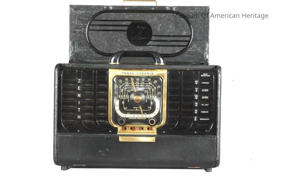Pull-up antenna, 2nd antenna in lid, standard broadcast plus short wave, push buttons, gold trim.