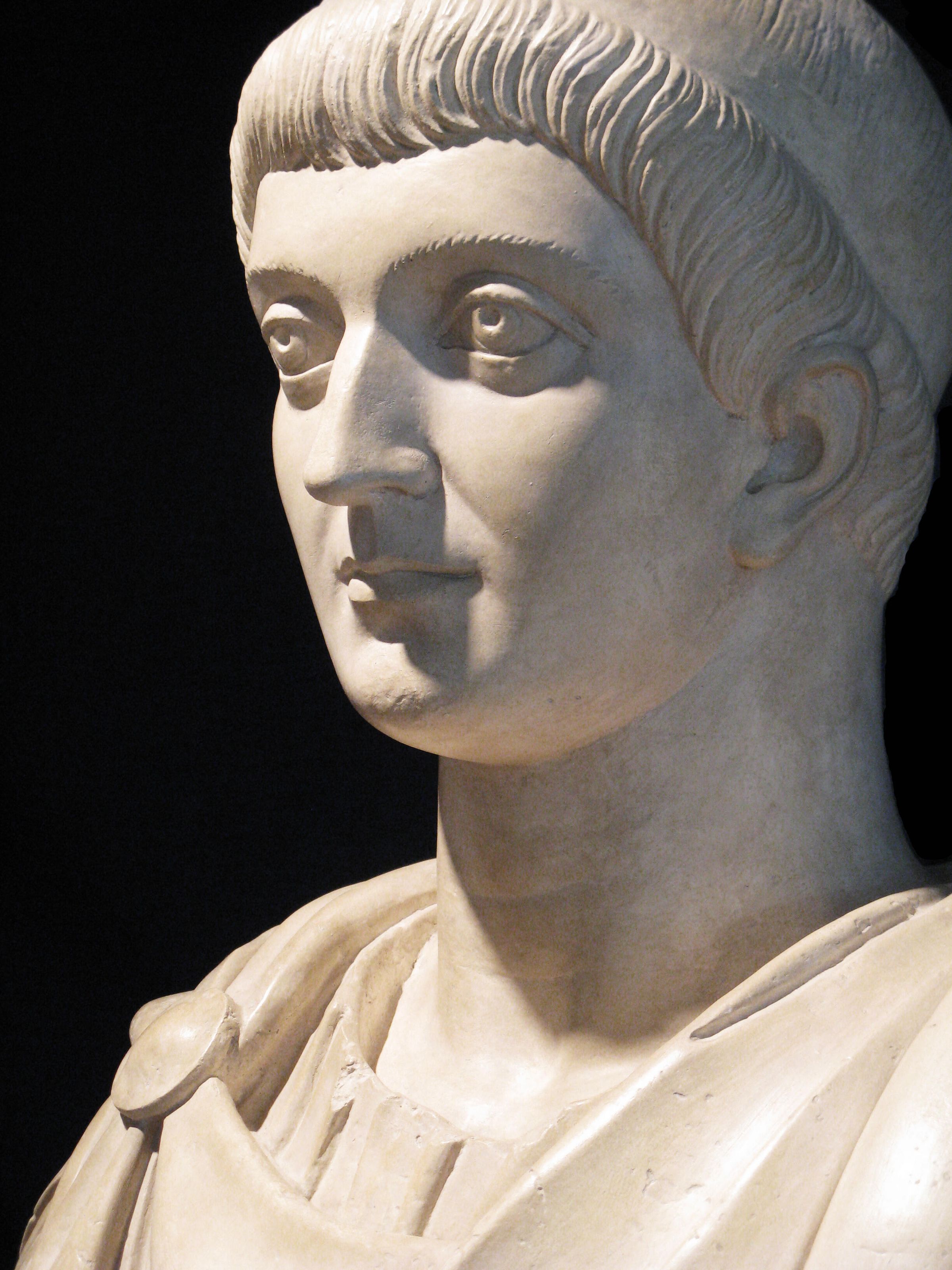 Bust to mid-chest of Roman emperor Constantine draped, and atop a small pedestal. Plaster replica, marble original. Only the face is certainly original, the remainder of the bust was most likely from another statues and added significantly after the creation of the portrait head.Type of Sculpture