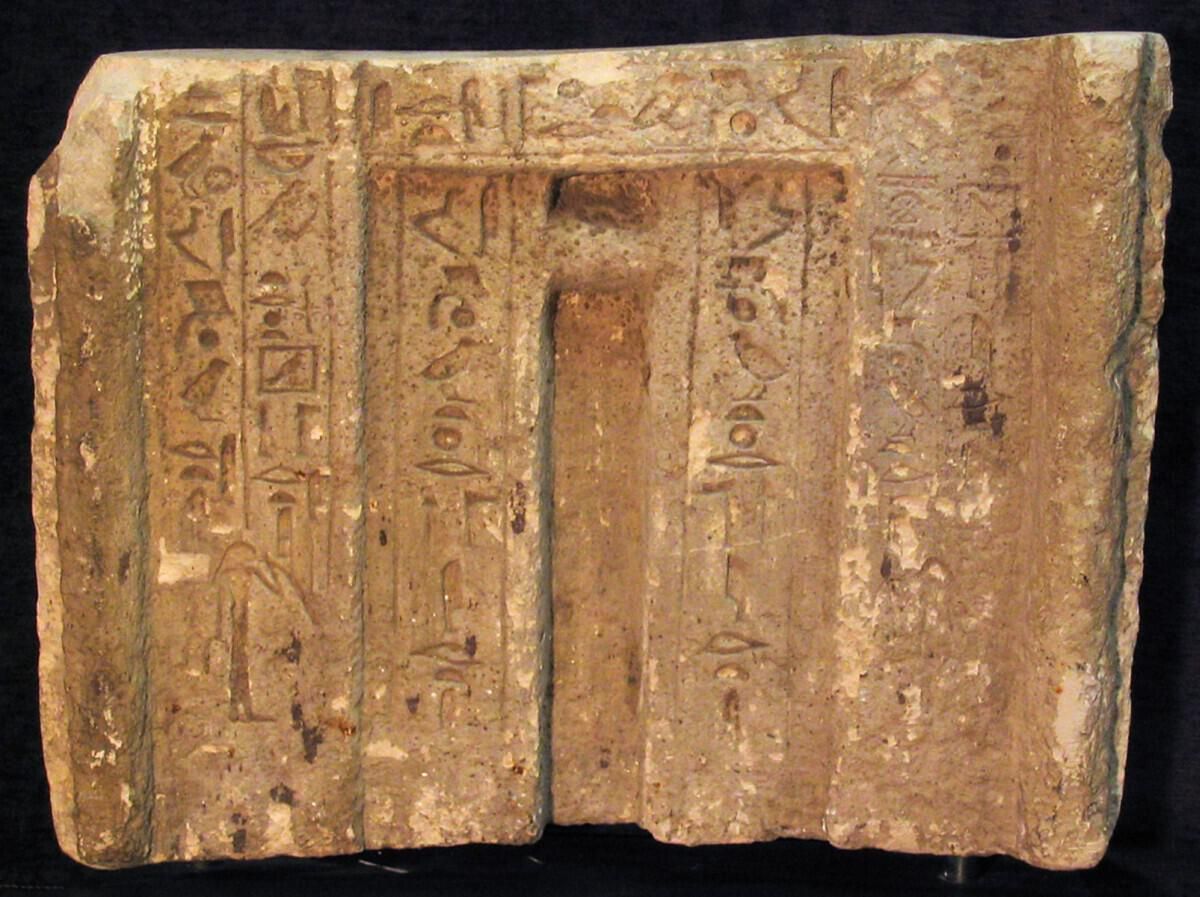 Made for the the tomb of a priestess named Irti of the goddess Hathor. The so-called “false doors” are a common feature of Egyptian tombs of the Old and Middle Kingdoms (2780-2280 and 2134-1778 BC, respectively). The Egyptians believed that the afterlife was similar to the life of the living. (See also: Ushabtis; Canopic Figures.) For this reason, the dead too required food for sustenance. Offerings were supplied by the descendants of the deceased or by mortuary priests. It is believed that the primary function of false doors like this one was to offer the soul of the deceased access to this world in order to receive such offerings. They are called false doors because they do not open.