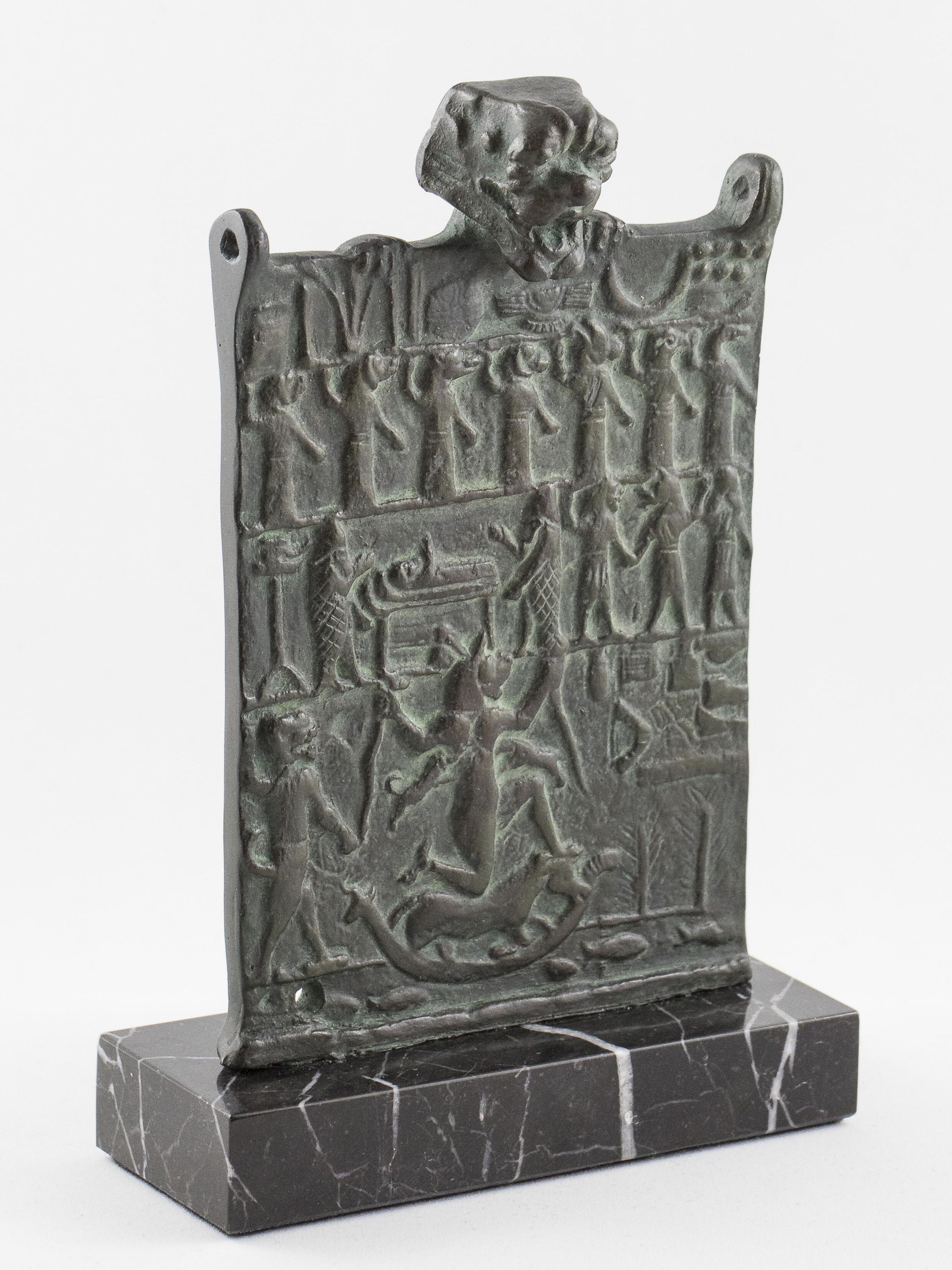 The 'Hell Plaque' is in actuality a healing plaque illustrating an exorcism of the evil demi-goddess Lamashtu. Often called "she who erases," her primary victims included pregnant women, women in labour, and young children. Lamashtu was blamed for the deaths of children and mothers, poisoning water, killing plants, and causing nightmares. She was also believed to consume the flesh and drink the blood of adult men. This plaque was used as a protective amulet and hung in the room of of sick or ailing people to ward of sickness and death caused by Lamashtu.