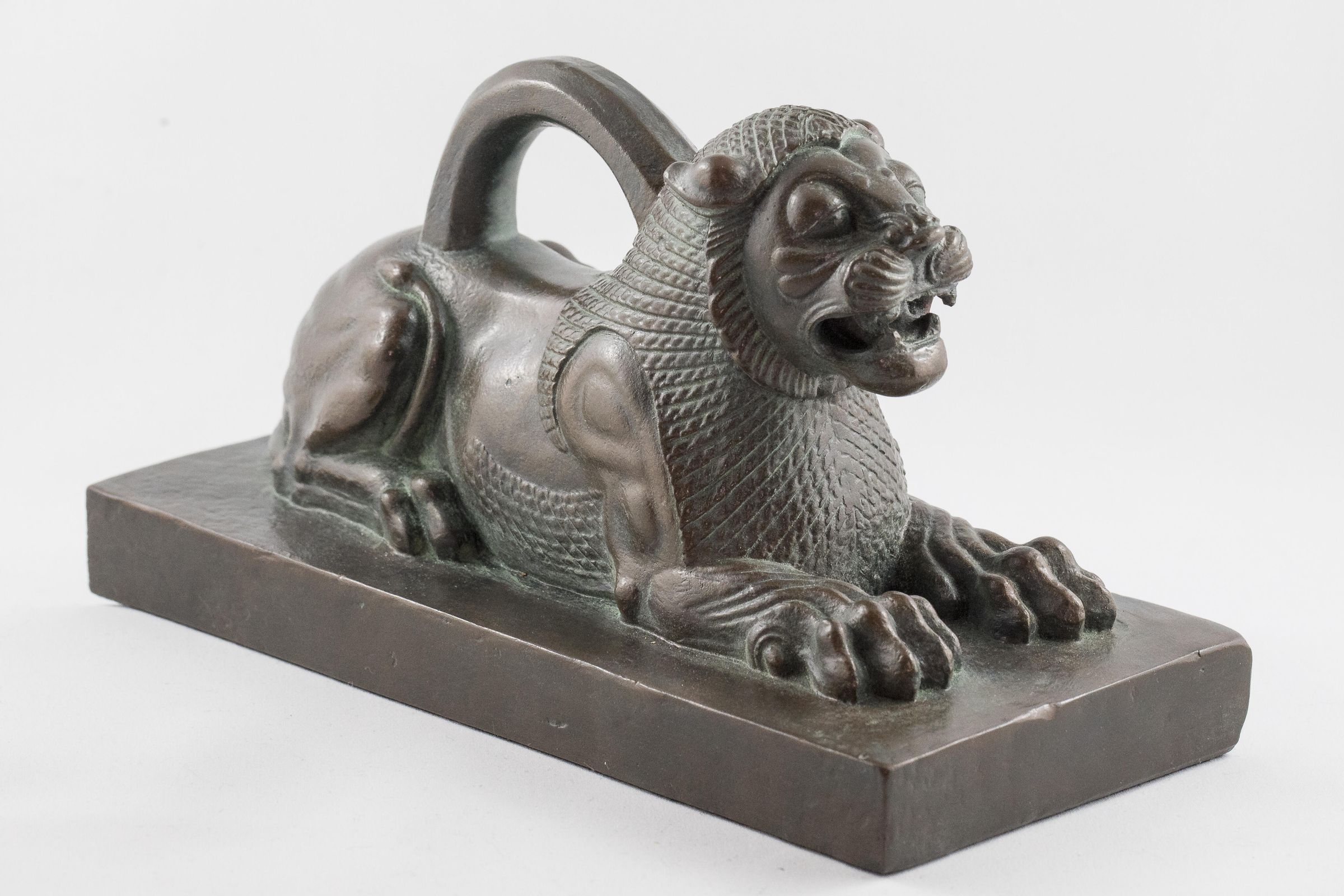 Prior to the invention of coinage, commerce involved the exchange of materials like metal scraps or ingots. Over time, several cultures of the ancient Near East began to utilize standardized metal weights. Weights, such as this bronze lion, were set on one side of a scale while the material for trade was placed on the other. The ring attached on the back of the lion allowed financiers to easily life the weight on and off the measuring scale. The original of the bronze lion was made on the occasion of the festival of Persepolis, and weighs 121 kg (267 lbs), which is equivalent to 4 talents worth of value in ancient Persia. A weight of such mass was used for large scale transactions.