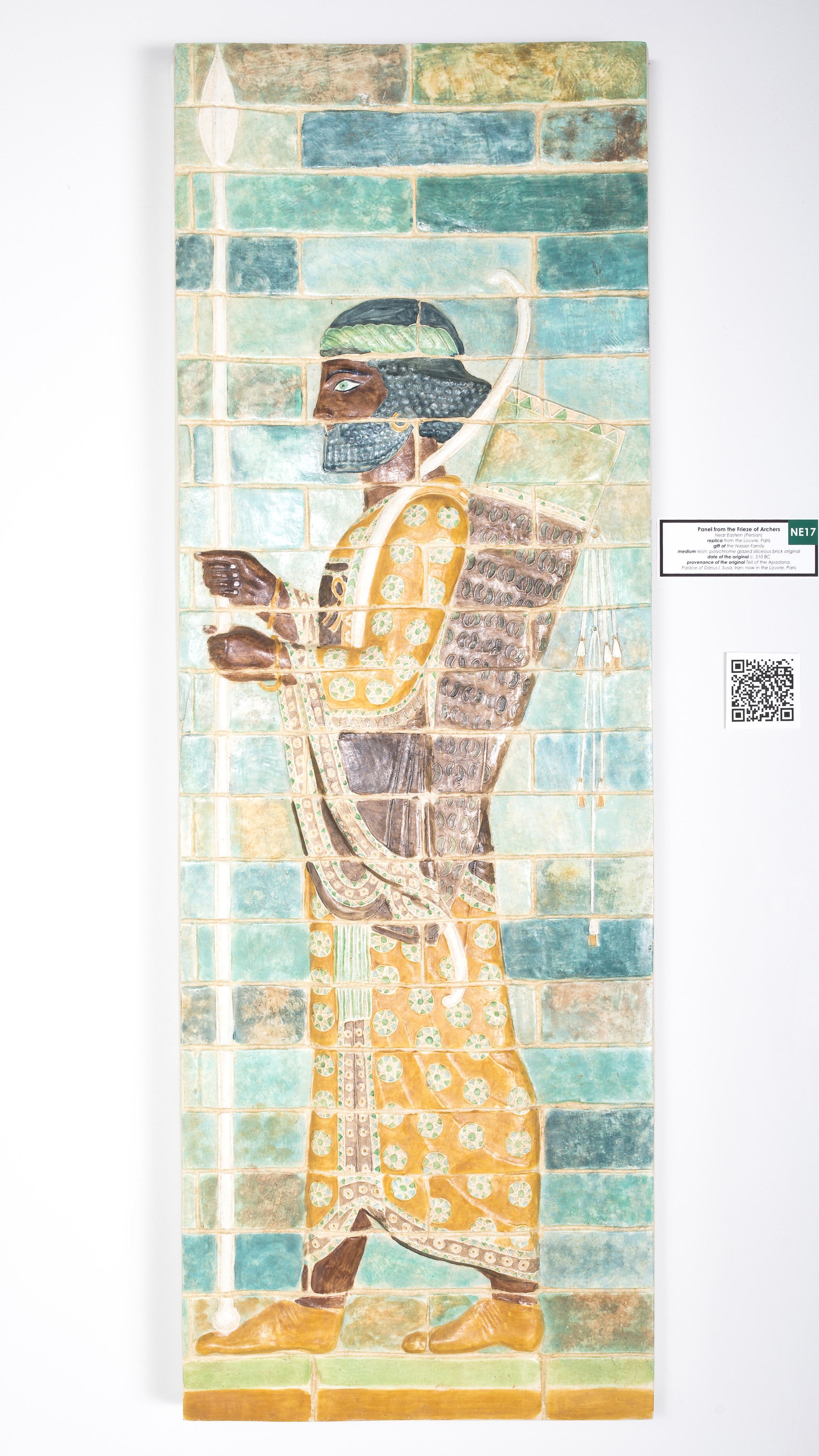 One panel from a frieze at the Palace of Darius the Great (548-486 BCE). The original location of the frieze of archers in the Palace of Darius is unknown, as the bricks and fragments were found scattered throughout the palace. The frieze displays two symmetrical lines of soldier-archers.