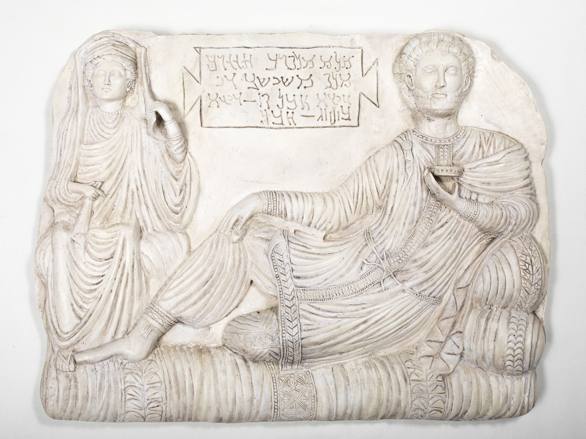 The caravan town of Palmyrene was the heart of trade between India and the Mediterranean. The image provides a wealth of information about the cosmopolitan culture of the great Palmyrene families. The inscription and his luxurious clothing, possibly imported from central Asia or Persia, are a reminder of the source of his wealth. The image of his wife provides information on her role in the family. She looked after the house but she was also familiar with the refined aspects of western life. Her jewelry shows that she had a share in the prosperity of the family. Her position in relation to her husband is also interesting. Being seated, she reaches the same height in the relief as her reclining husband, a discreet allusion to her status, though she is shown to be slightly inferior. This inferiority of status is visible by the smaller size of her portrait and her position by his feet. She was nonetheless respected and occupies a dignified position beside her husband. Banqueting in a reclining position is a practice of the Greco-Roman world, which gained a funerary significance in Palmyra.Made/Created