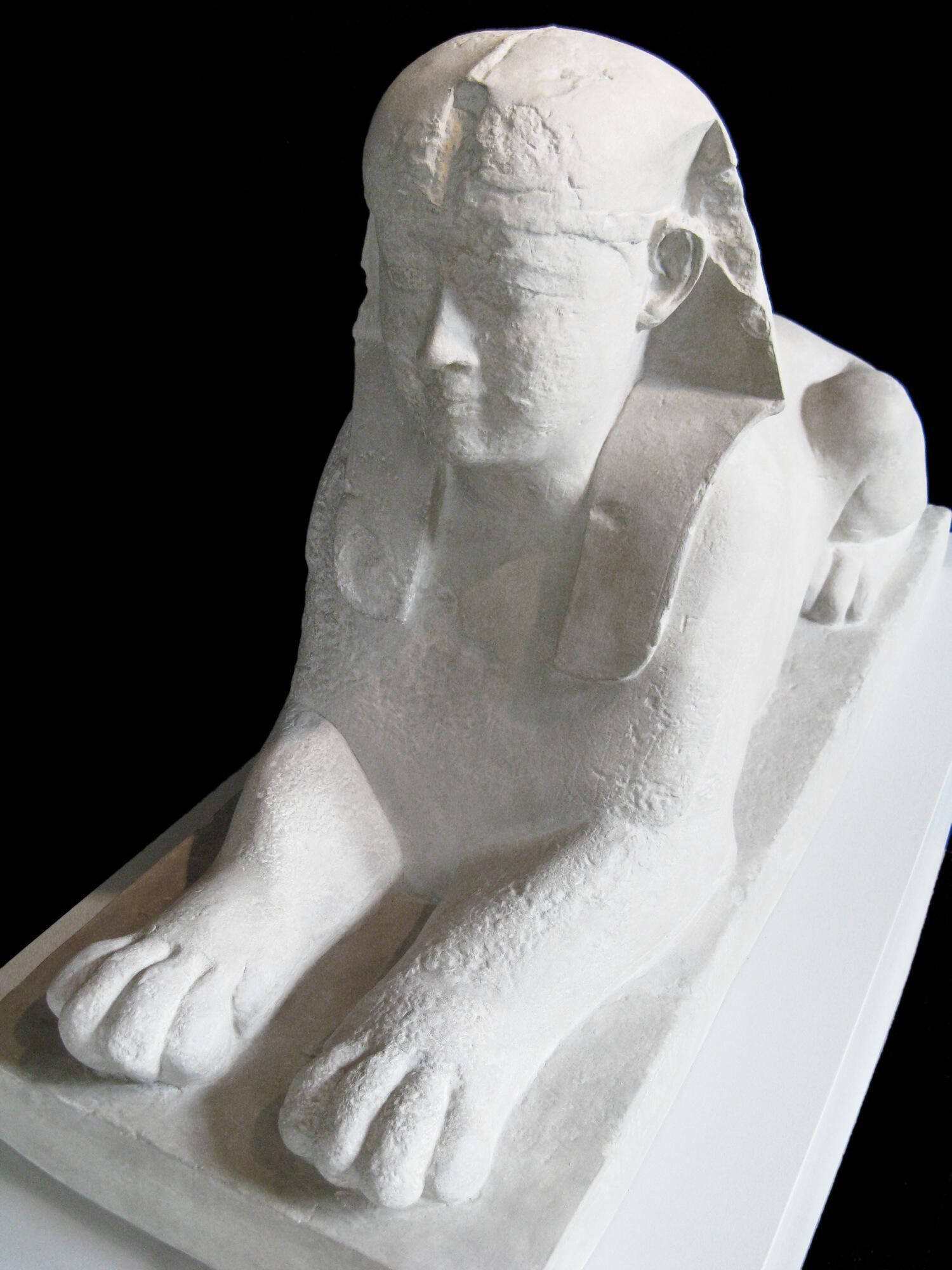 Reclining sphinx. The body is of a lion and it is in resting position. The head is pharaonic and is looking forward.Type of Sculpture