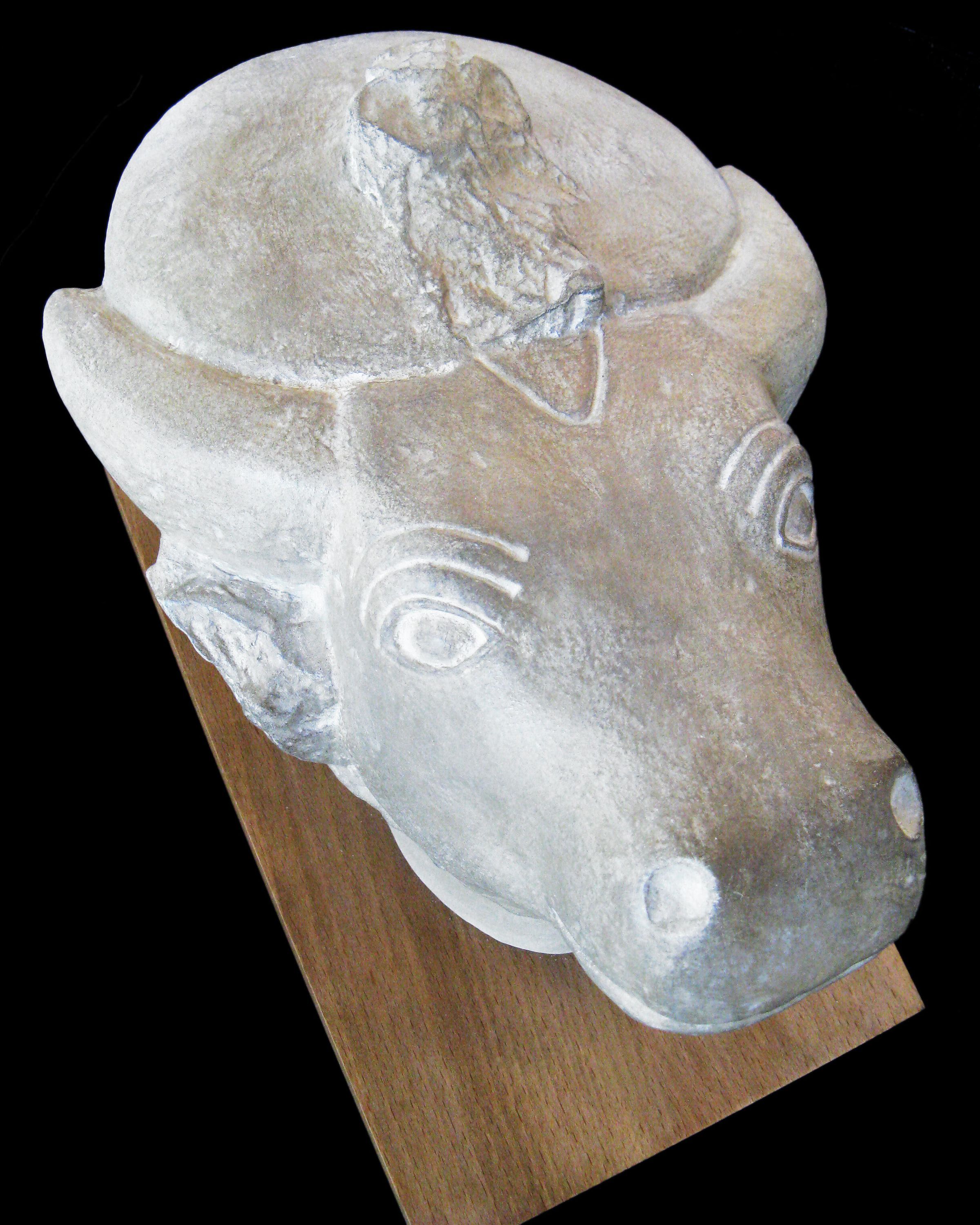 It's a bull's head and there is a round disc on the top of the head in between two horns. There is a triangle attached to the bottom of the disc between the horns. There is two lines above the eyes inline with the ears. The head is mounted on a wooden board.Type of Sculpture