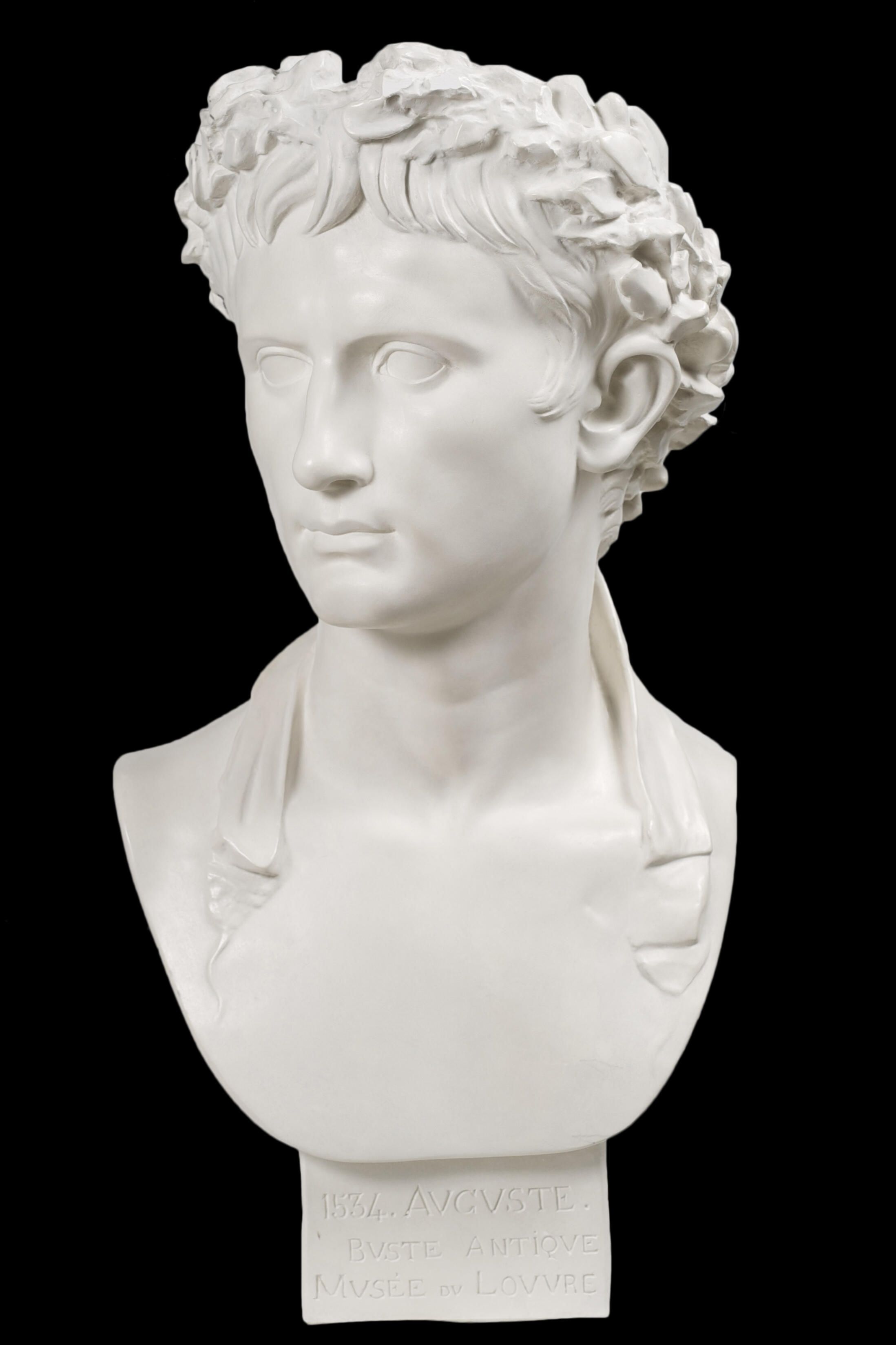 This plaster replica of an ancient Roman bust depicts the Roman Emperor Augustus wearing the laurel crown of a Roman statesman. Augustus is depicted in a youthful, Apollo-like image which was common in busts and statues of the emperor.Type of Sculpture