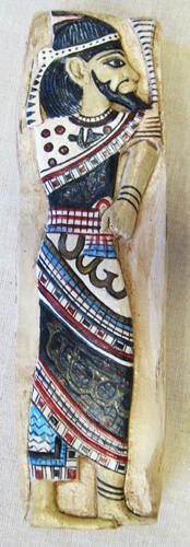 Rectangular tile on which a figure stands facing left with their left foot forward and left arm crossed downwards across his body. He has a pointed beard and wears a head piece, has brown skin and wears long decorated robes.Type of Sculpture