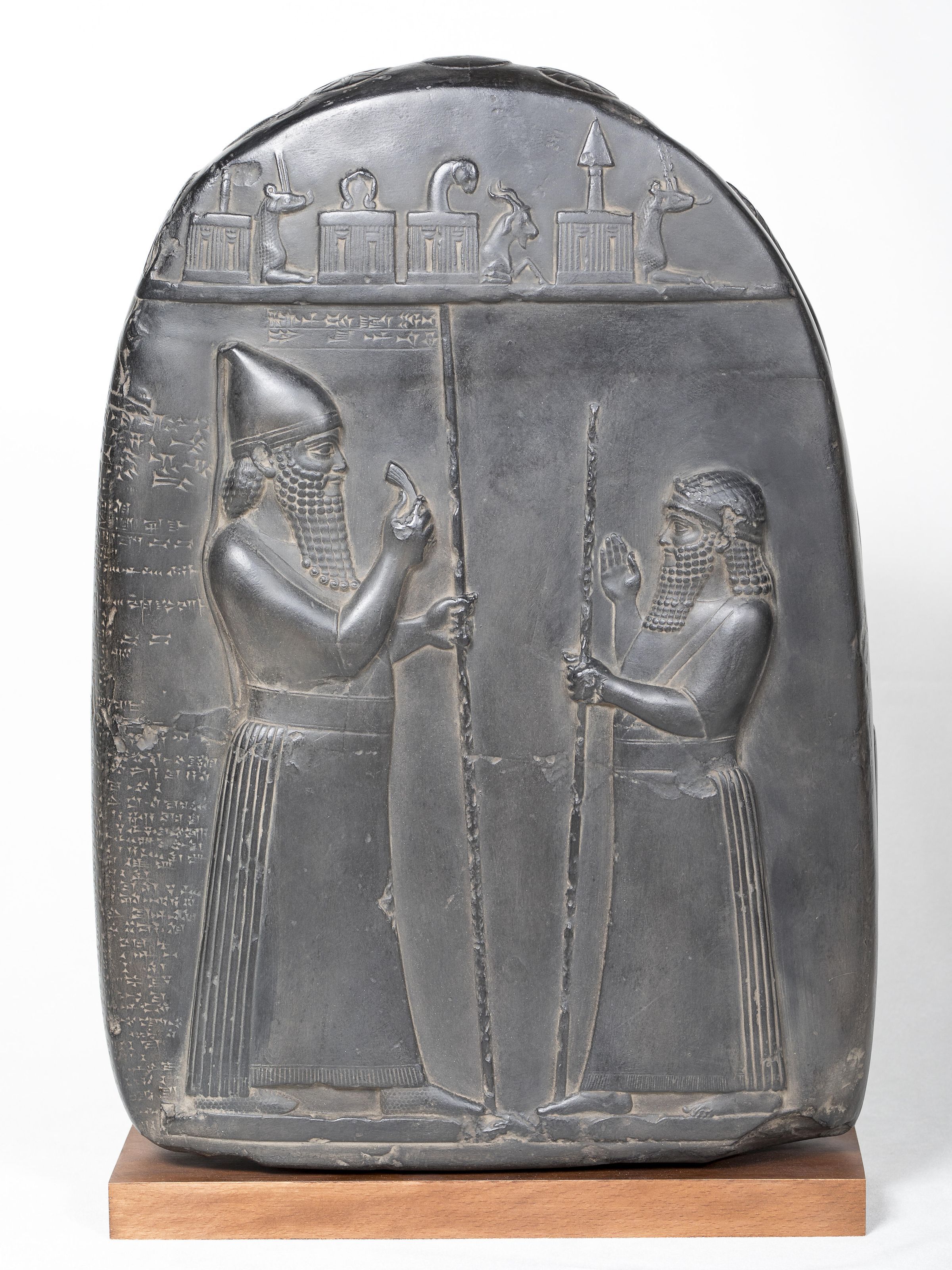 Stone deed with Inculcation ceremony (a legal agreement). Sculpture in the round. The front consists of two men, one with a crown, standing facing each other. Various anamorphic gods rest on a register above the men. Cuneiform writing on the back and sides of the relief.Type of Sculpture