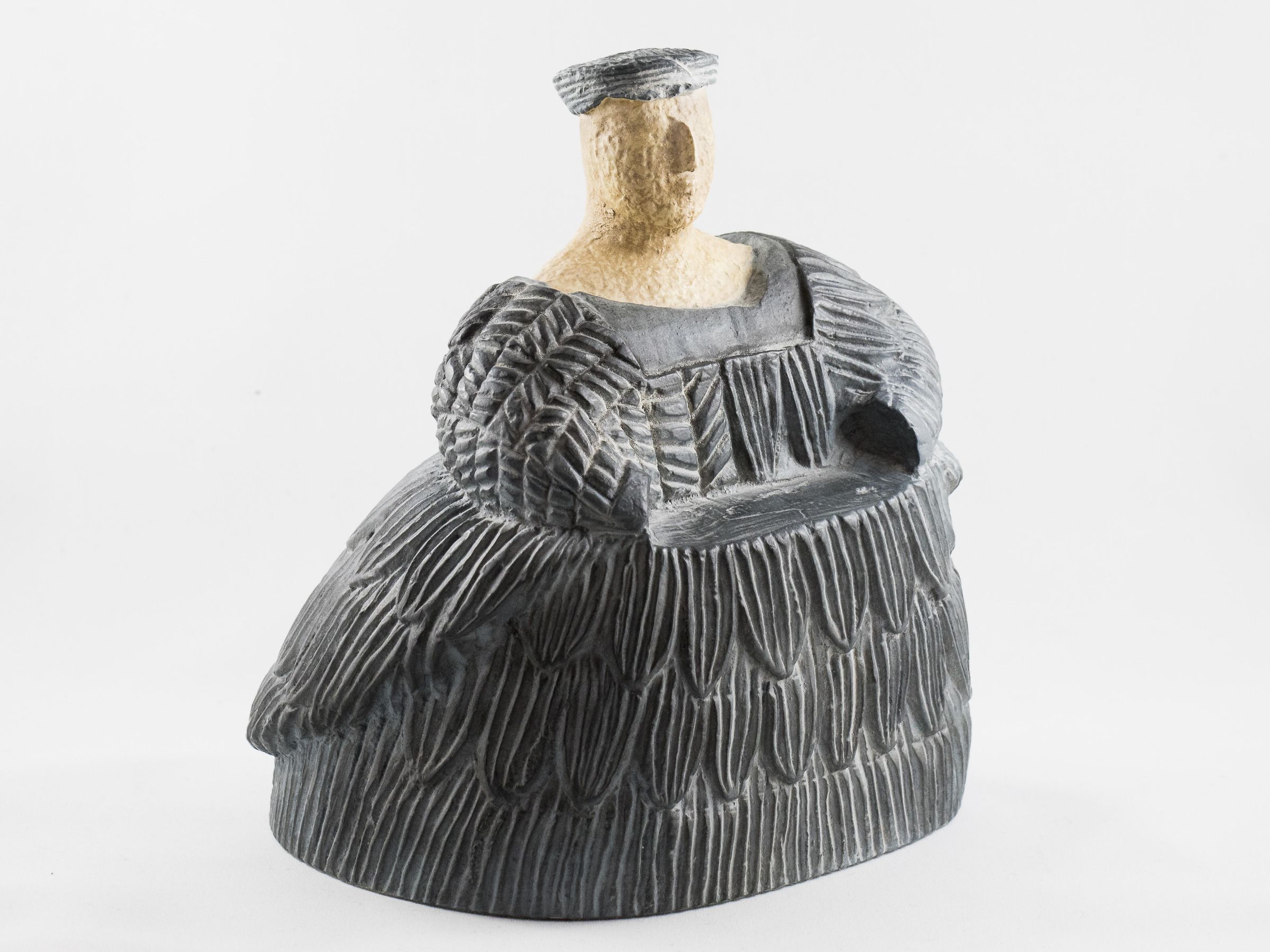 While most “Bactrian princesses” are depicted seated, this one is shown standing and is a slightly larger size than the others. Her dress is quite striking and full, sculpted from greenish-grey steatite and represents a kaunakes, a Sumerian style of skirt made of tufts of wool, here having the appearance of leaves. It has been speculated that these objects represent a female divinity, although no definitive proof has been found to support this claim.Made/Created