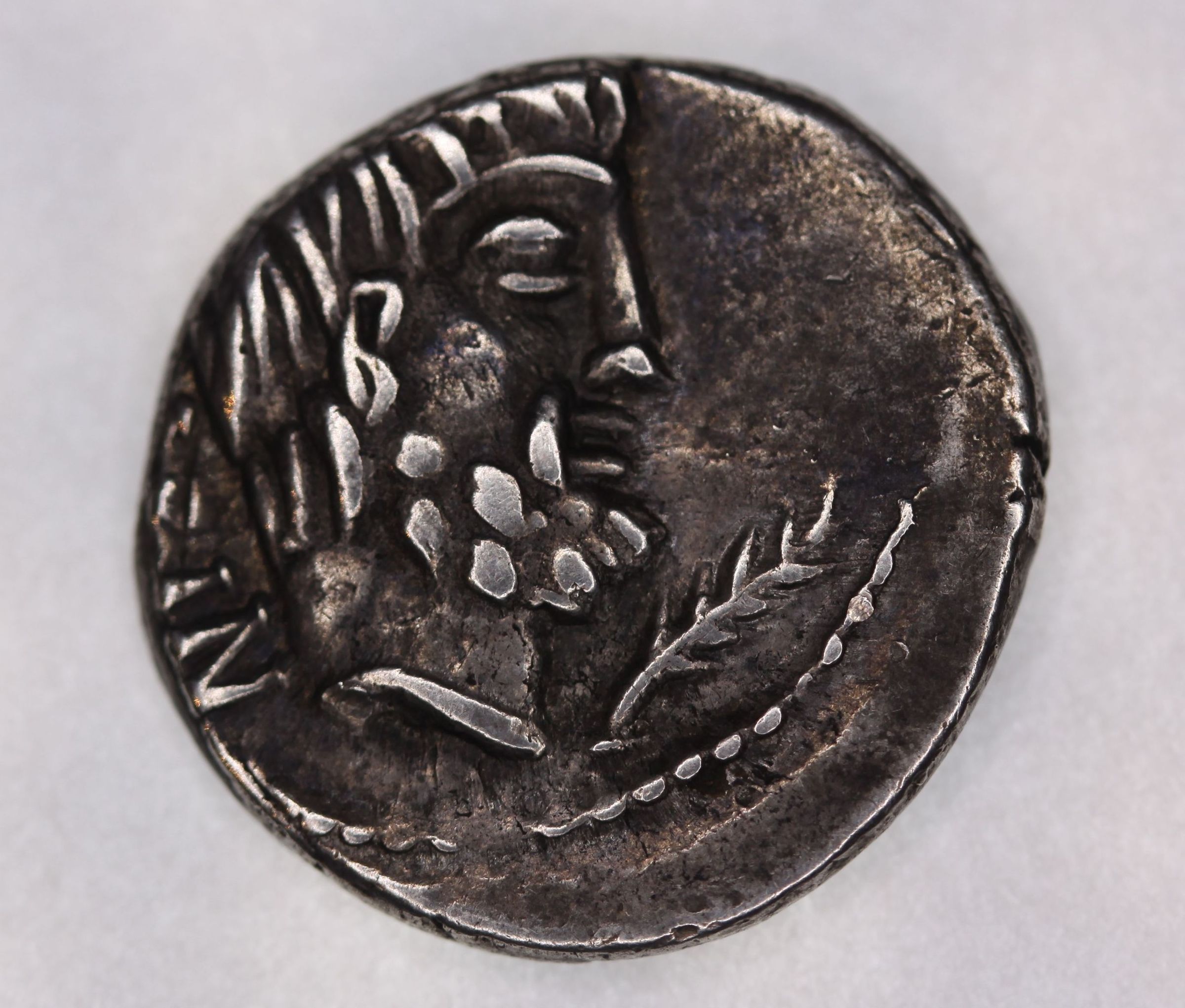 Head of King Tatius bearded, right, palm branch to right. Border of dots.