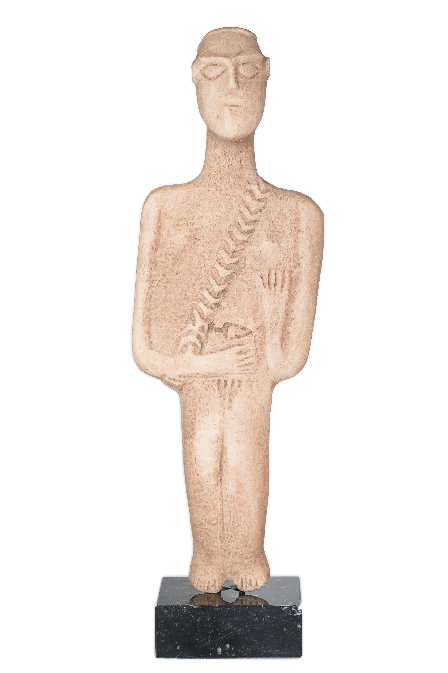 Marked with the attributes of hunters or warriors (baldric, dagger), this figurine is a replica of one of eleven-known similar figures found in burials on the Cyclades, the series of Aegean islands off the southeastern coast of Greece. Dated to the later years of the Early Cycladic II (Keros-Syros) Period (2700-2400/2300 BCE) based on stylistic considerations. Like this one, each has bulky dimensions, crudely rendered facial features, and arms raised across the chest rather than horizontal at the waist. In comparison, artifacts associated with the beginning of the Early Cycladic II period demonstrate a careful attention to proportion and form that this figurine and those like it lack. Despite their lack of refinement, it is possible that these figurines represent attempts by Cycladic artists at representing the human form naturalistically. The originals of this and the other hunter-warrior figures are housed in the Museum of Cycladic Art in Athens.Collection